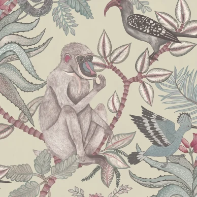 Bladtapeten Acacia med apor som klättrar bland täta acacia-blad är charmig och rolig. Mönstret bildar breda ränder. Tapeten passar i vardagsrummet, barnrummet eller varför inte hemmakontoret.