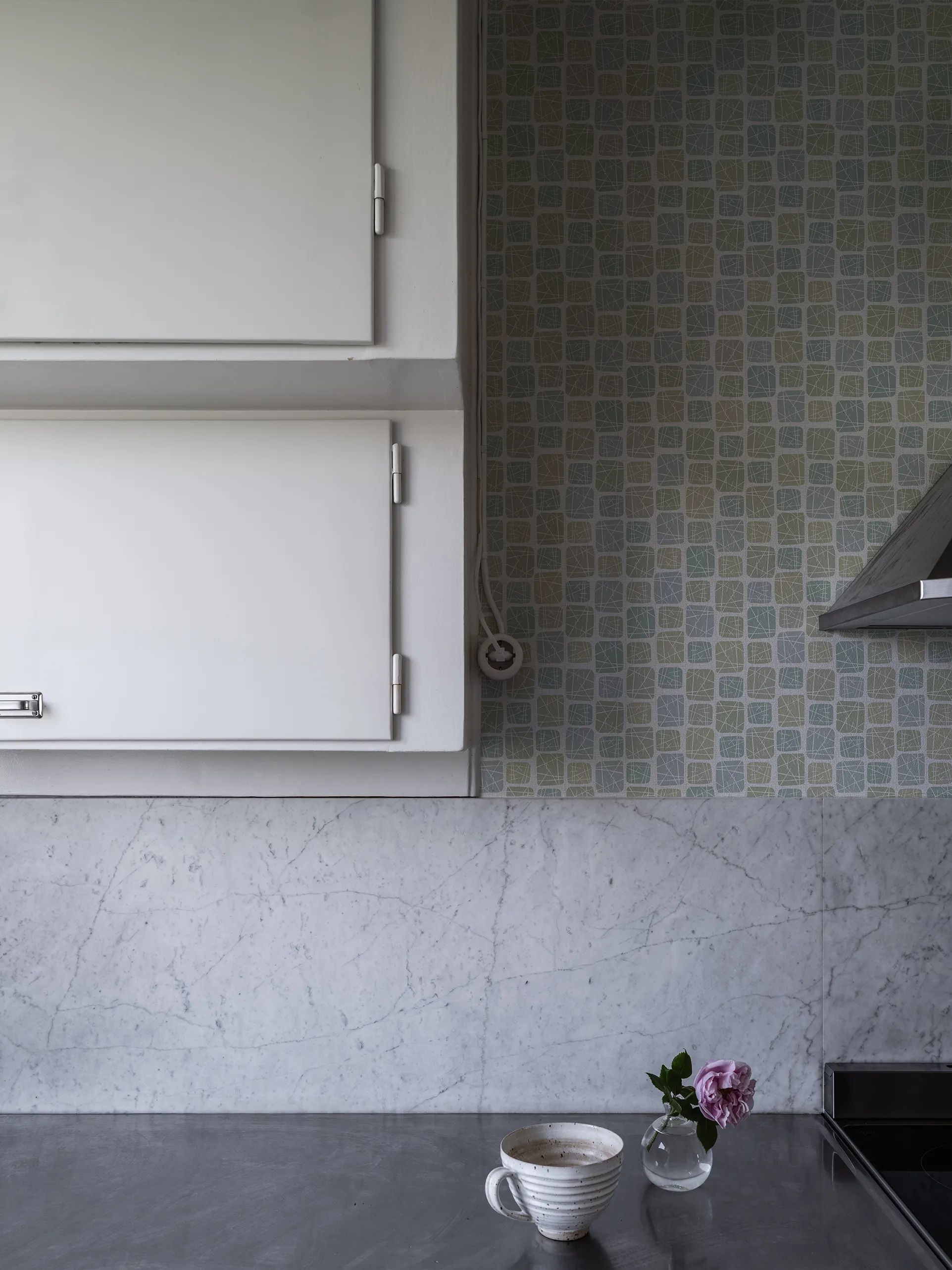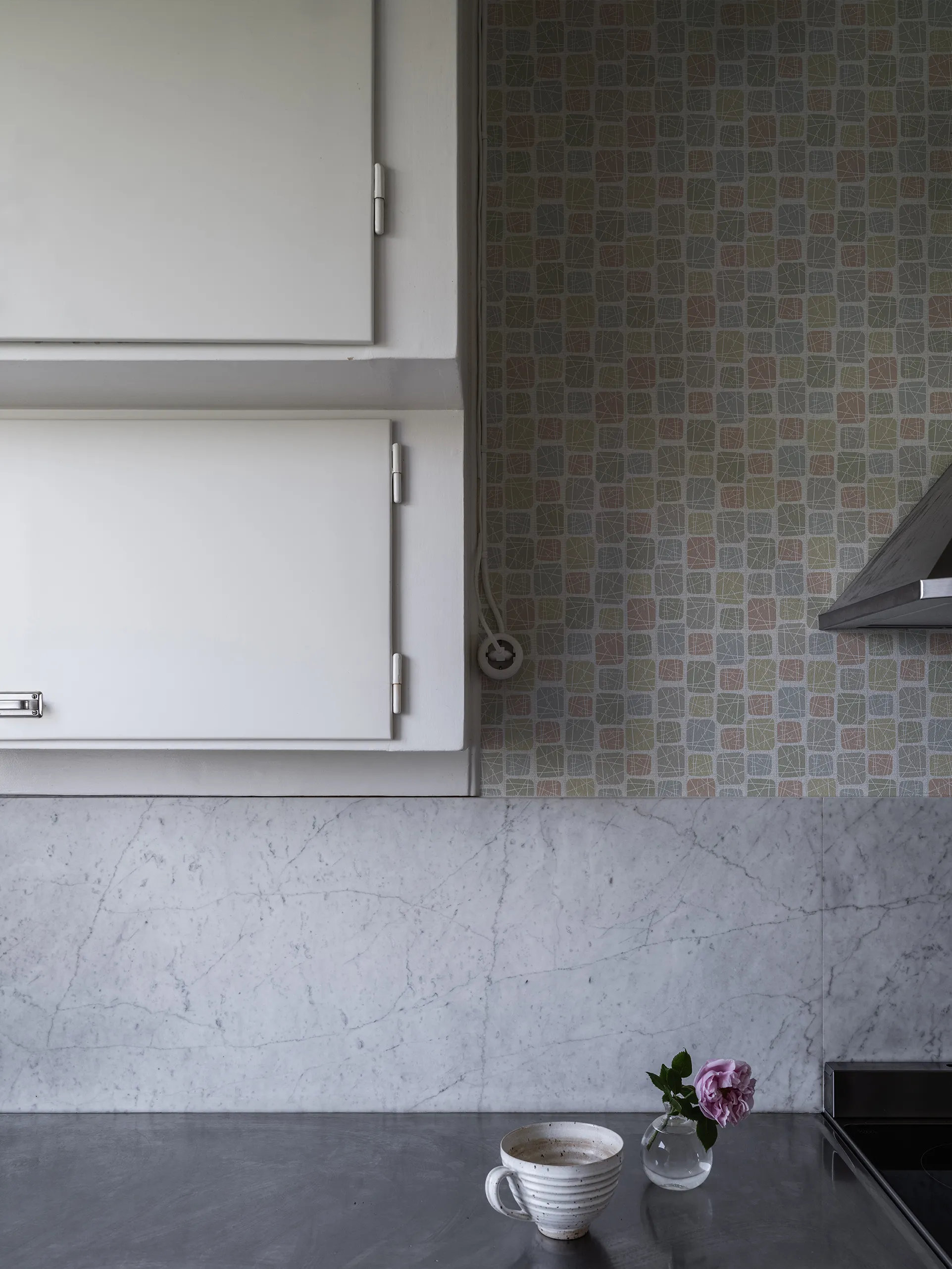 Duros geometriska tapet Annika har ett tätt rutigt mönster. Tapeten kommer från 1950-talet och är både minimalistisk och formstark. Non woven-tapeten passar bra i hem med klassisk inredningsstil.