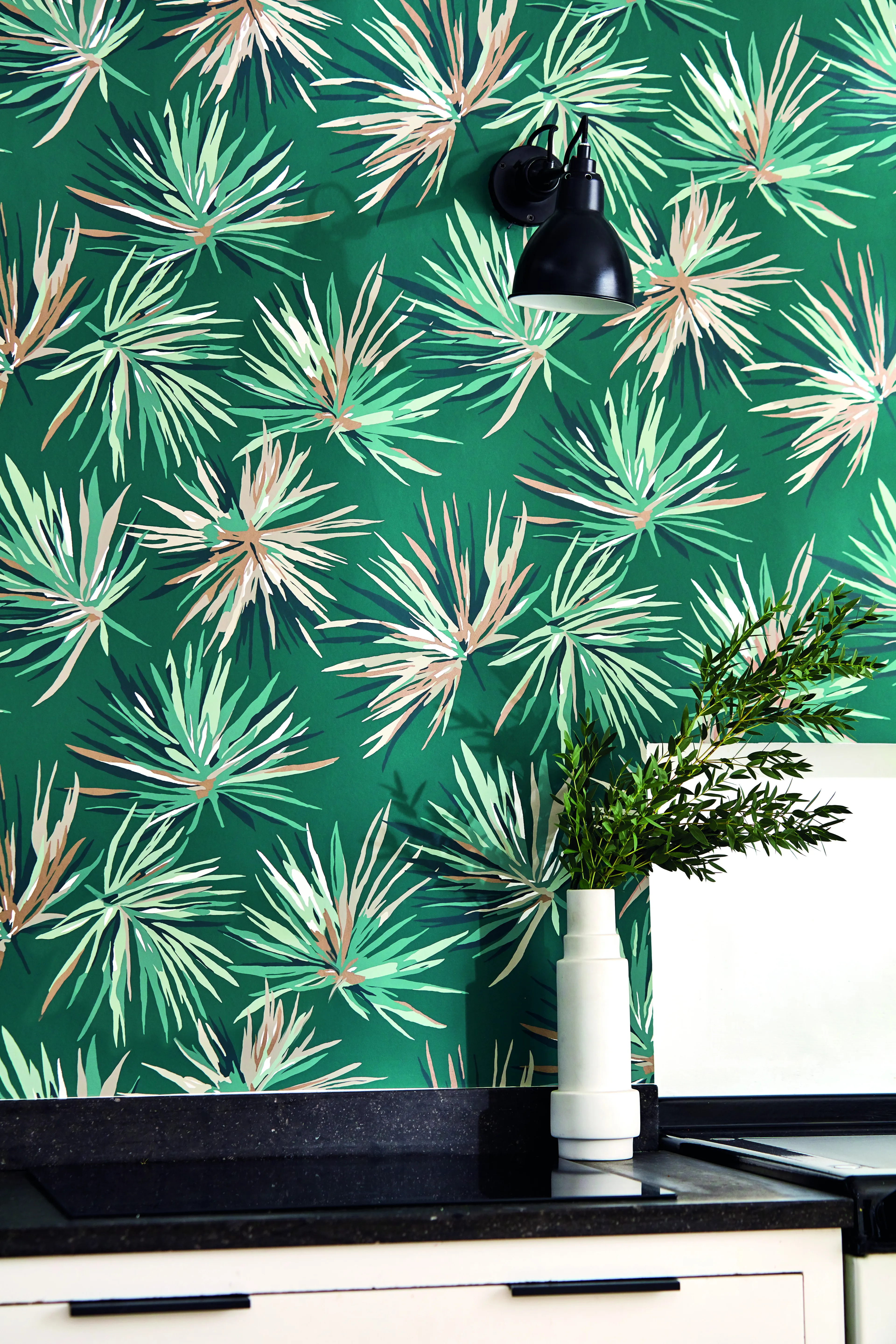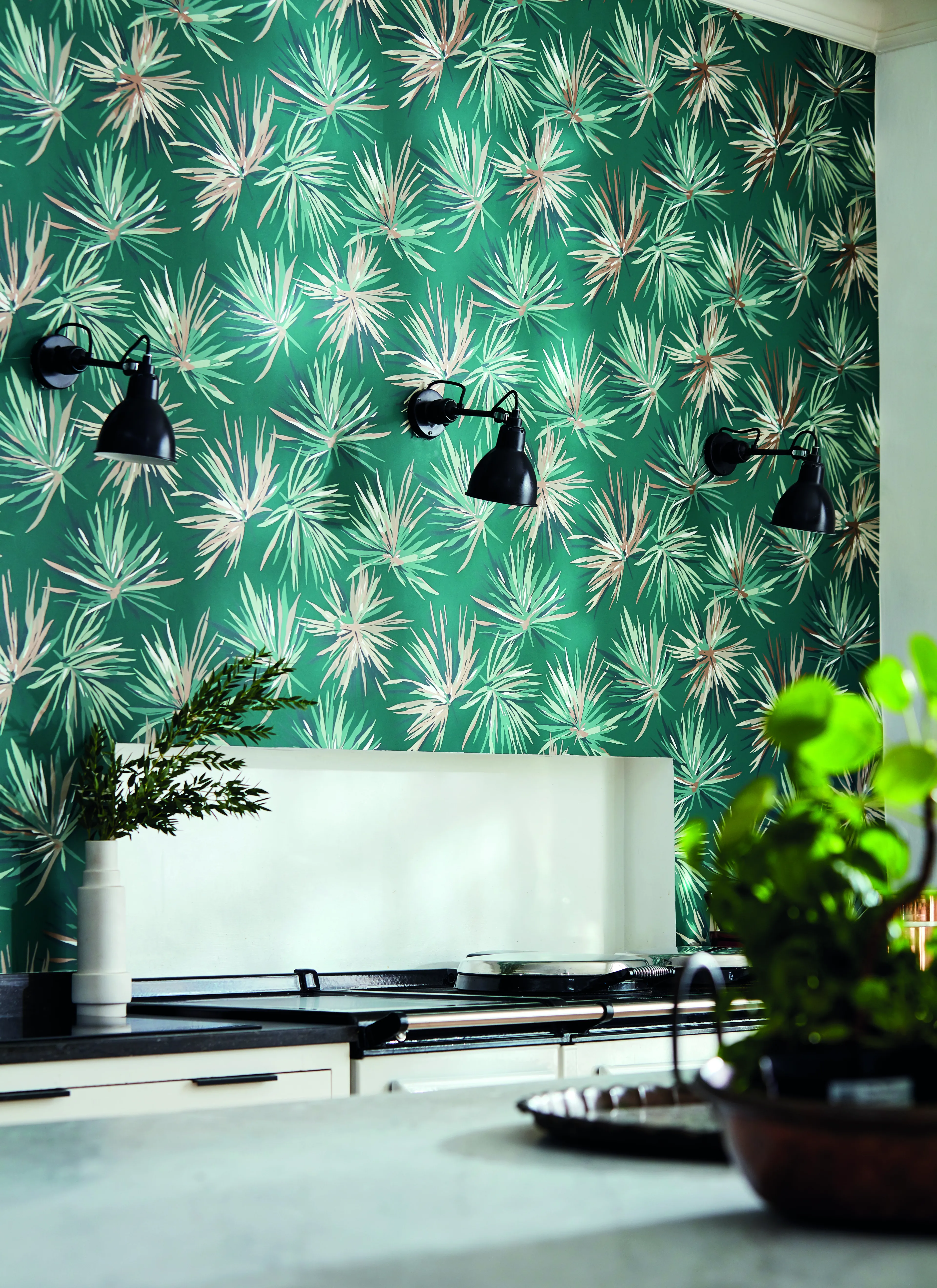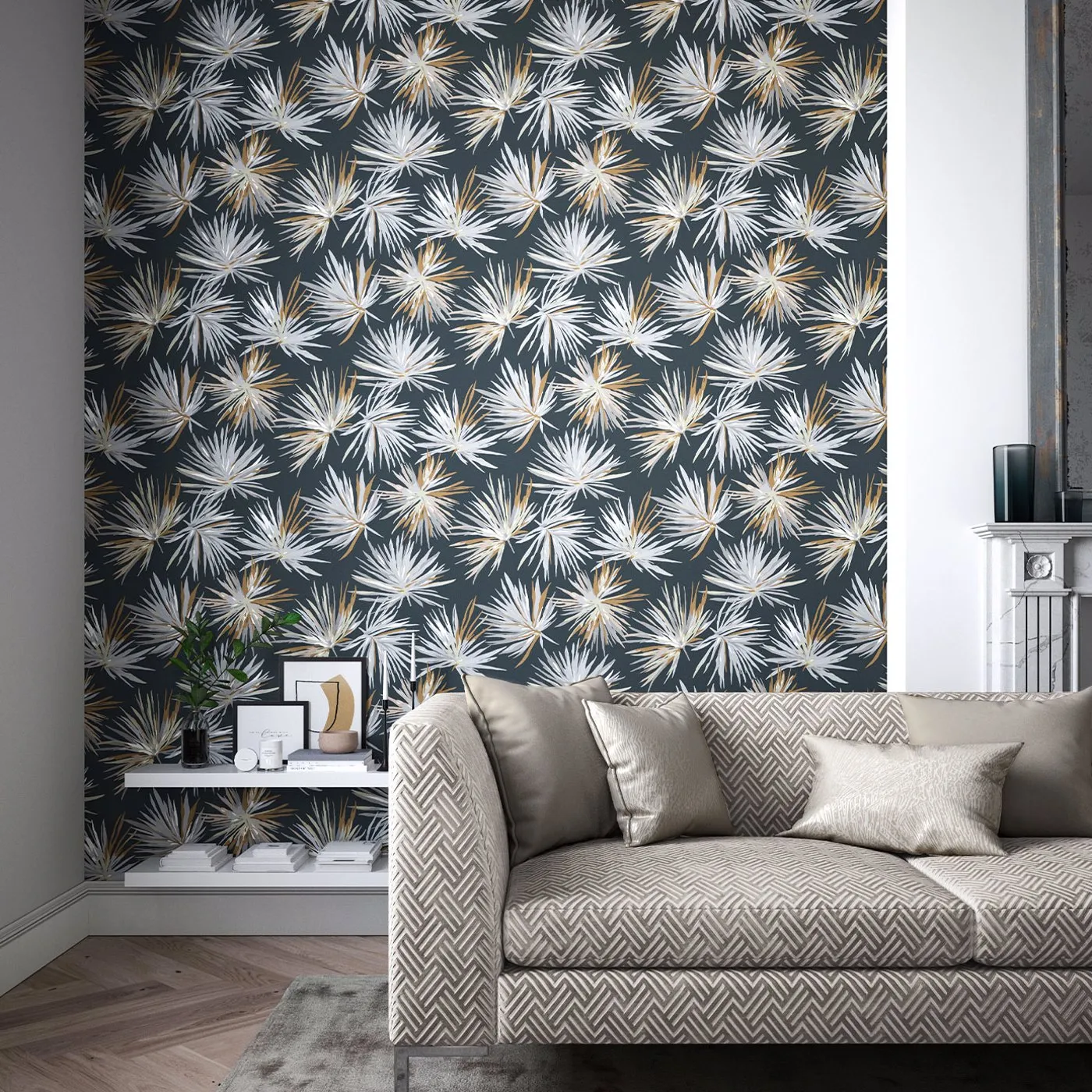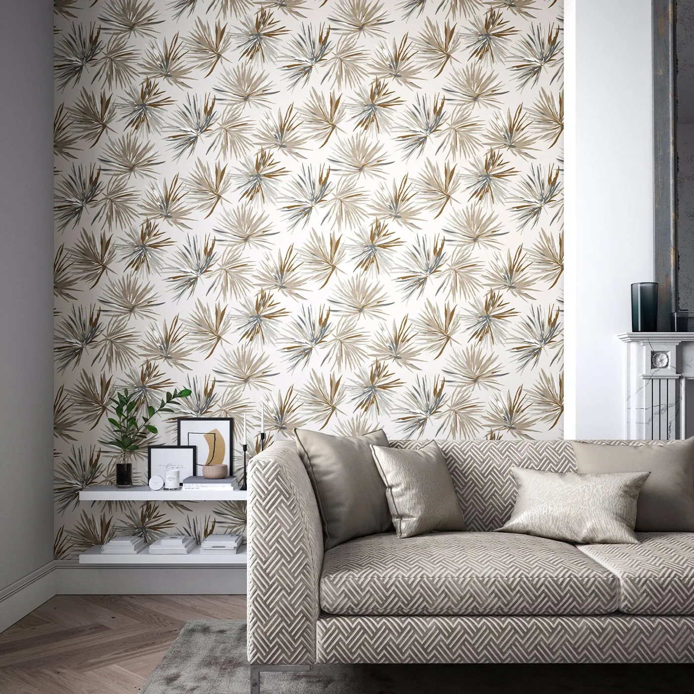 Grafiska tapeten Aucuba har ett levande mönster av flikiga blommor. Tapeterna har detaljer i metallfärg. En fin tapet i vardagsrummet, hemmakontoret eller matsalen.