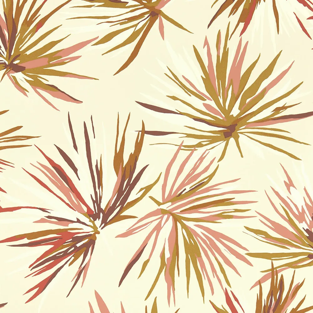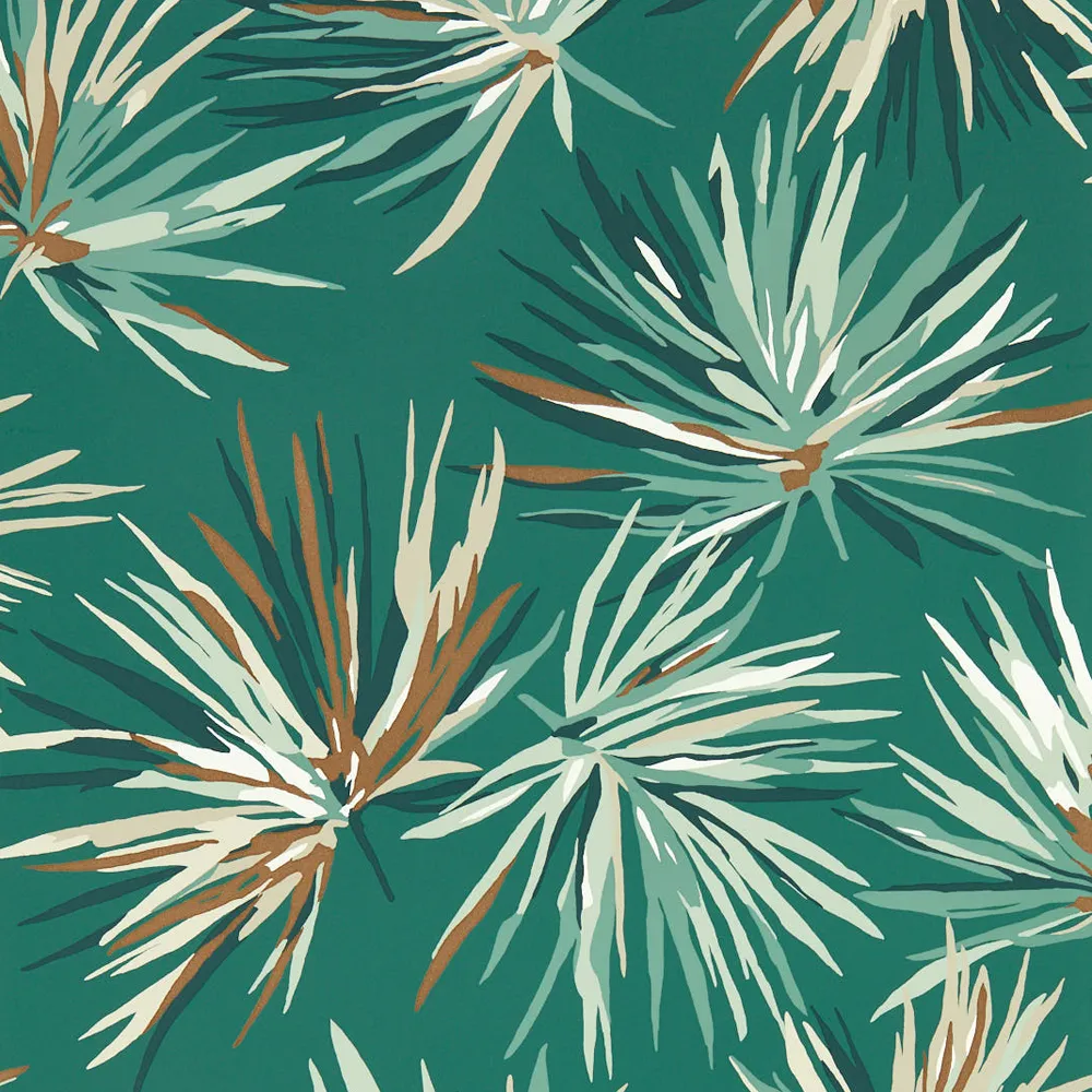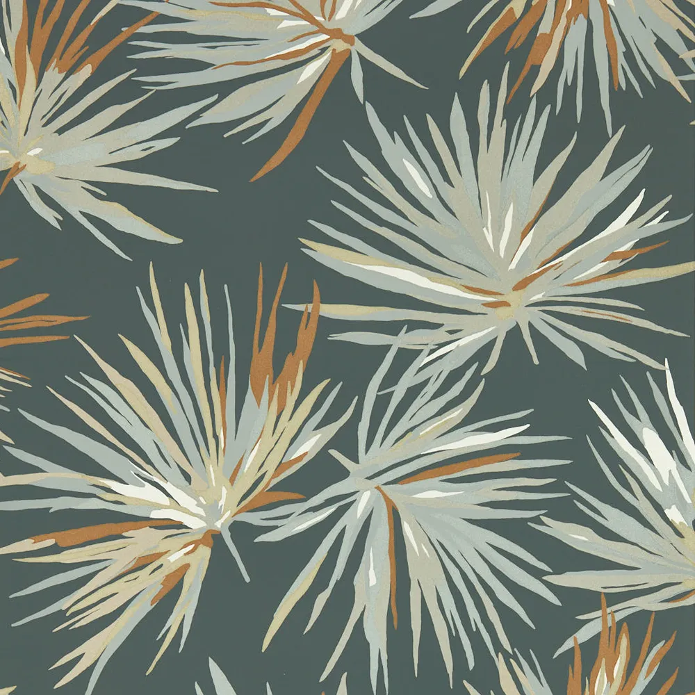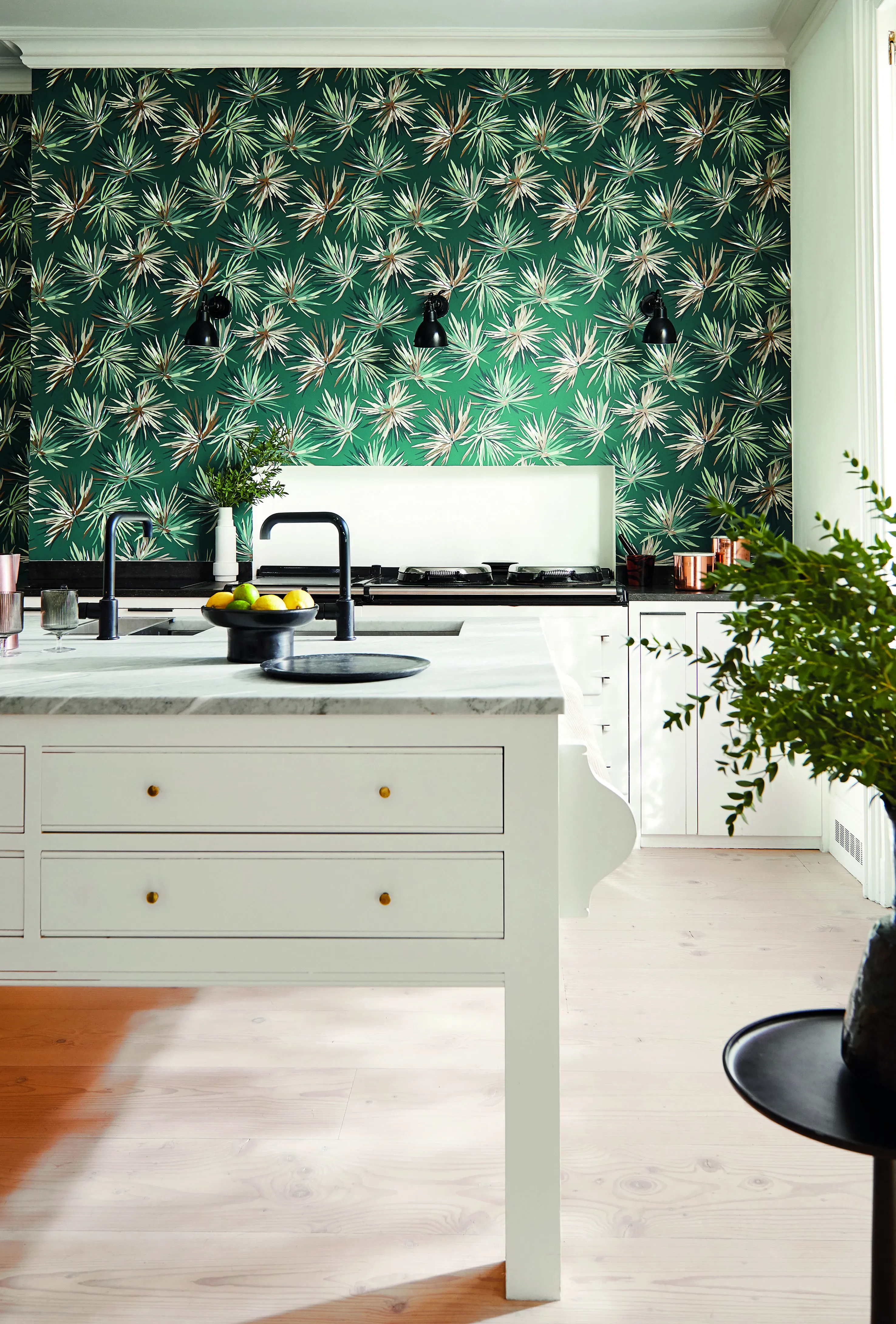 Grafiska tapeten Aucuba har ett levande mönster av flikiga blommor. Tapeterna har detaljer i metallfärg. En fin tapet i vardagsrummet, hemmakontoret eller matsalen.