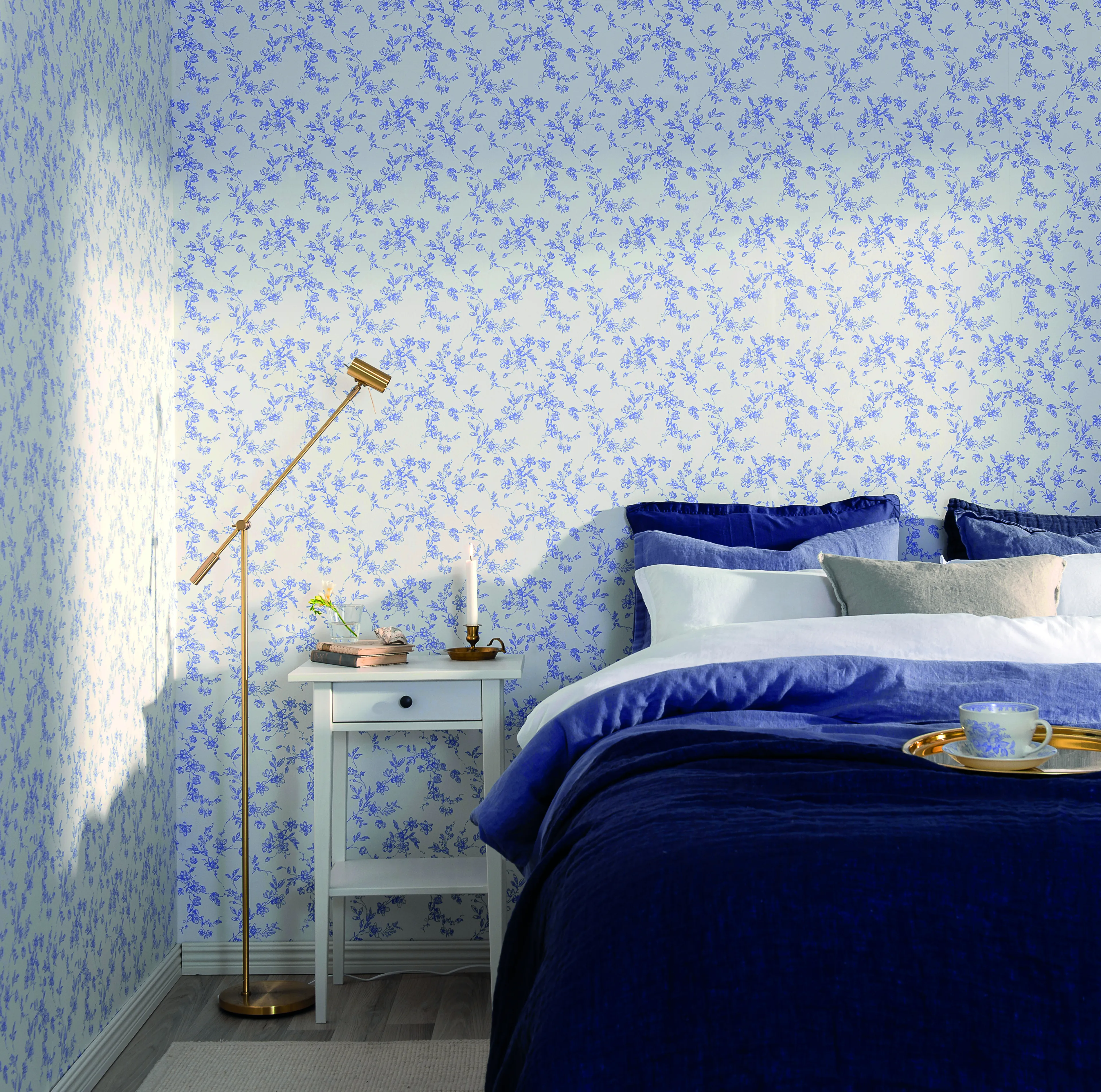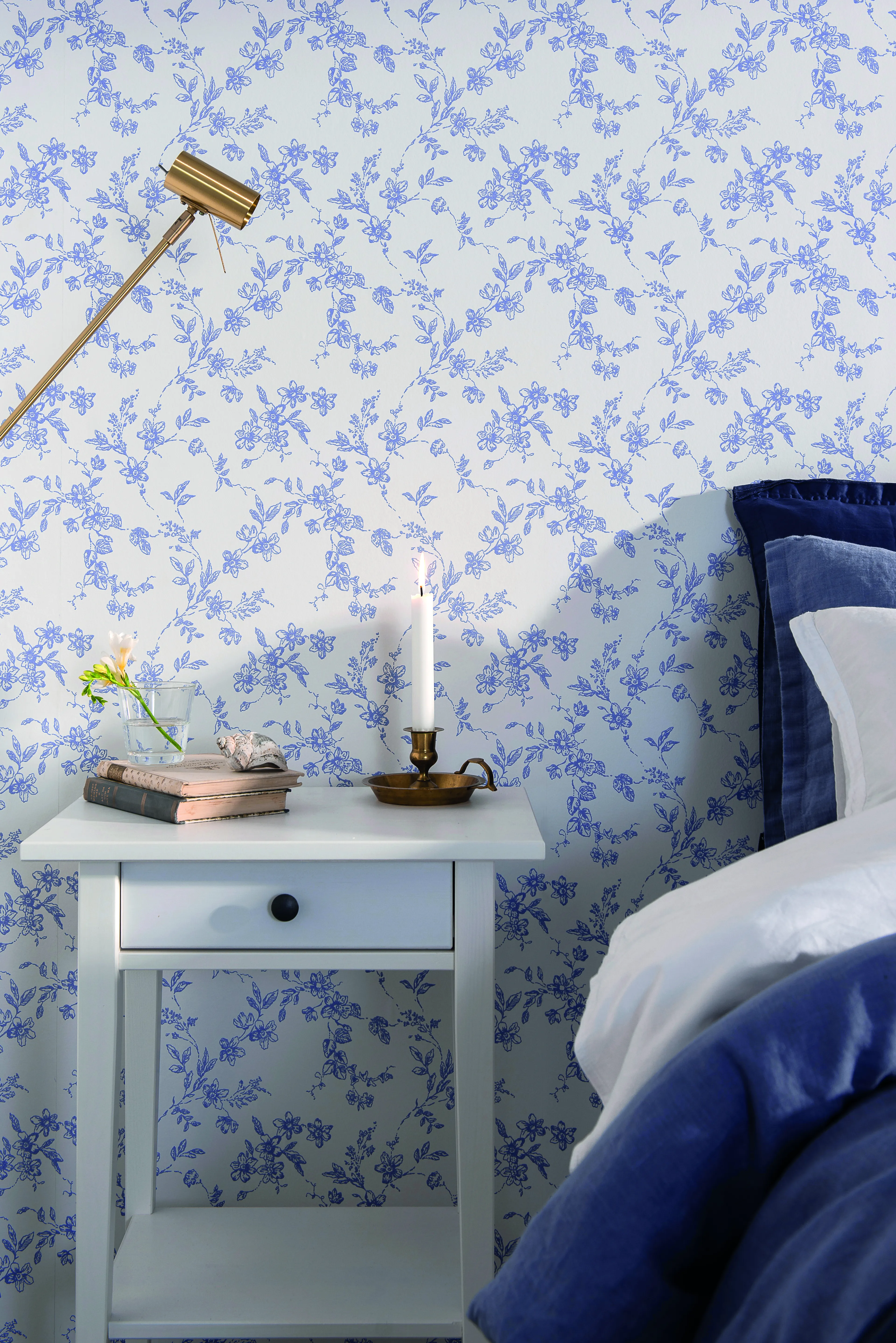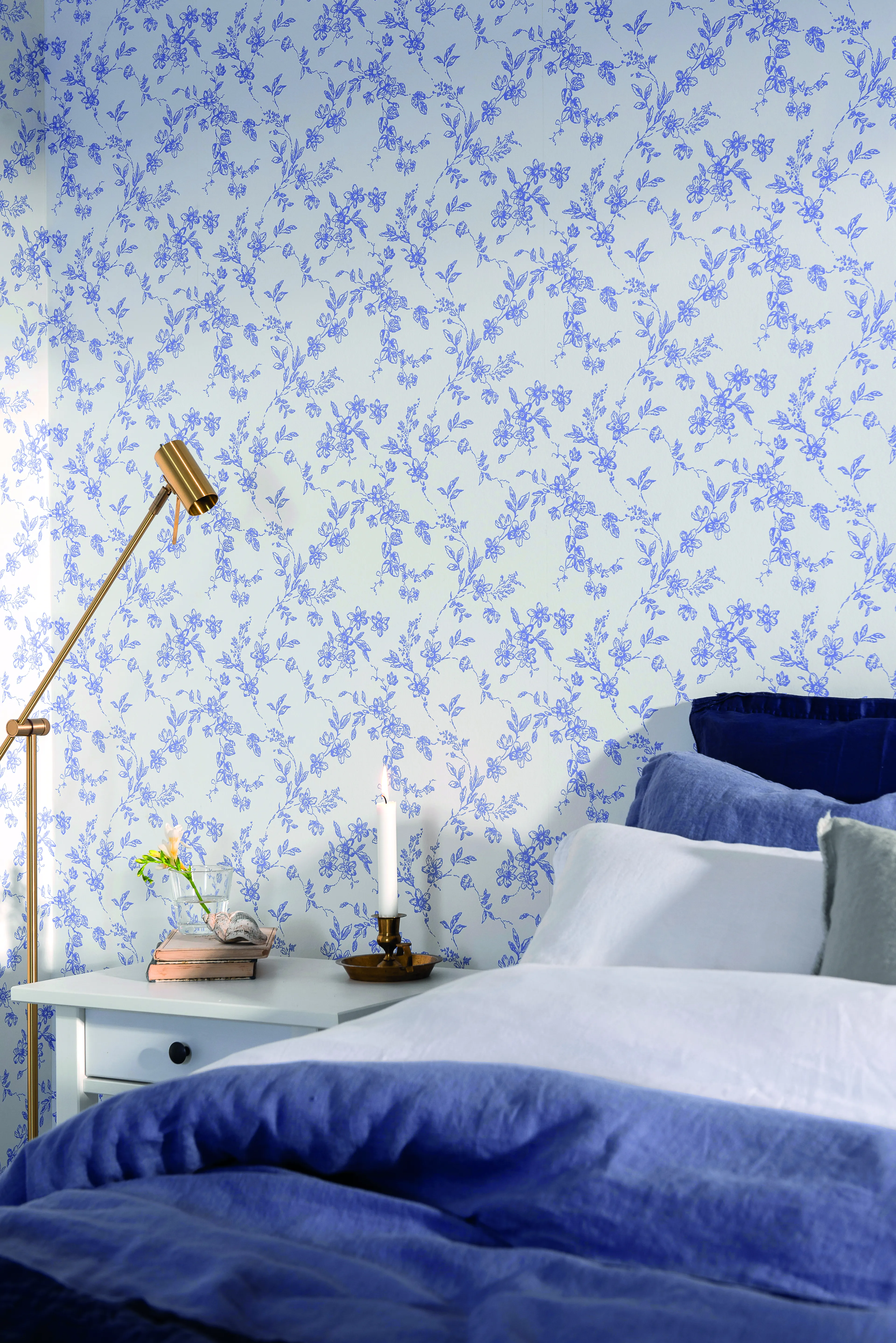 Duros blomtapet Bella har ett slingrande blommigt mönster som är inspirerat av blåblommigt porslin. En fin non woven-tapet som passar skandinavisk inredning, till exempel som sovrumstapet eller vardagsrumstapet.