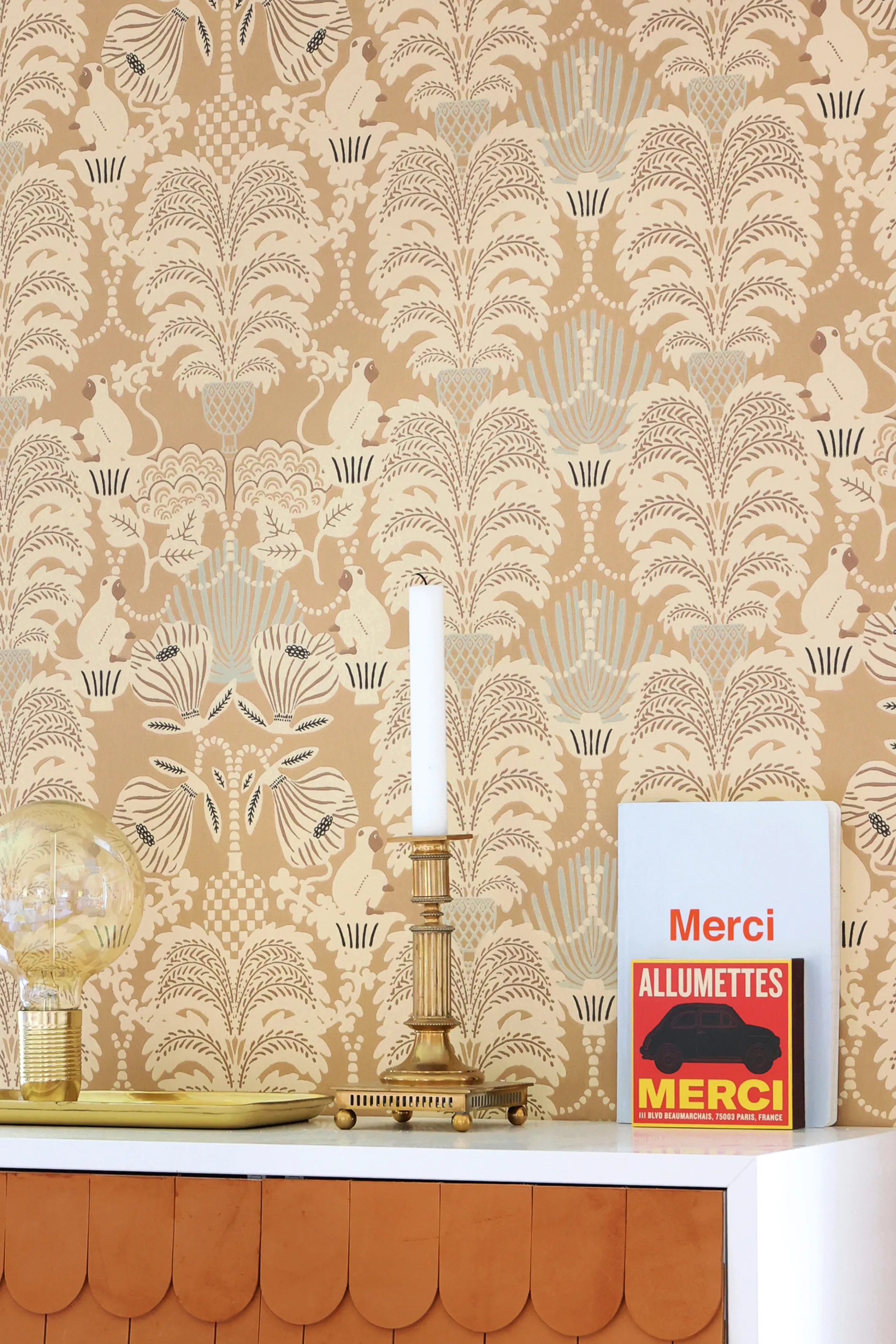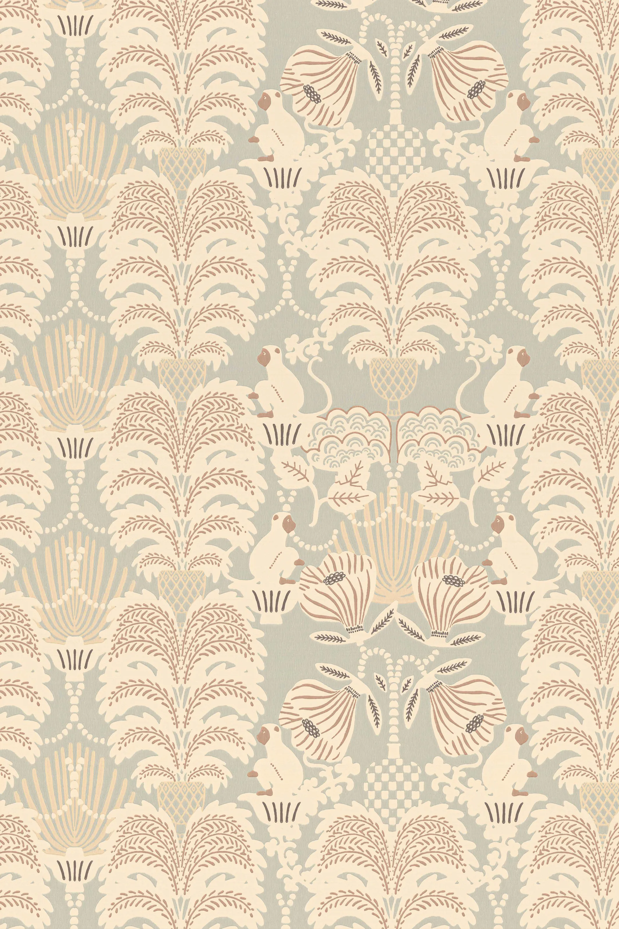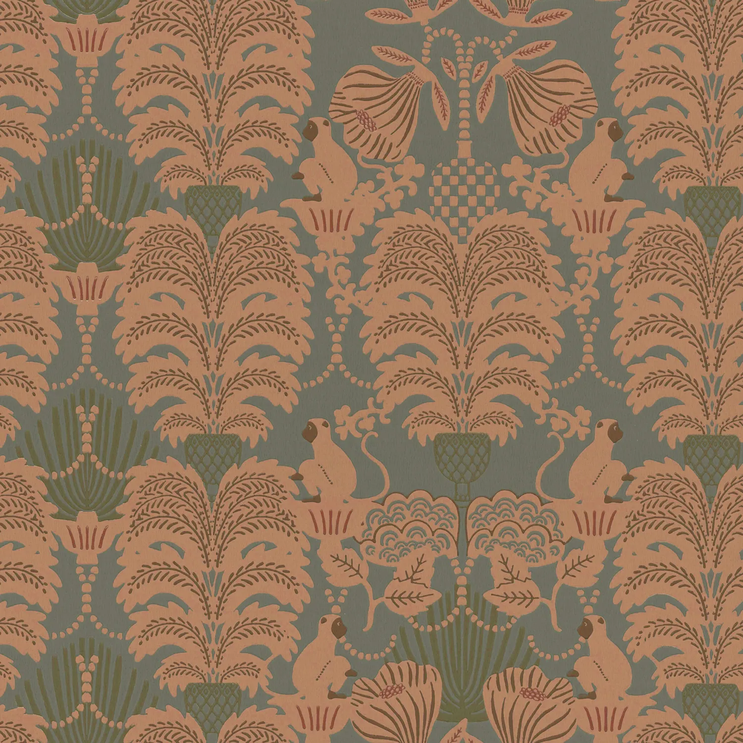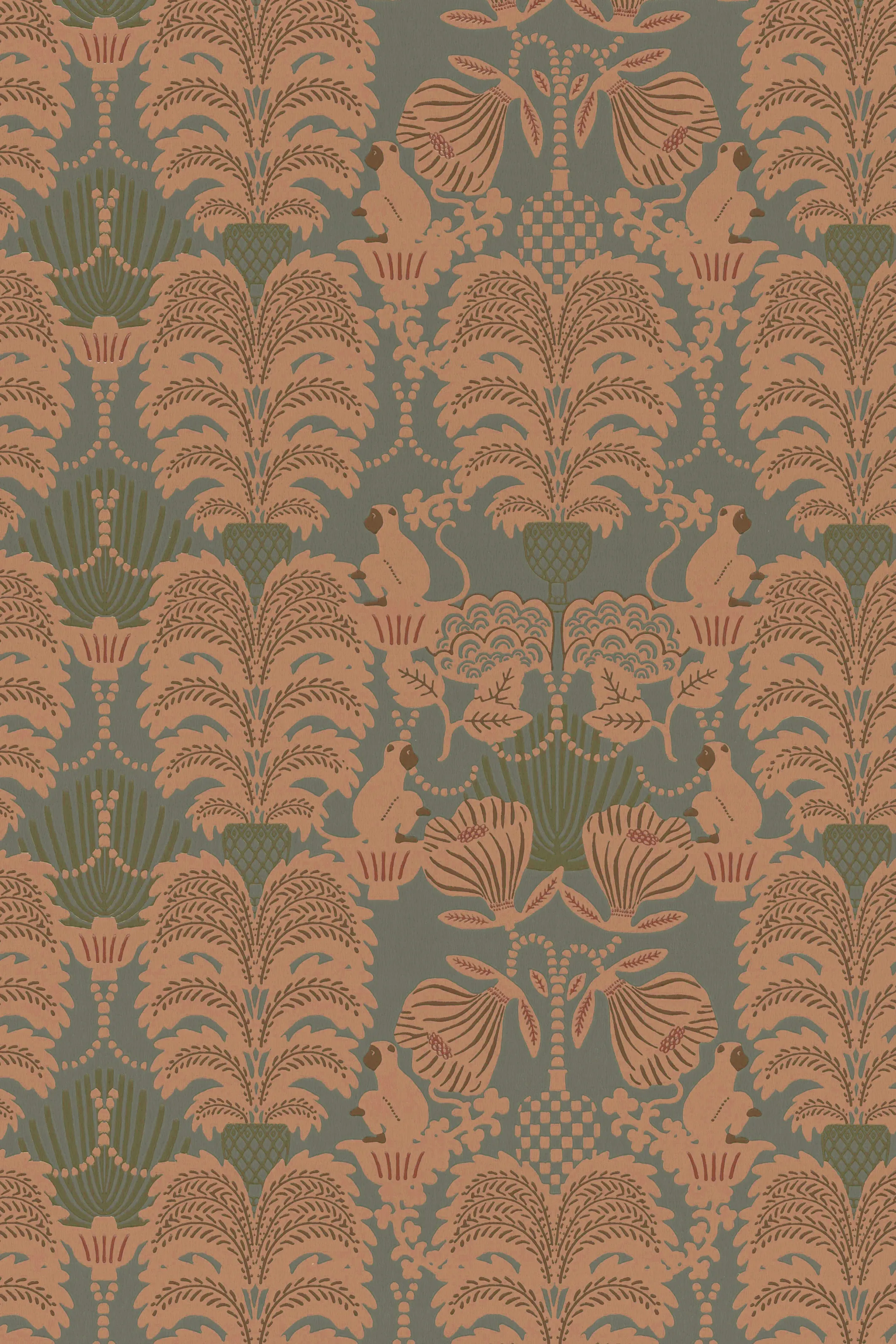 Majvillans Hello Monkey-tapet förenar klassisk elegans med lekfull livsglädje. Mönstret visar stiliserade palmer, frodiga bladformer och nyfikna apor som sitter bland växterna som en naturlig del av helheten. Den symmetriska, handritade rytmen ger tapeten en harmonisk och berättande känsla som tilltalar både barn och vuxna.
