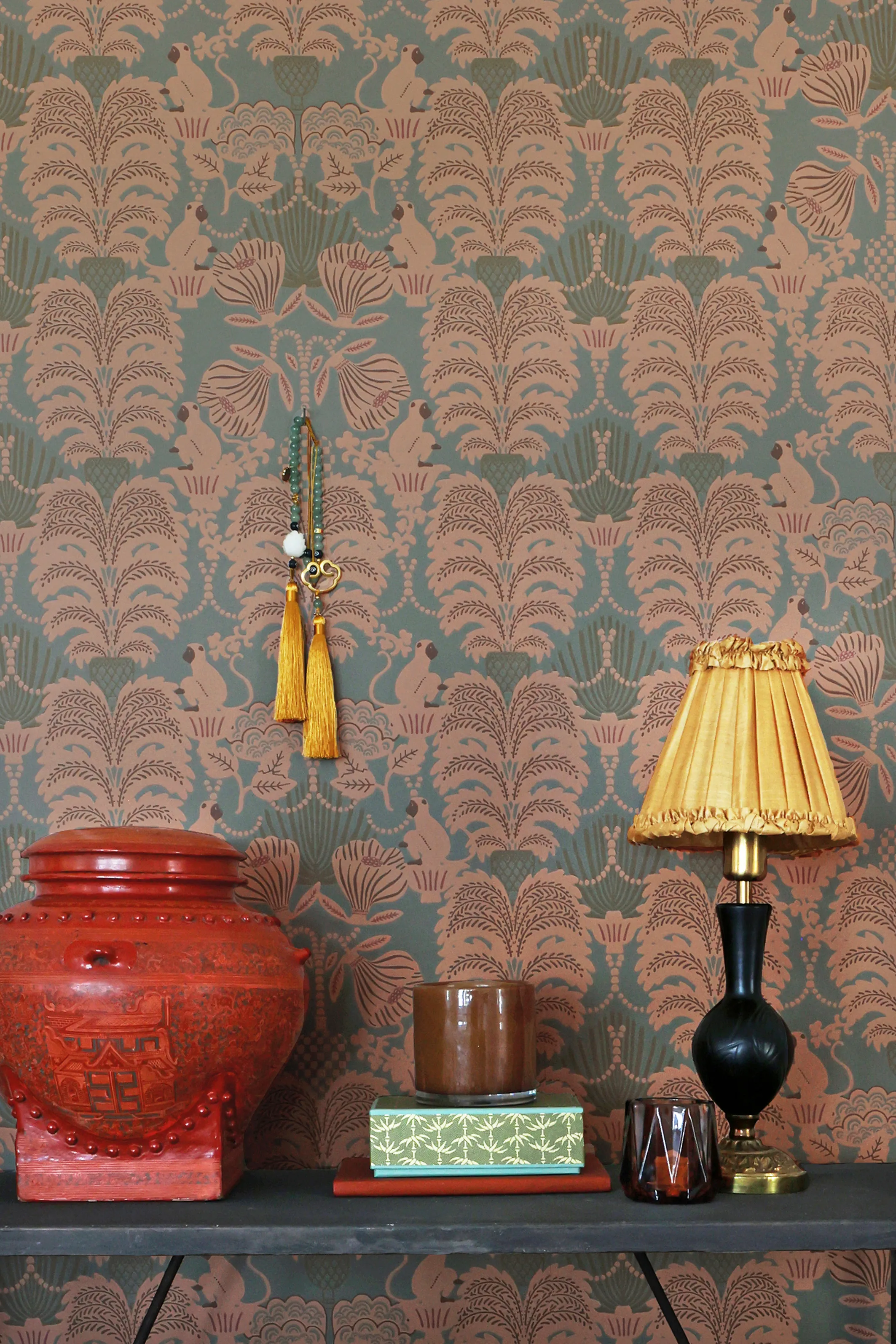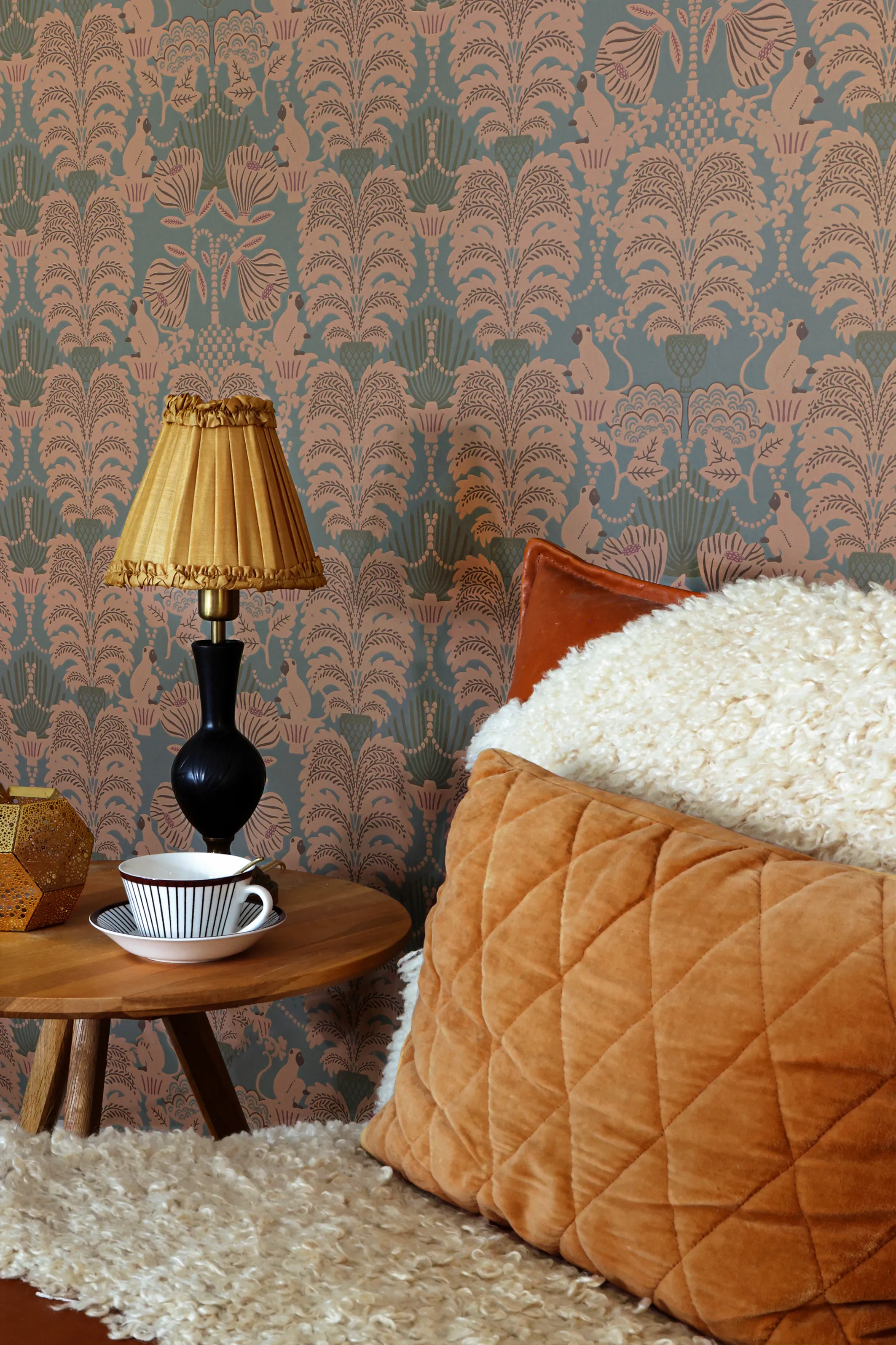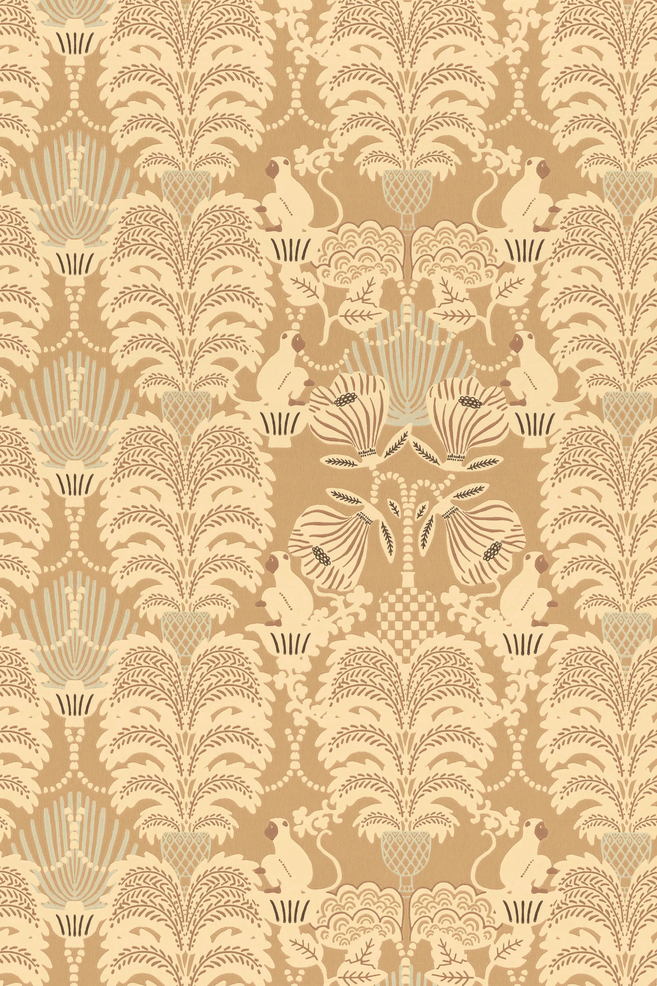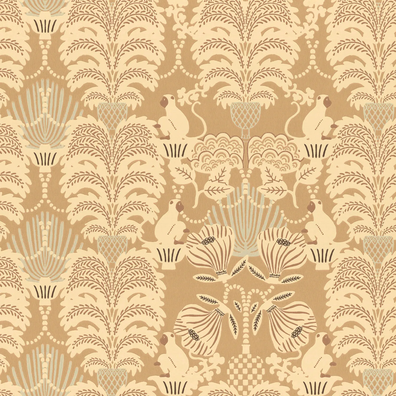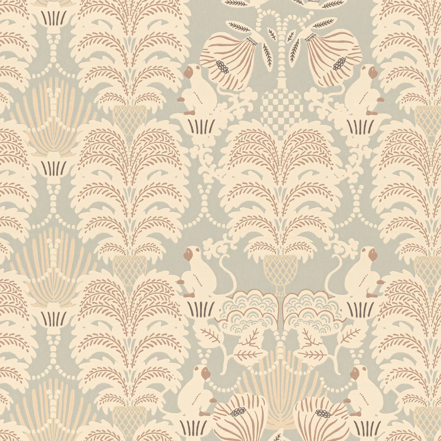 Majvillans Hello Monkey-tapet förenar klassisk elegans med lekfull livsglädje. Mönstret visar stiliserade palmer, frodiga bladformer och nyfikna apor som sitter bland växterna som en naturlig del av helheten. Den symmetriska, handritade rytmen ger tapeten en harmonisk och berättande känsla som tilltalar både barn och vuxna.