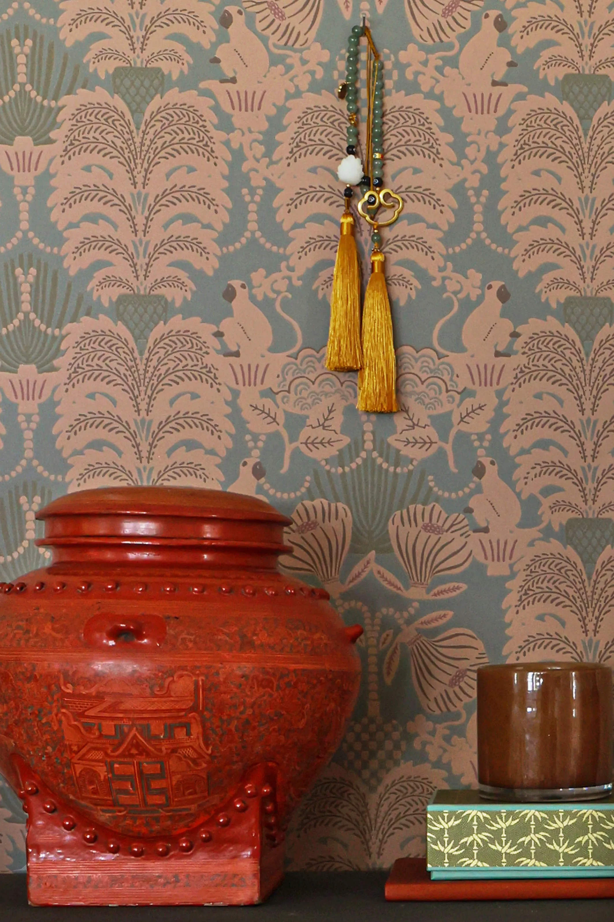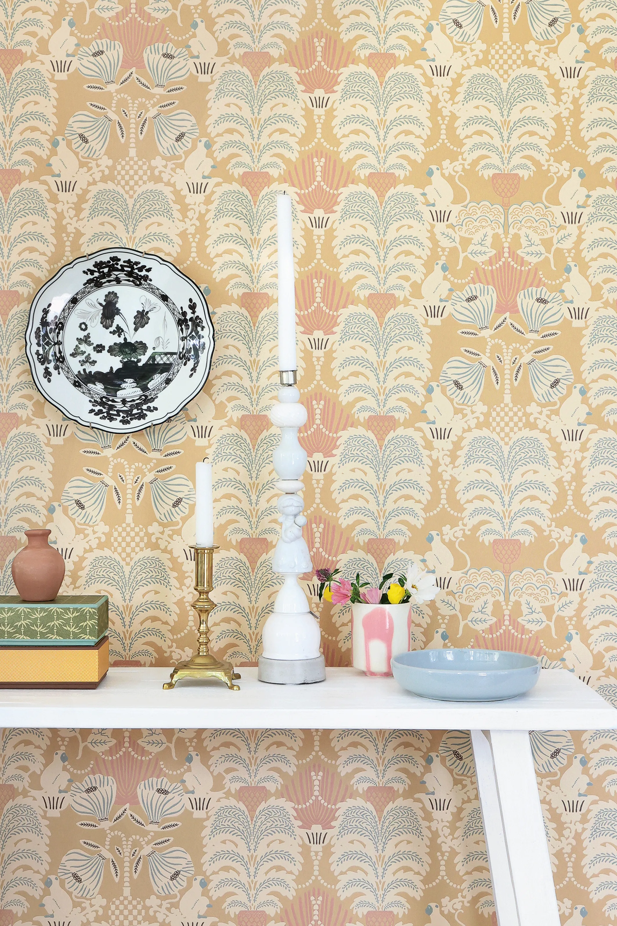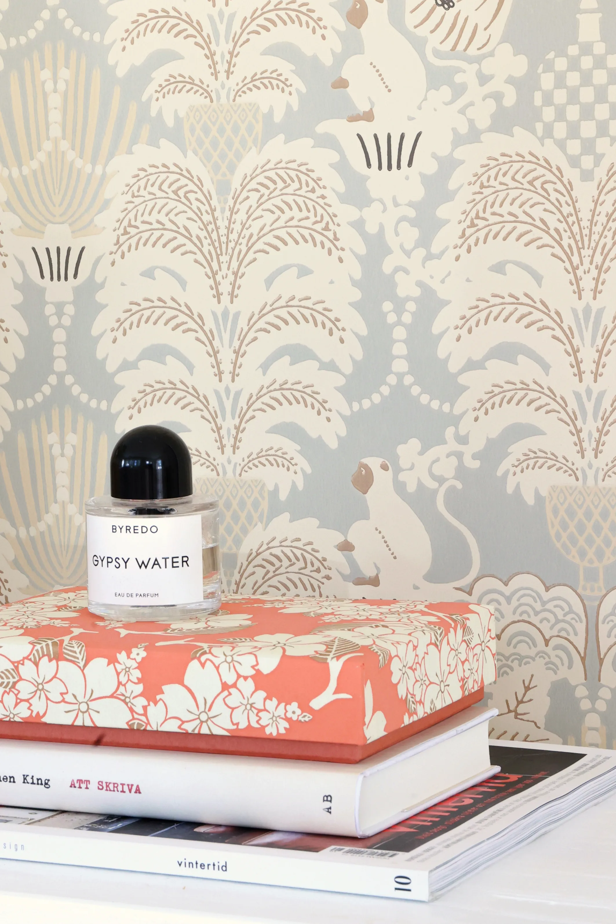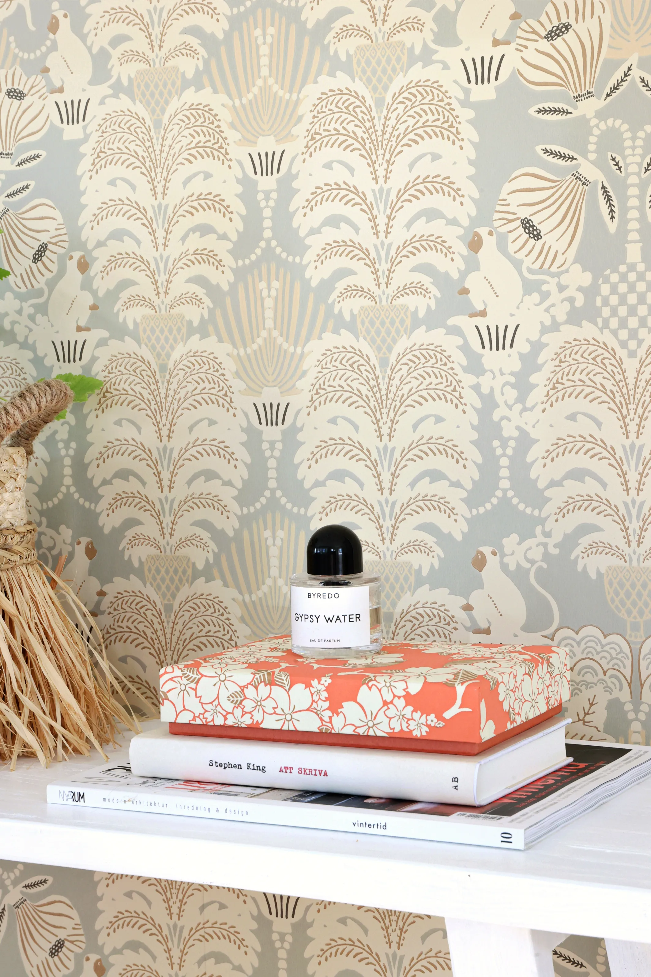 Majvillans Hello Monkey-tapet förenar klassisk elegans med lekfull livsglädje. Mönstret visar stiliserade palmer, frodiga bladformer och nyfikna apor som sitter bland växterna som en naturlig del av helheten. Den symmetriska, handritade rytmen ger tapeten en harmonisk och berättande känsla som tilltalar både barn och vuxna.