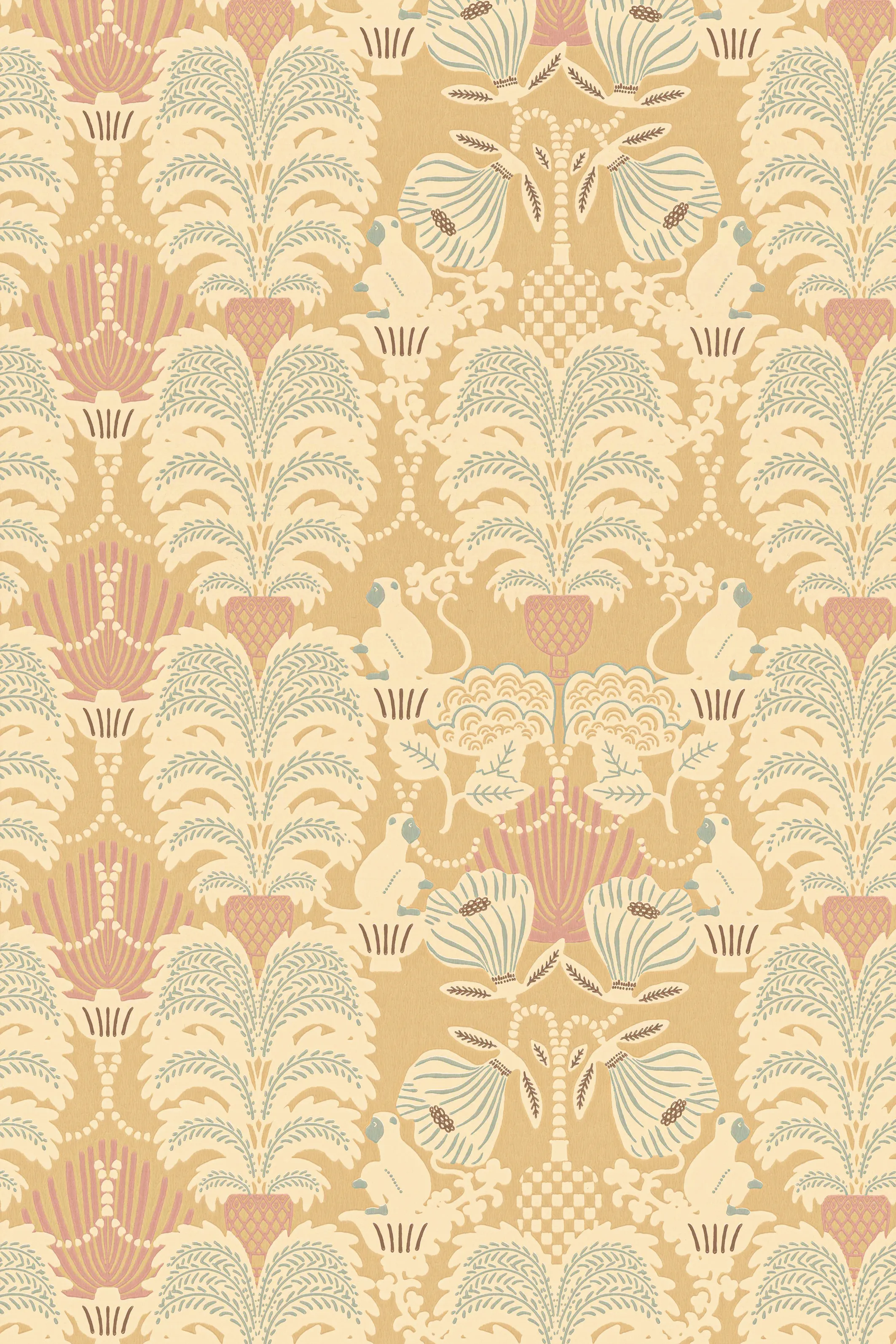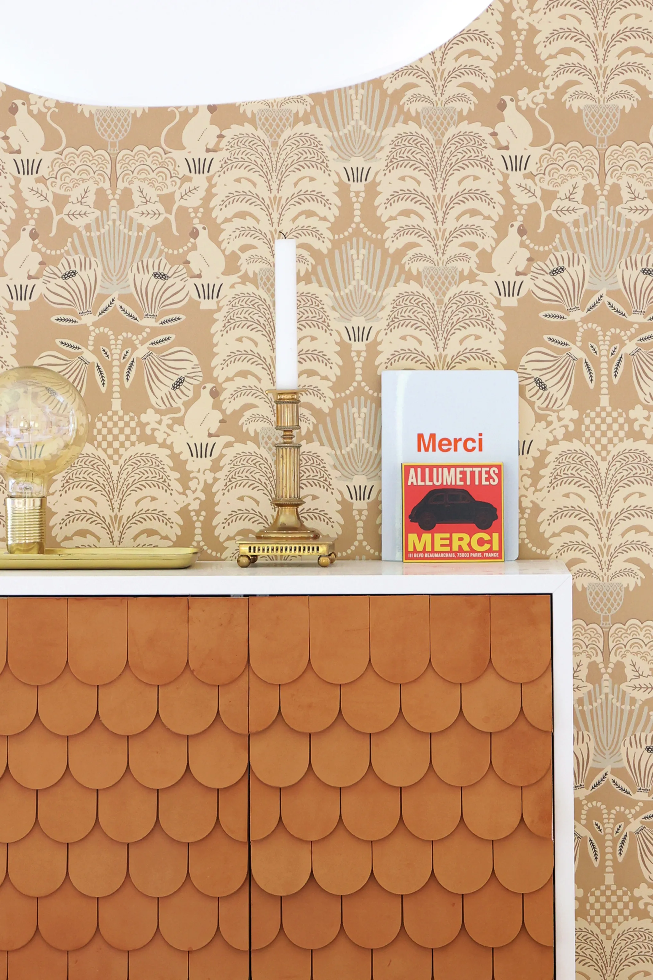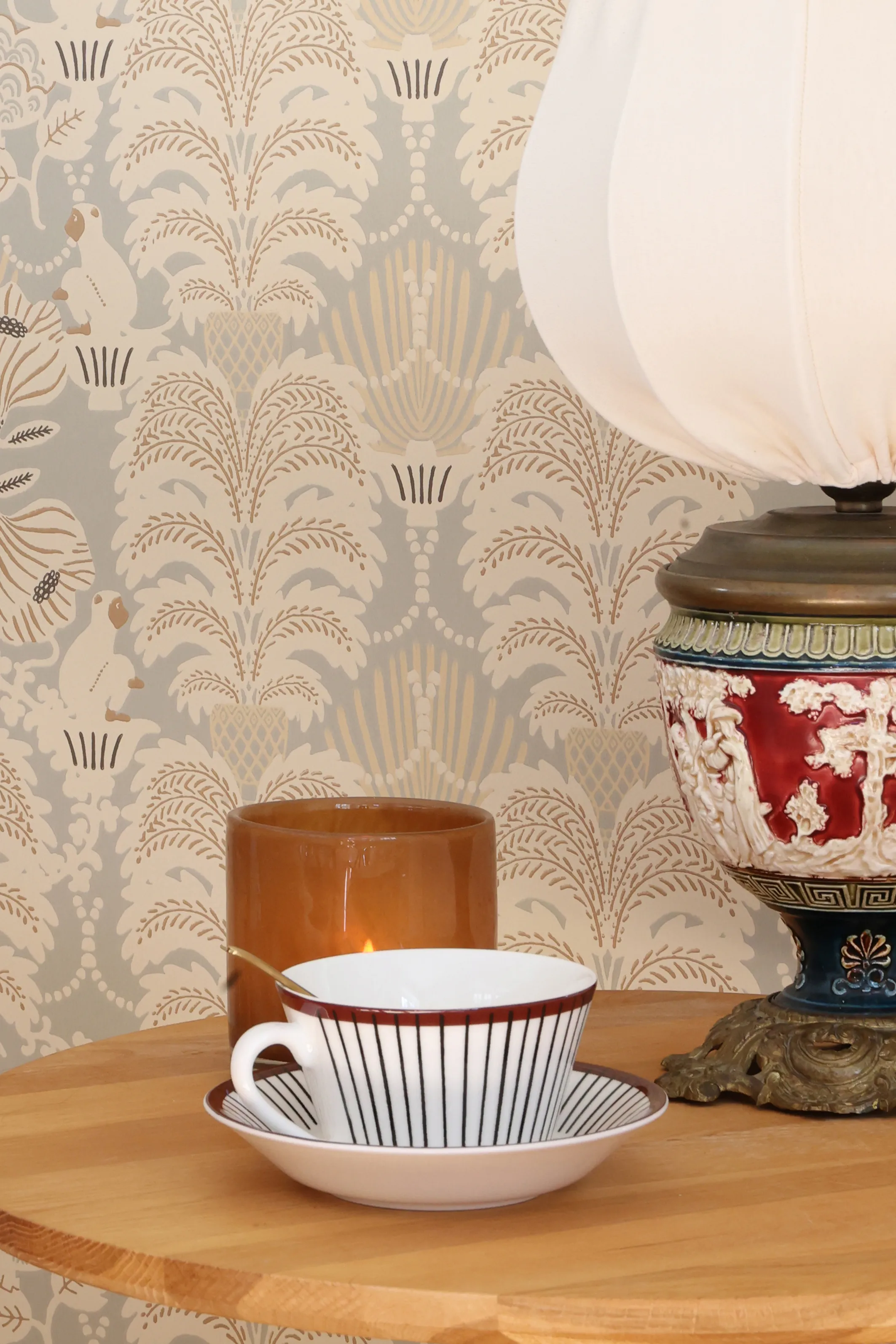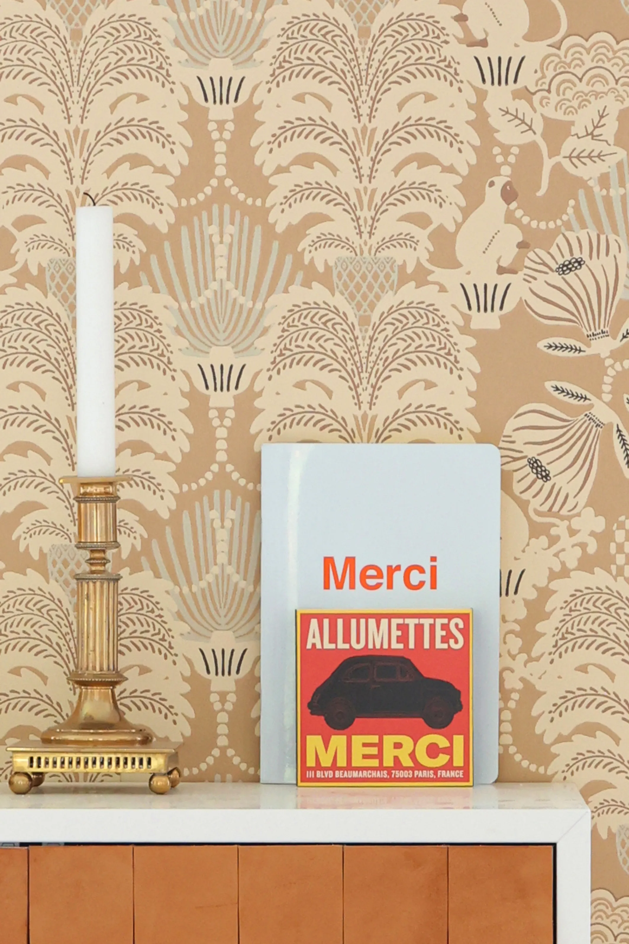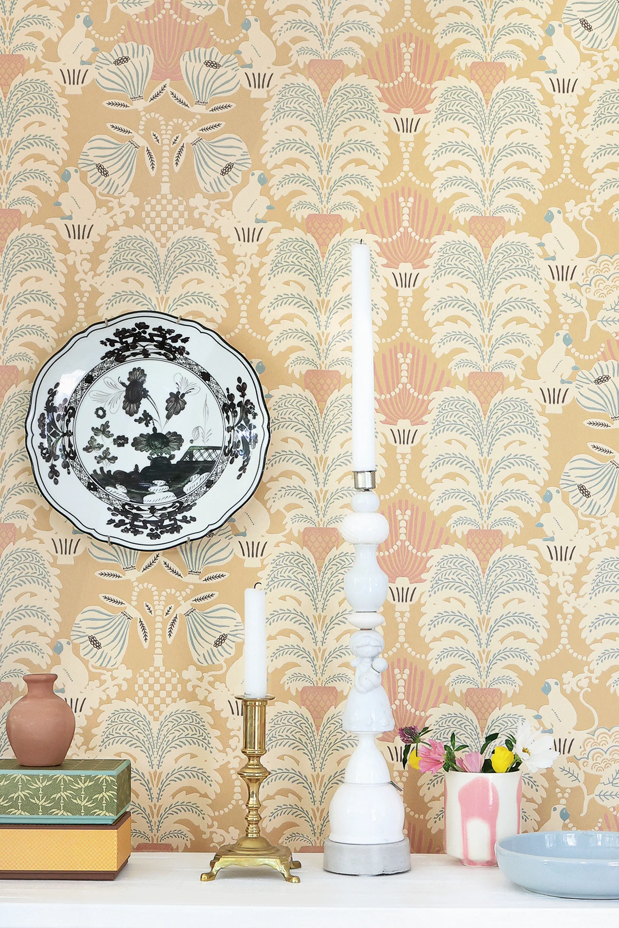 Majvillans Hello Monkey-tapet förenar klassisk elegans med lekfull livsglädje. Mönstret visar stiliserade palmer, frodiga bladformer och nyfikna apor som sitter bland växterna som en naturlig del av helheten. Den symmetriska, handritade rytmen ger tapeten en harmonisk och berättande känsla som tilltalar både barn och vuxna.