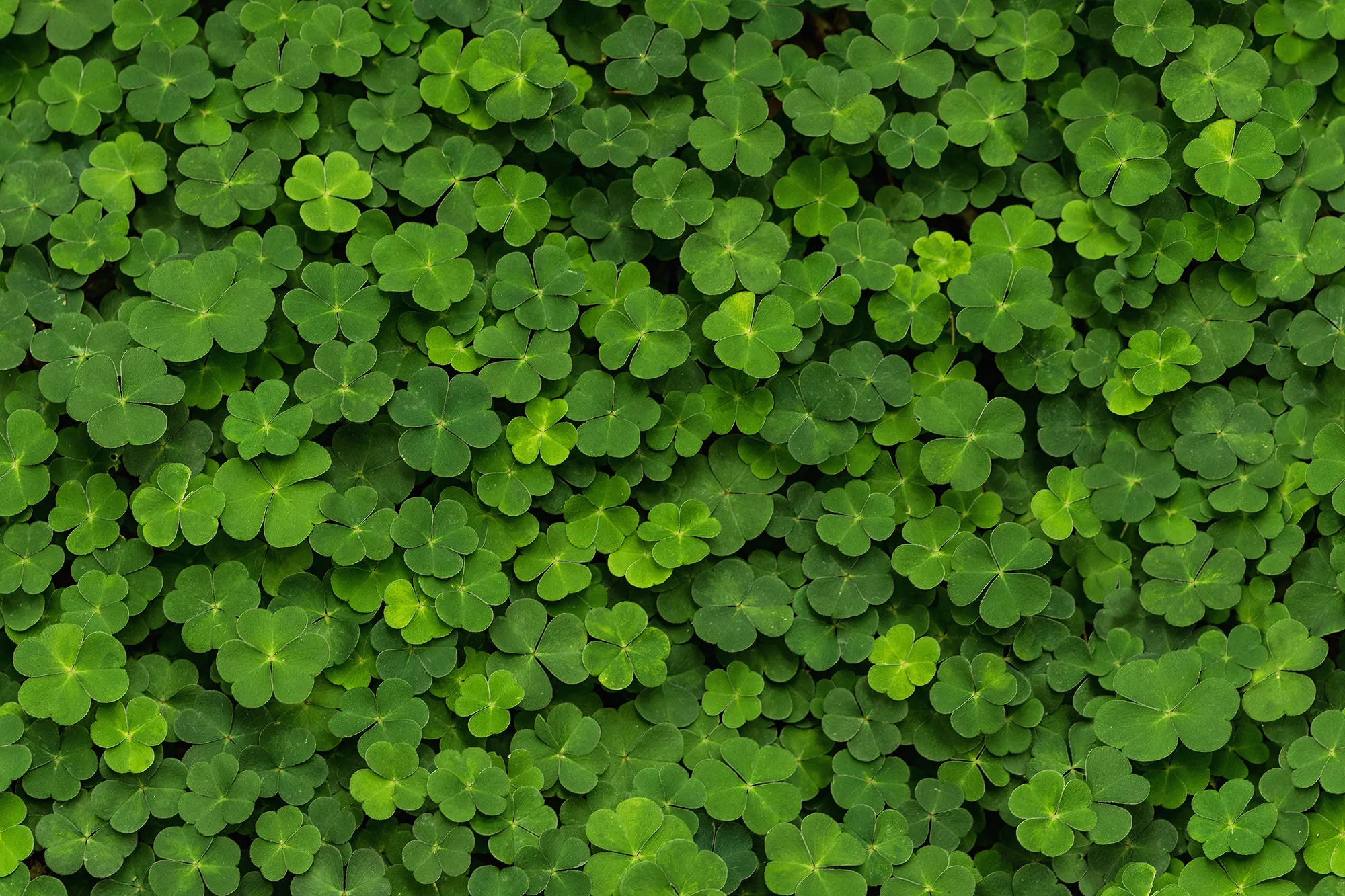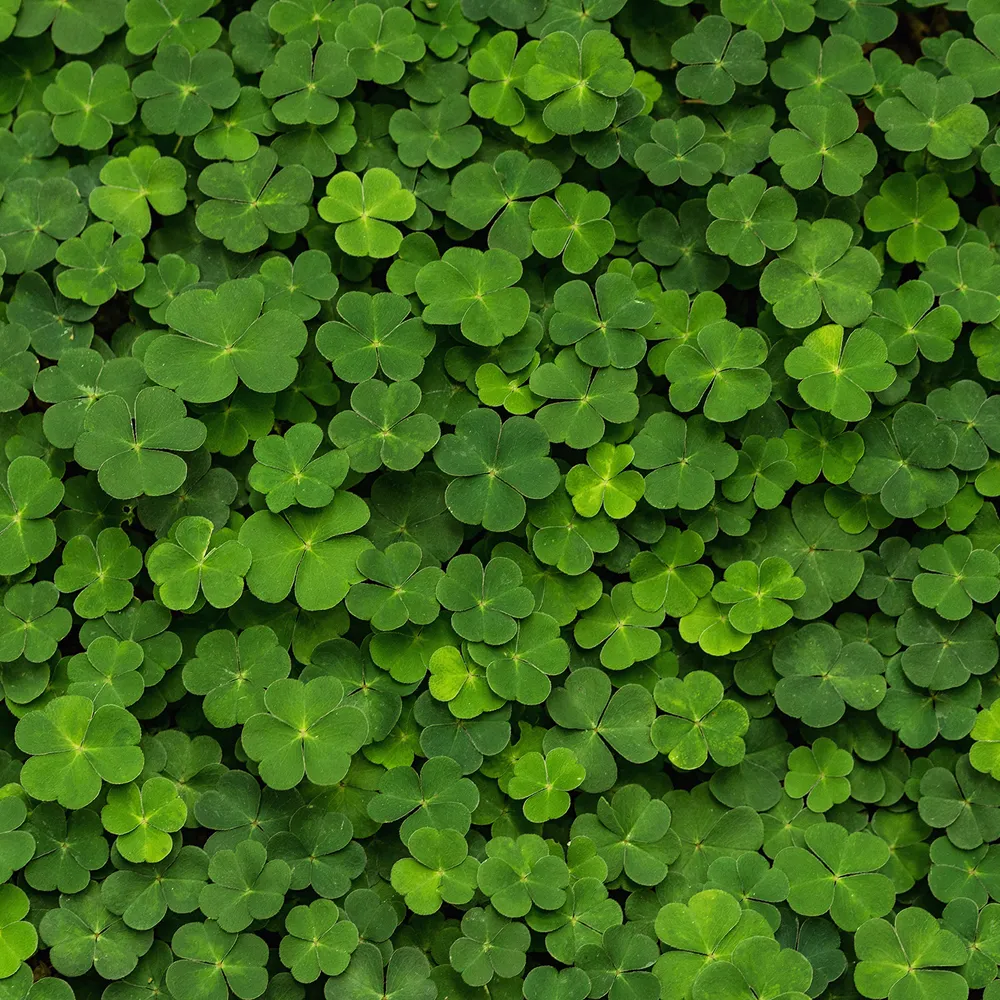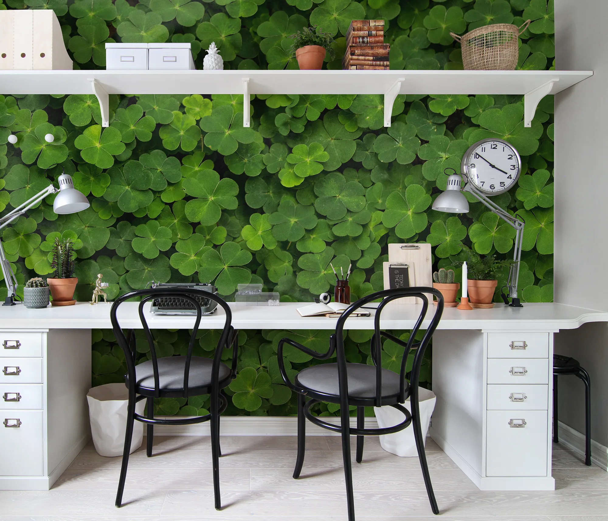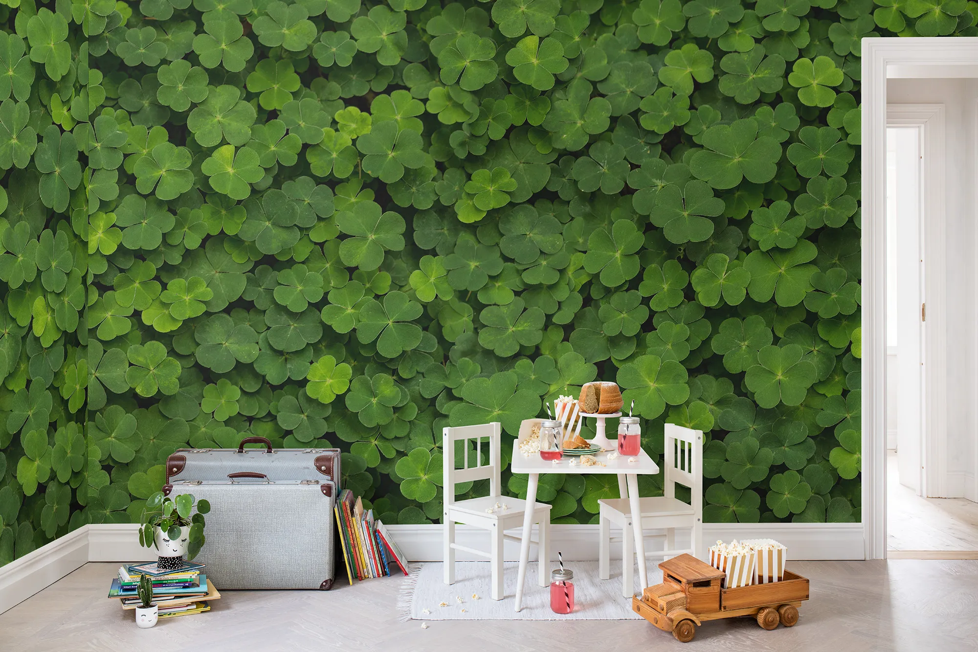 Clover-mural tapeten har en grön och frodig klöveräng med gigantiska klöverblad. Kan du hitta ett fyrklöver? Storblommig tapet för barnrum eller hemmakontor.