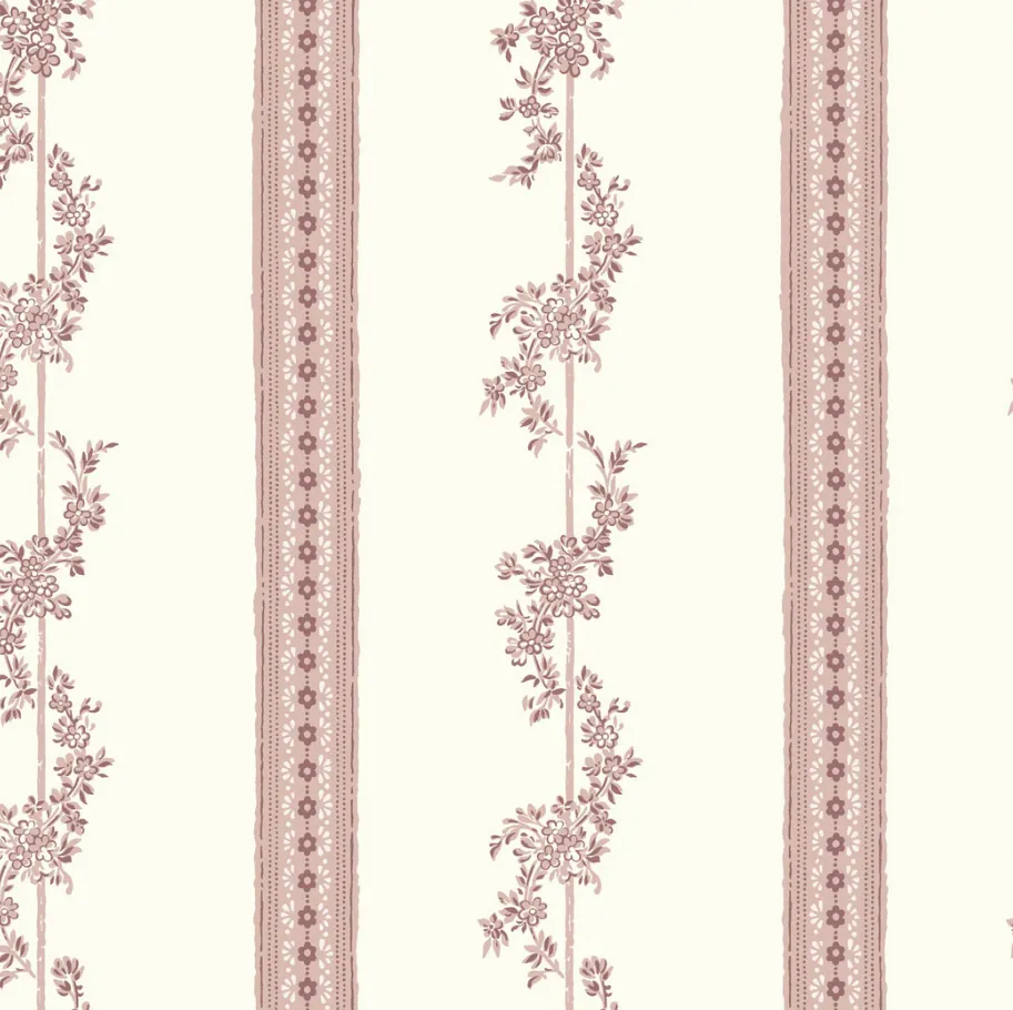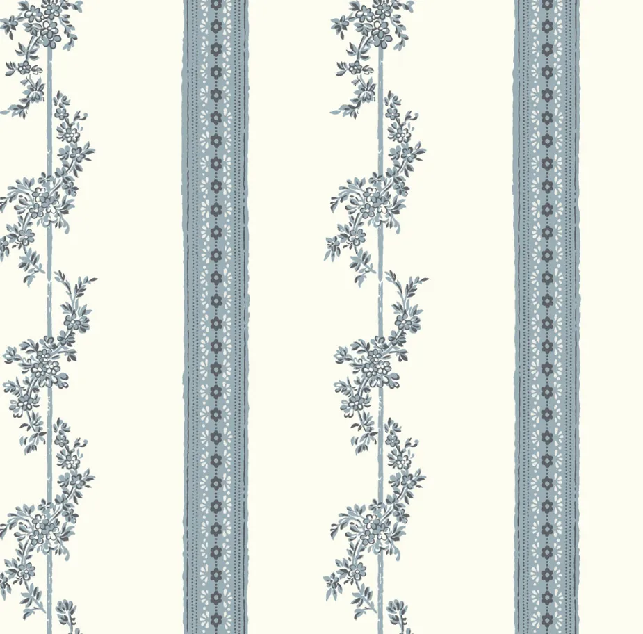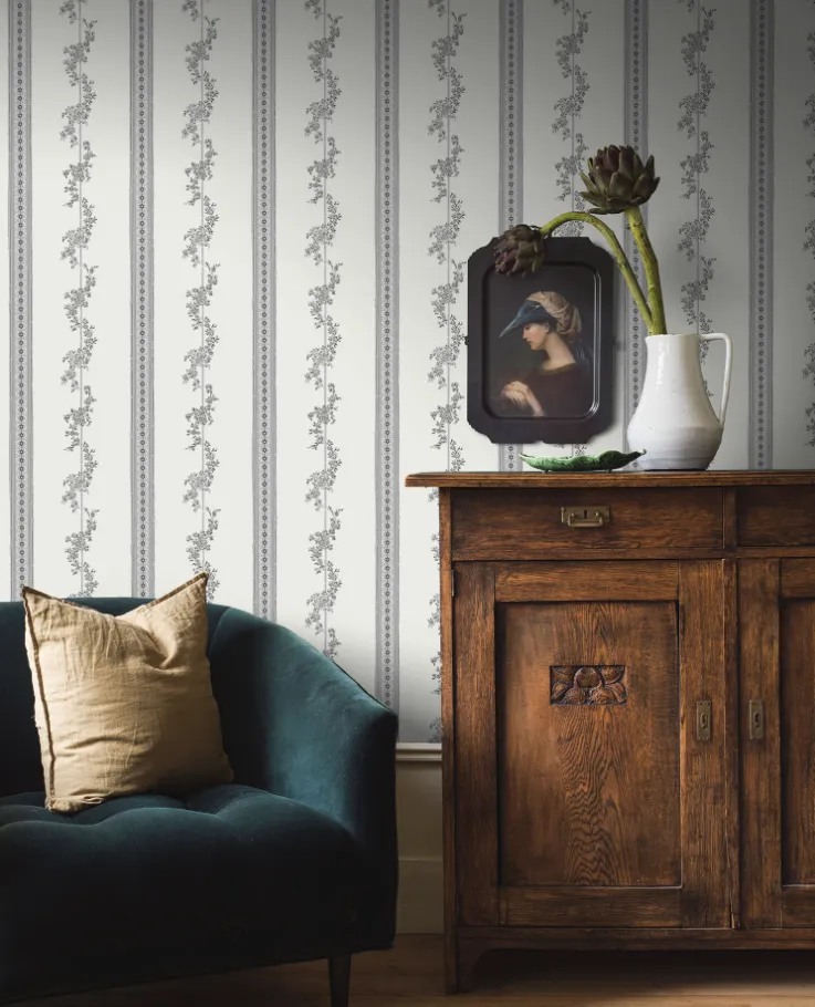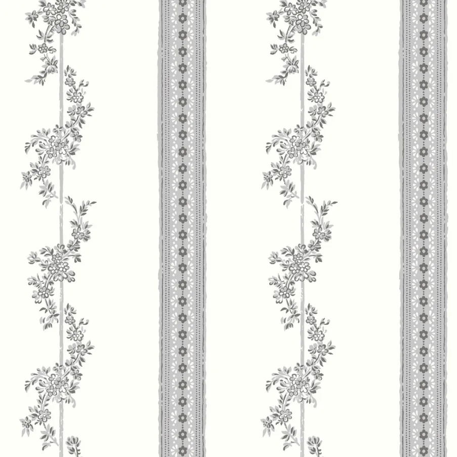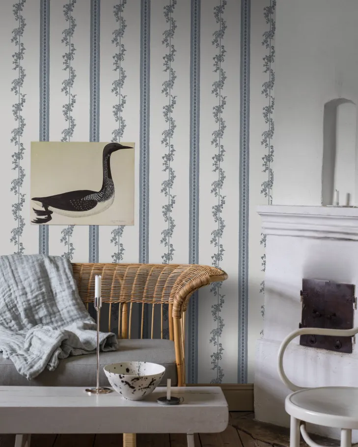 Tapeten Drottningholm från Boråstapeter har blommiga band och ränder, ett klassiskt mönster som varit populärt sedan 1700-talet. Mönstret kommer från Drottningholms slottsteater. Tre färgalternativ.
