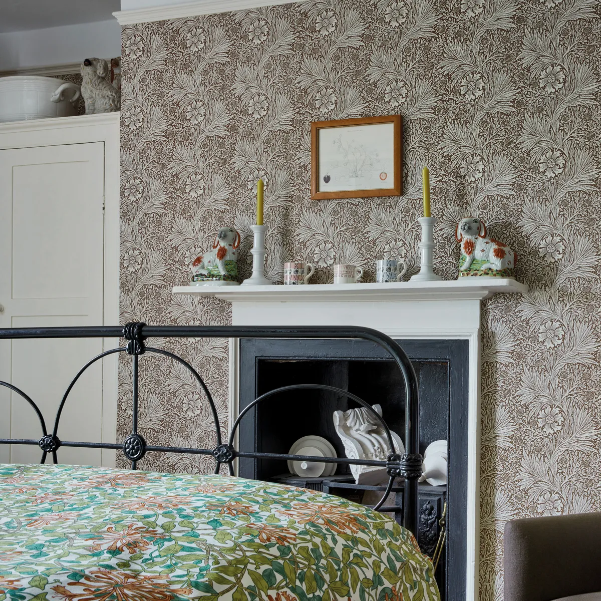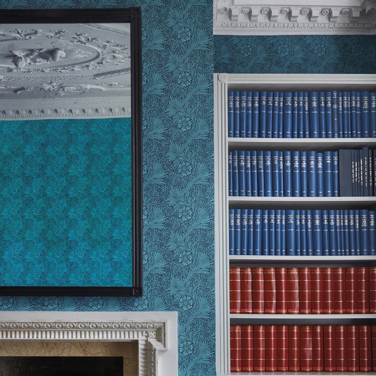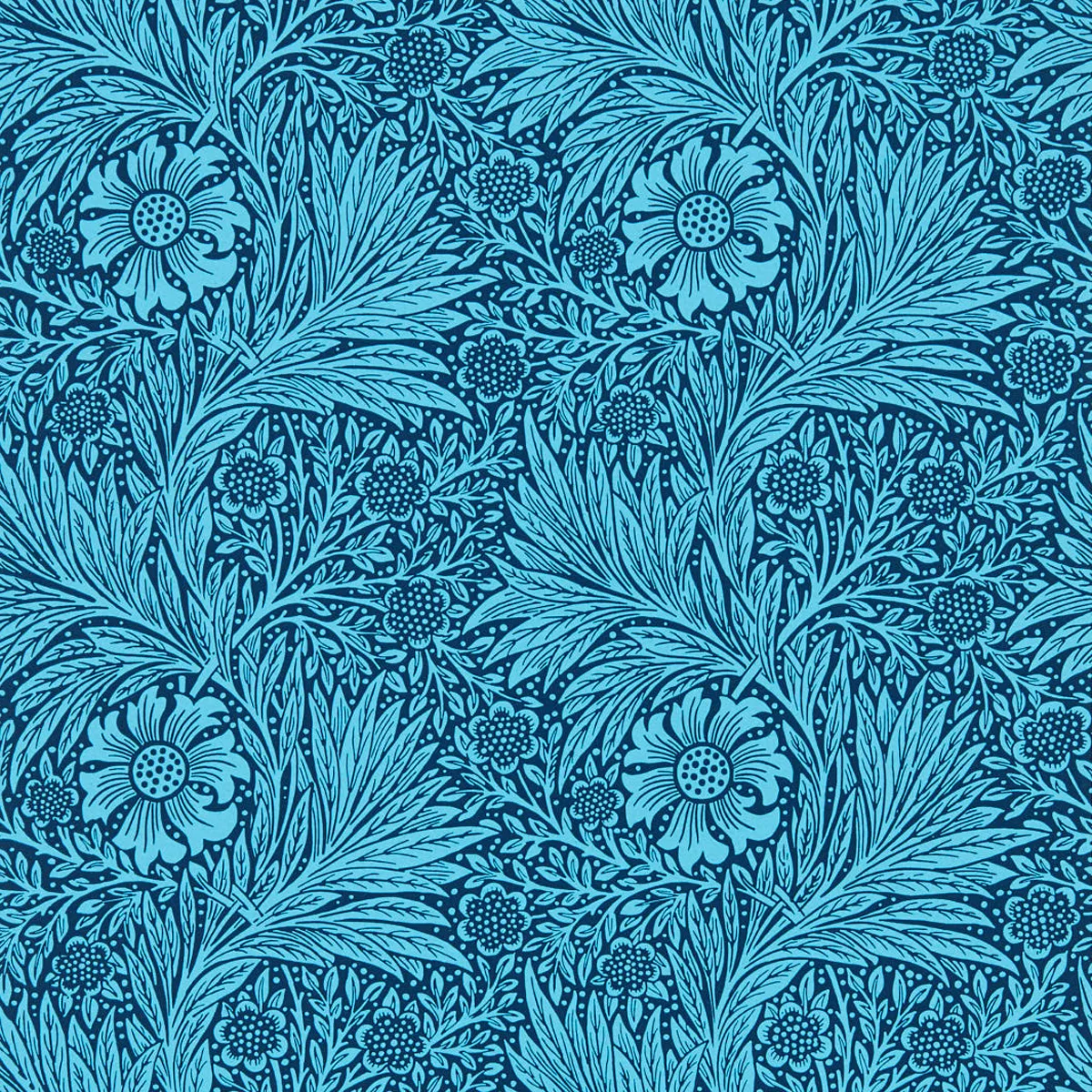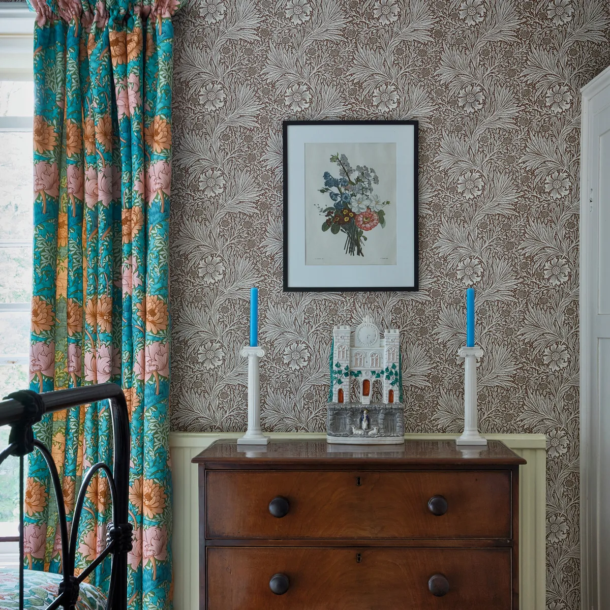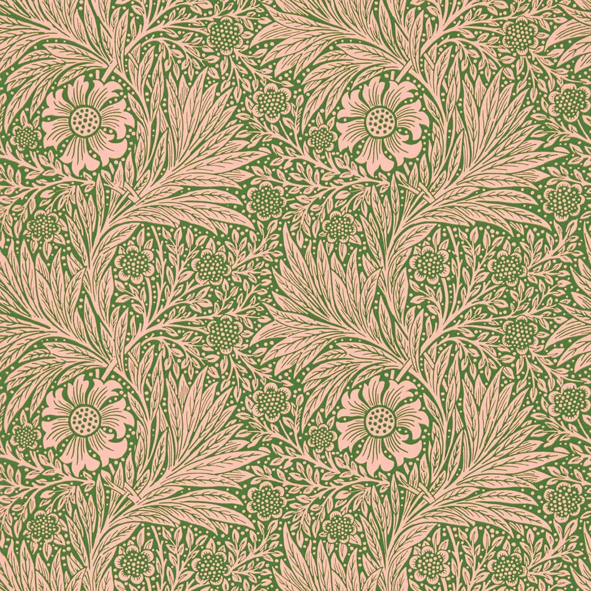 Blommiga tapeten Marigold är en klassiker från Morris & Co som designades redan 1875. Här i tre färgglada alternativ. Tapeten passar i sovrum, vardagsrum och matsal.