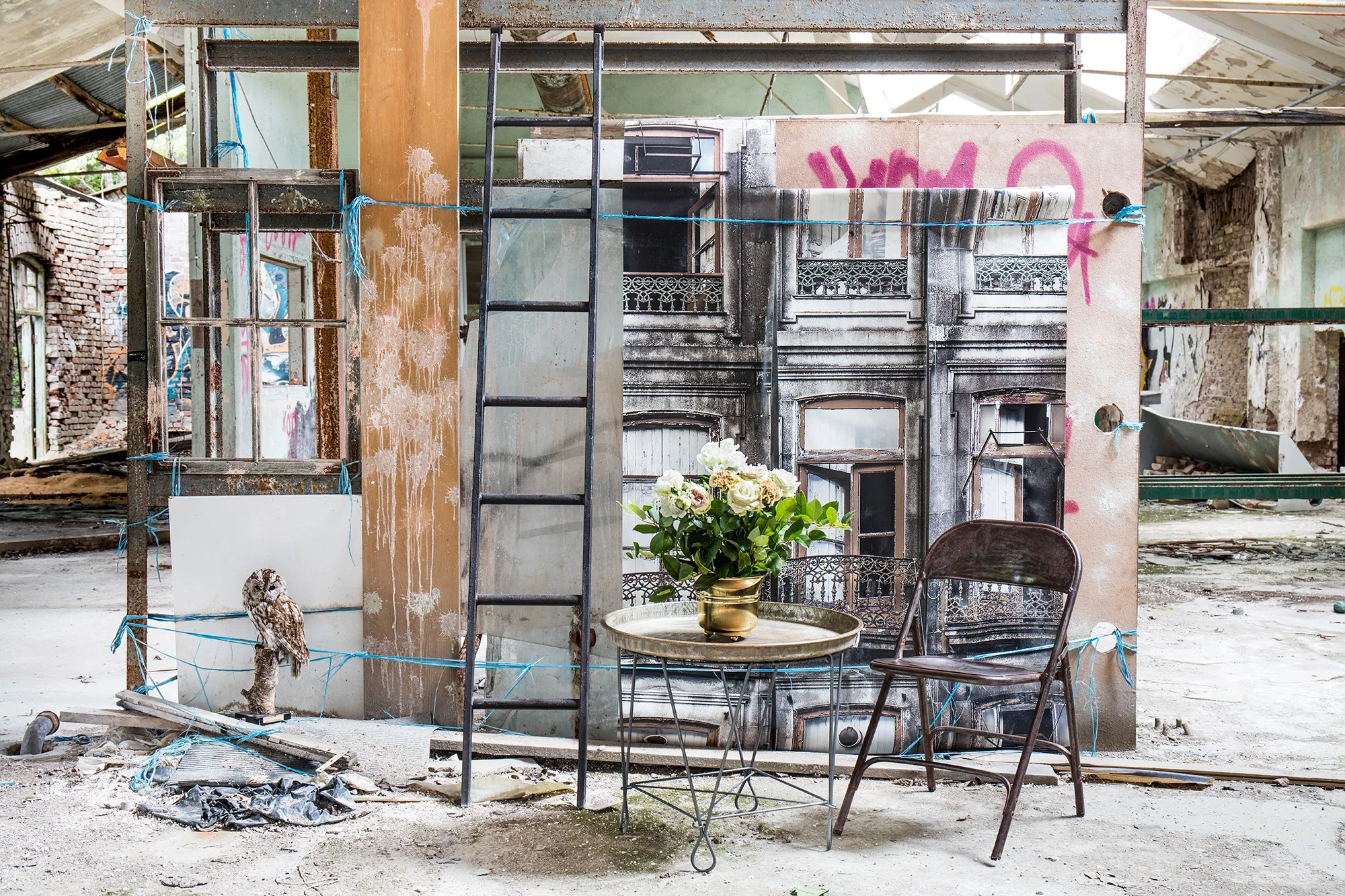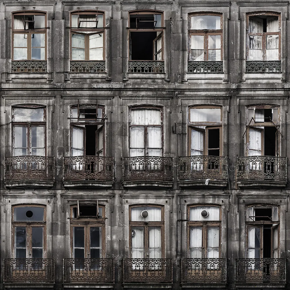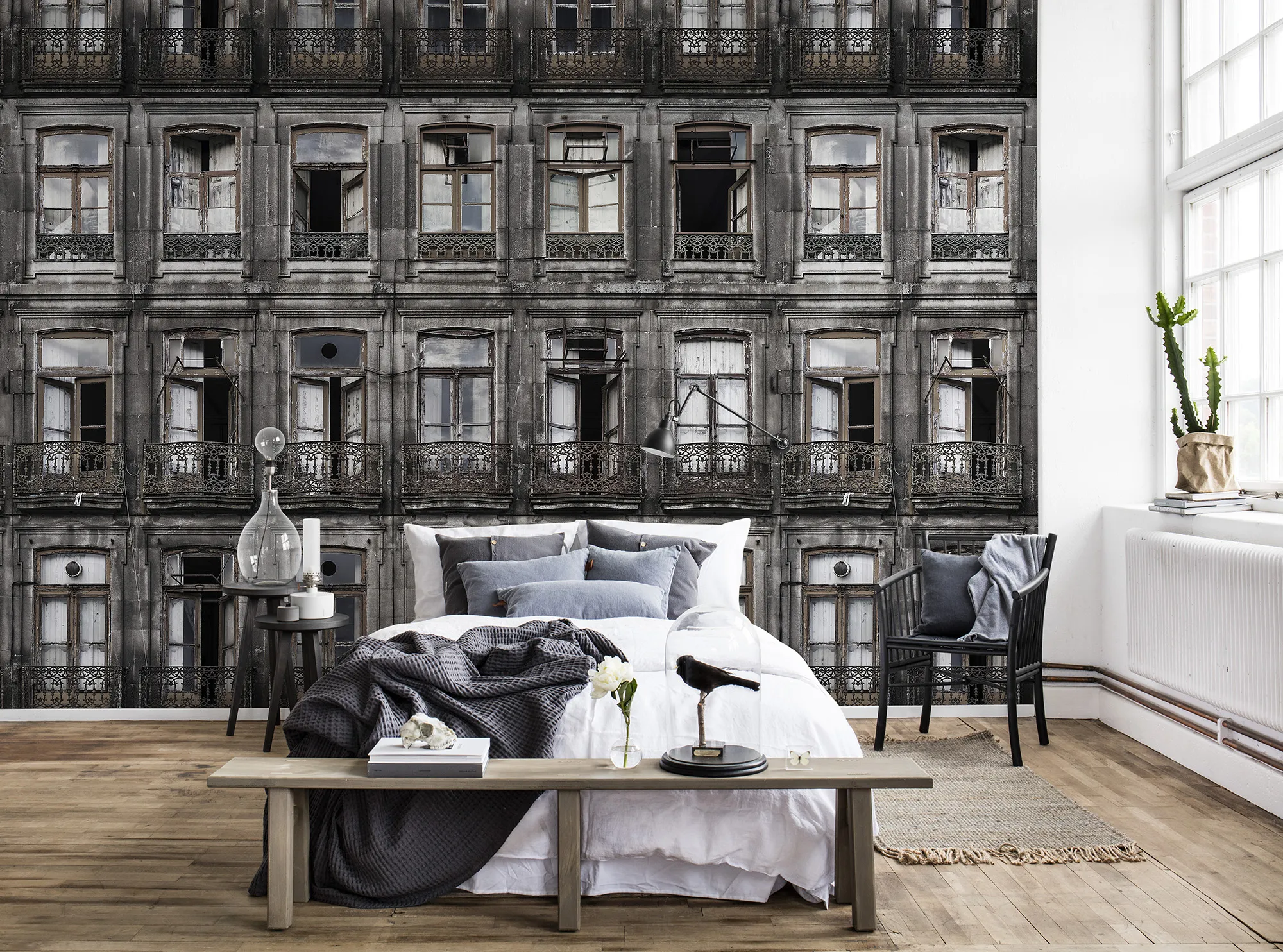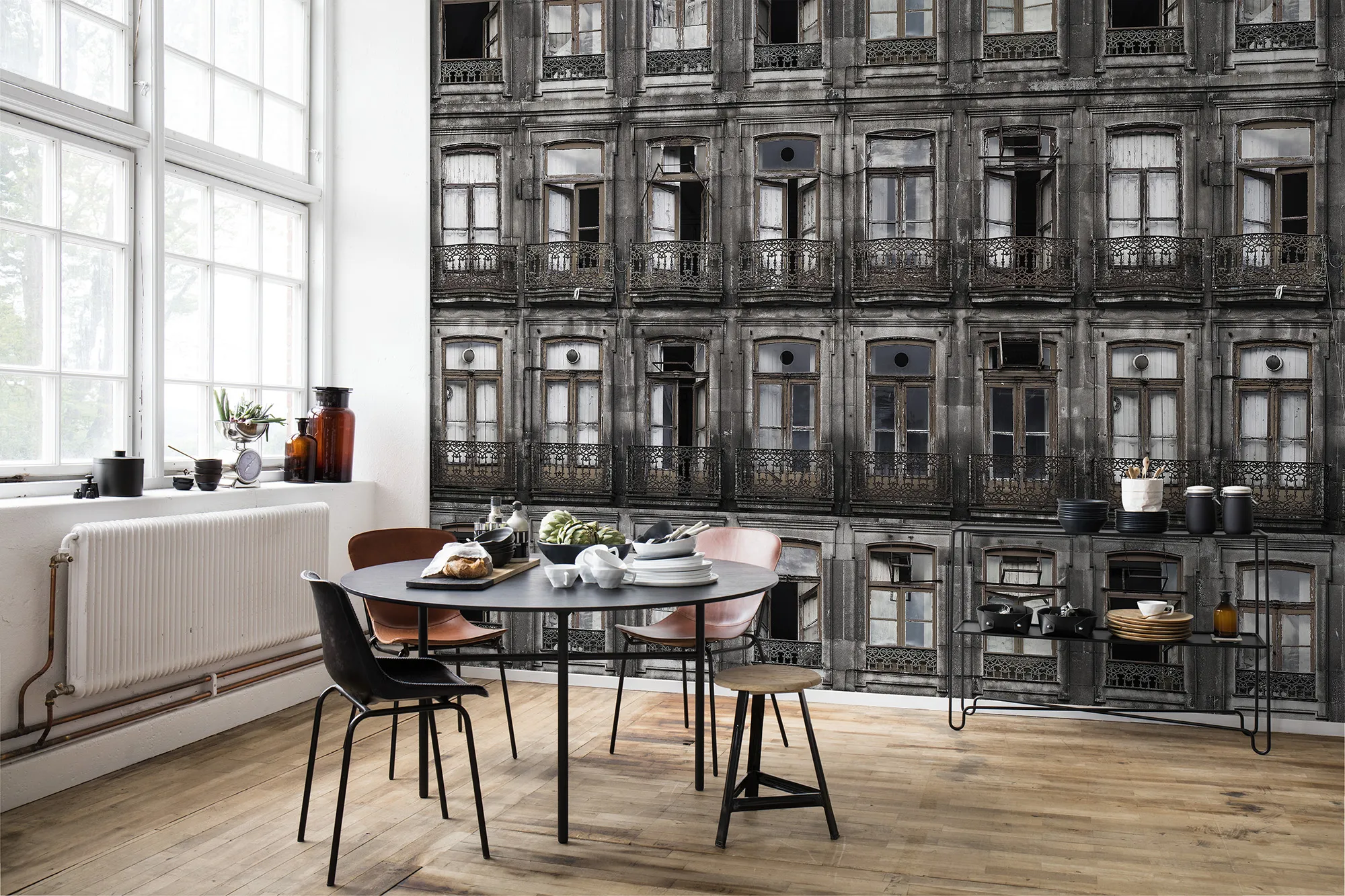Muraltapeten Perspective La Rue är en fototapet av en husfasad med fönster är mysterisk, var finns huset, vem bor där? En fängslande muraltapet till sovrummet, matsalen eller vardagsrummet.