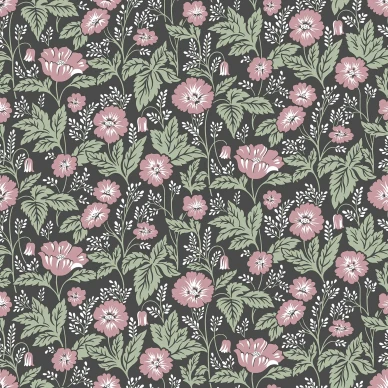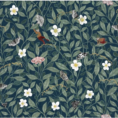 Rebel Walls blommiga tapet Pixie är lekfull med månen som vakar över blommor, fjärilar och små pysslingar. Muraltapeten passar bra i barnrummet.