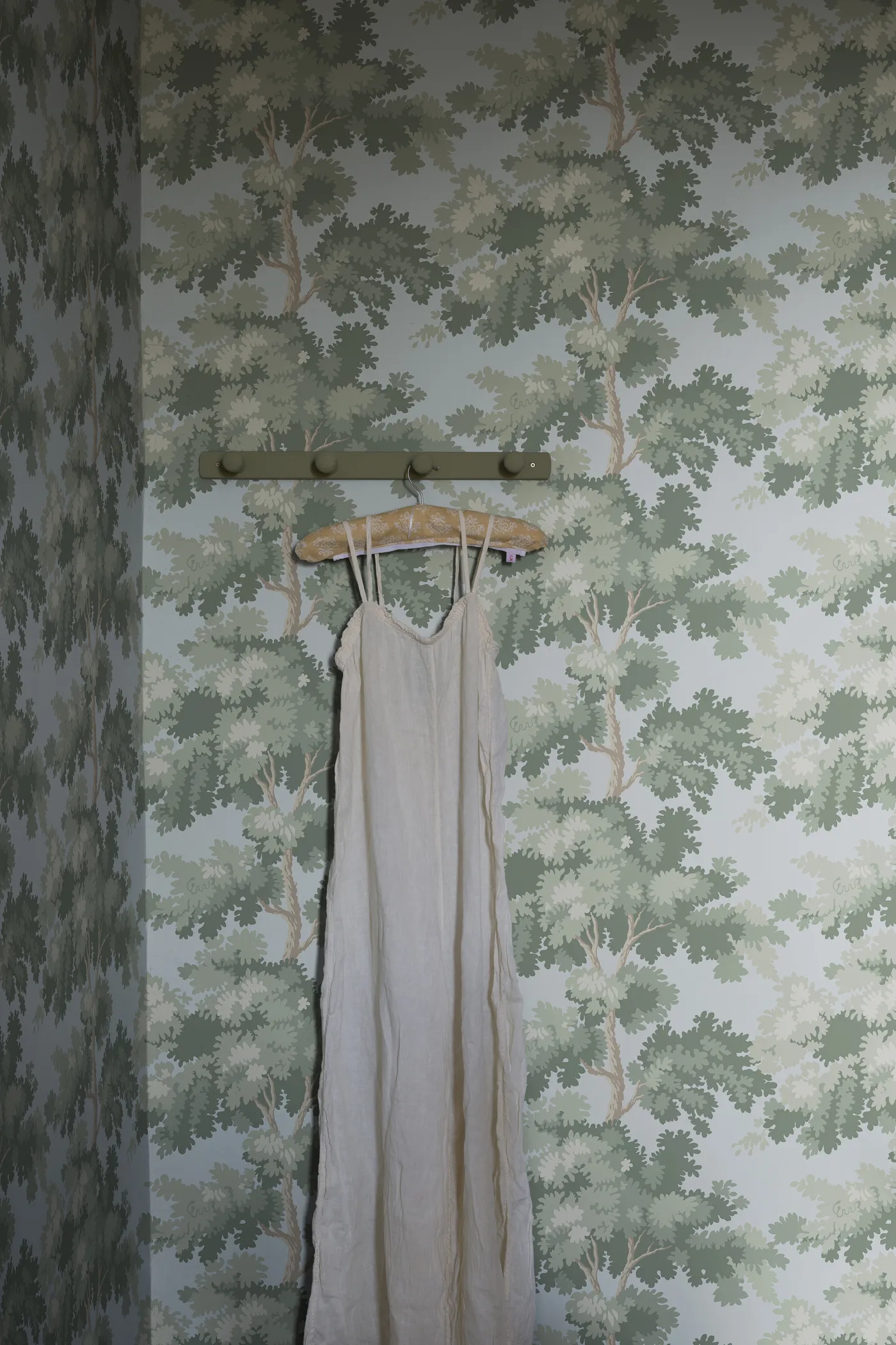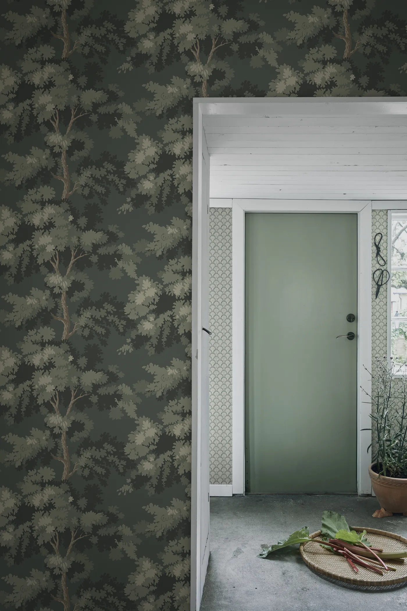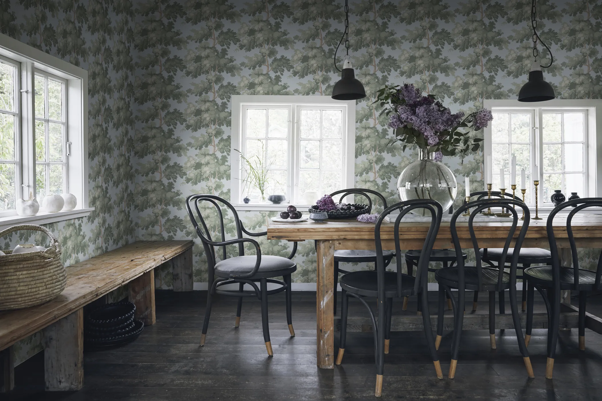 Tapeten Raphaël är en av Sandbergs mest populära. Med lummiga trädkronor passar tapeten till exempel i matsalen eller vardagsrummet.