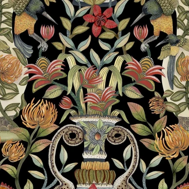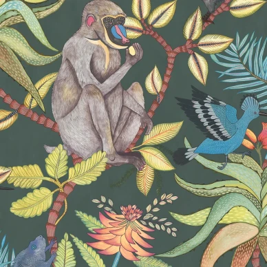 Djurtapeten Safari Totem med elefanter, giraffer, apor och leoparder som klättrar på varandra så mönstret nästan bildar totempålar. Ett böljande mönster där djuren flätas ihop i en dans. En exotisk sovrumstapet eller vardagsrumstapet.