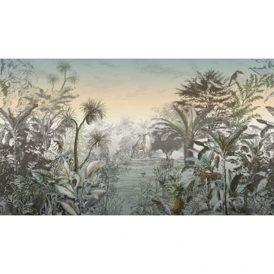 Muraltapeten Secret Garden Bali Boards med handritat djungelmönster ovanpå en ljus träpanel ger en tropisk och varm känsla. Använd som fondvägg i kombination med muraltapeten Bali Boards. En fin muraltapet till hallen, vardagsrummet, hemmakontoret eller matsalen.