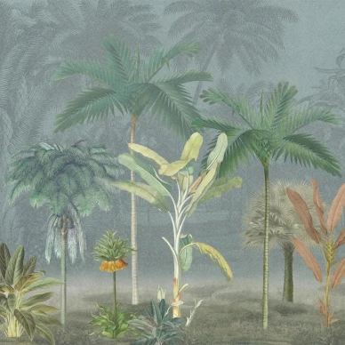 Muraltapeten Secret Garden tar oss till den frodiga djungeln med palmer och andra frodiga träd. En spännande tapet till vardagsrum eller sovrum.