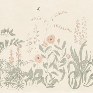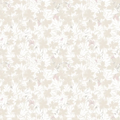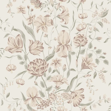 Duros blomtapet Strandäng har ett stort, naturnära mönster med havtornsbär, strån och strandväxter. Den hemtrevliga tapeten passar i sovrum och vardagsrum.