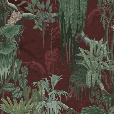 Muraltapeten Vigor med stora gröna palettblad och paradisfåglar är dynamisk och spännande. En härligt levande tapet till vardagsrum eller sovrum.