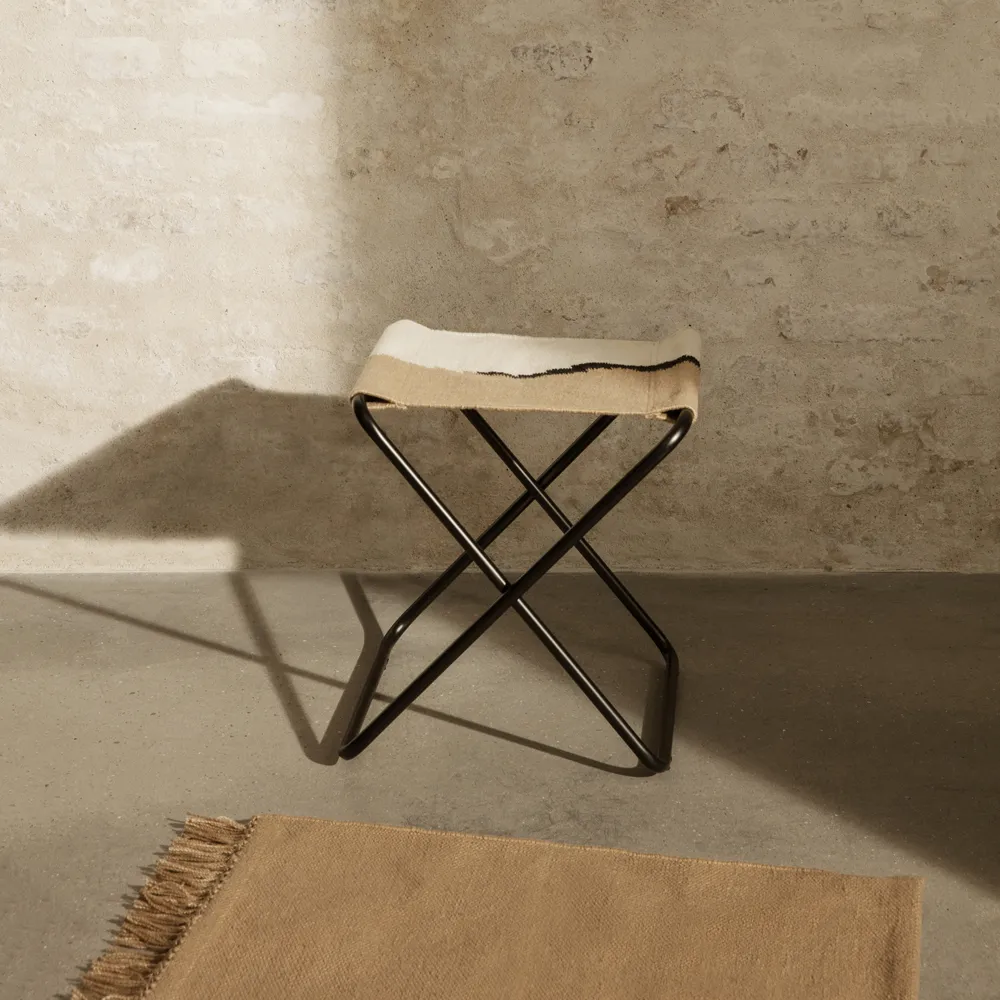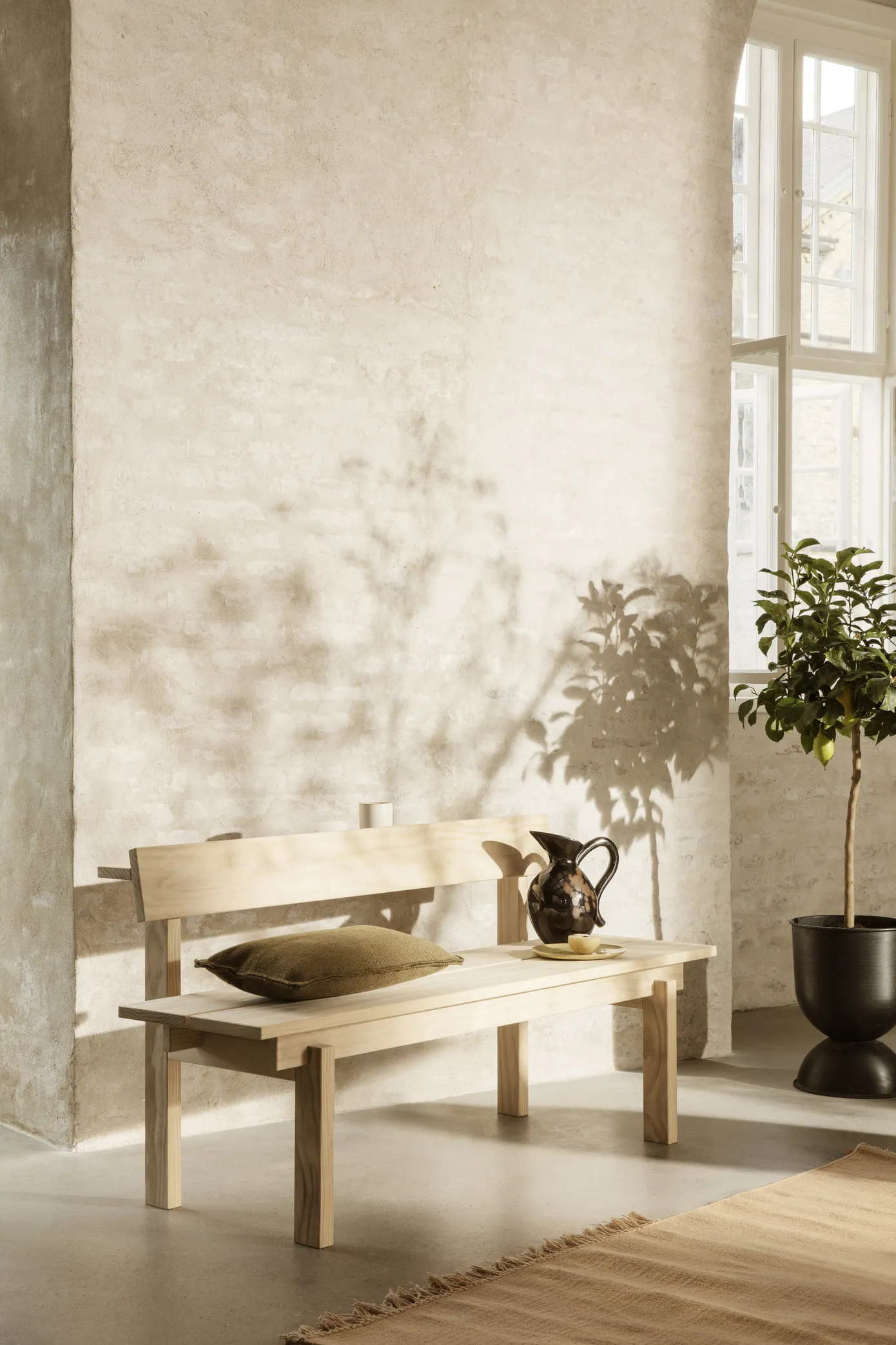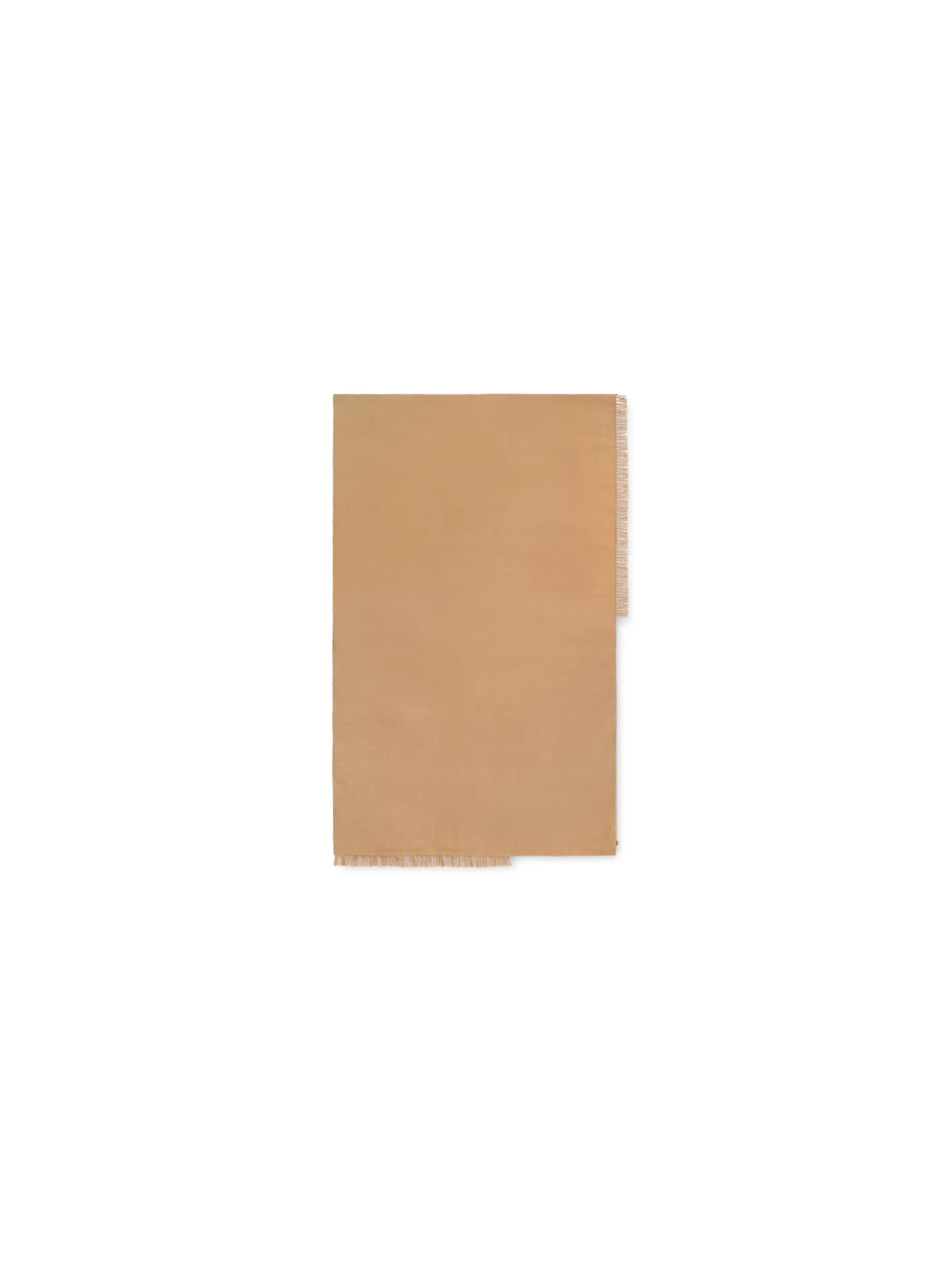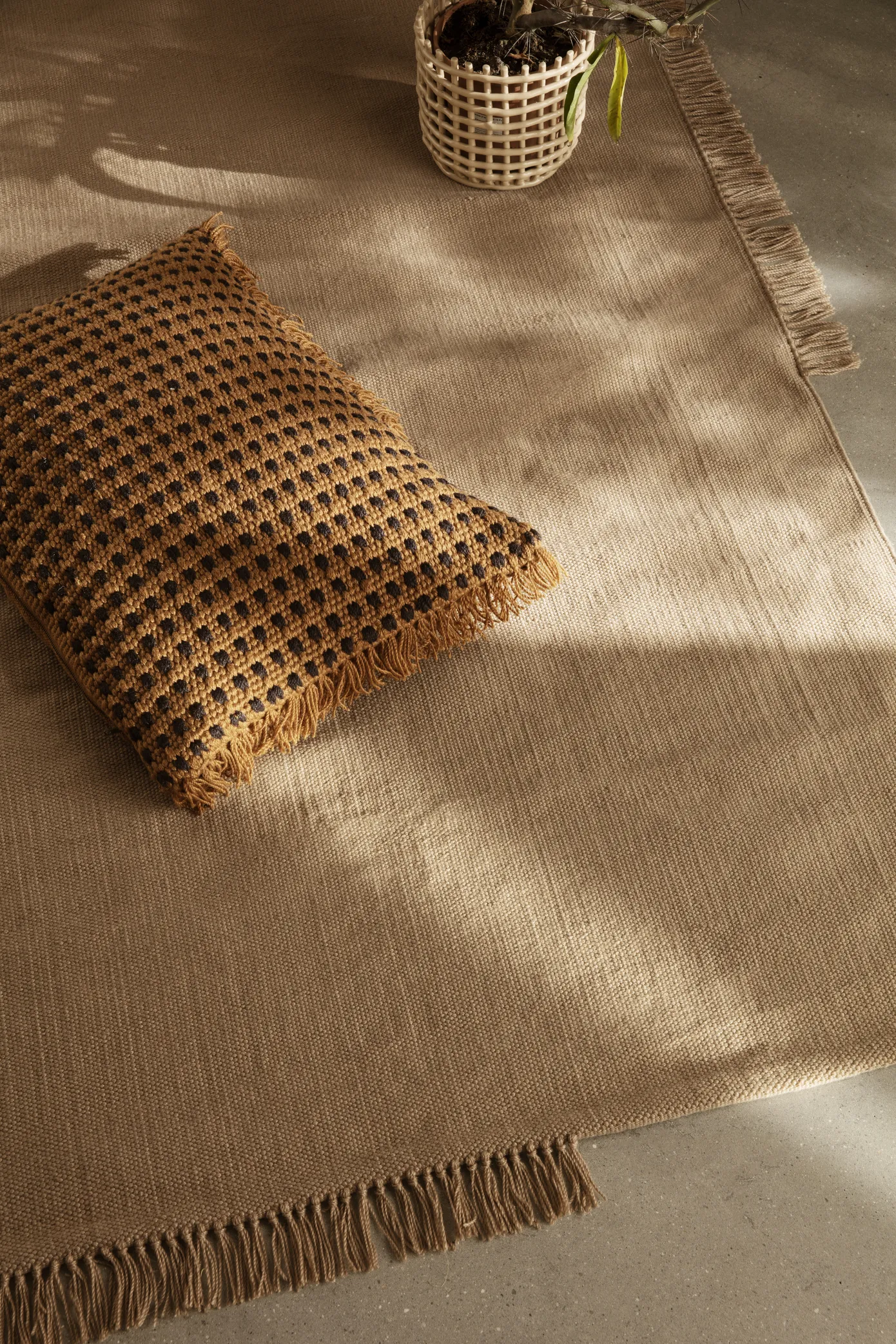 Mattan Hem från Ferm Living är modern med fransar på en långsida och en kortsida. Den sandfärgade mattan är gjord av plastflaskor som handvävts till mattor av återanvänt PET-garn. Ytan är mjuk men tålig och har en känsla av ull.