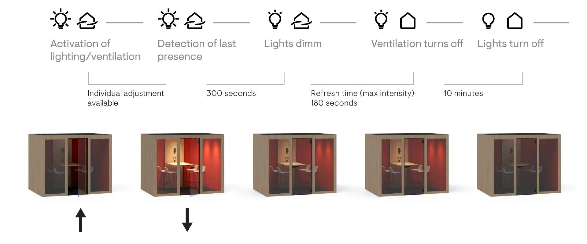 Kiitos SILENT ROOMin erikoissuunnittelun, oikea äänenabsorptiotaso taataan, mikä estää sekä sisään tulevat että ulos menevät äänet. Sisäiset akustiset seinät on suunniteltu eliminoimaan kaiku, luoden viihtyisän tunnelman. Huoneessa on neljä tehokasta mutta hiljaista tuuletinta, jotka yhdessä kolmen LED-lampun kanssa luovat lämpimän ja kutsuvan ilmapiirin, jossa voit keskittyä korkean konsentraation vaativiin tehtäviin. Älykäs ohjausyksikkö mukauttaa ilmanvaihtoa ja valaistusta tarpeidesi mukaan ja aktivoi tehokkaamman ilmanvaihdon, kun käyttäjä poistuu huoneesta, valmistautuen seuraavaa käyttäjää varten. Lisäksi, päällystetyt ulkoseinämallit on suunniteltu vaimentamaan melua entisestään, parantaen koko toimiston akustiikkaa.