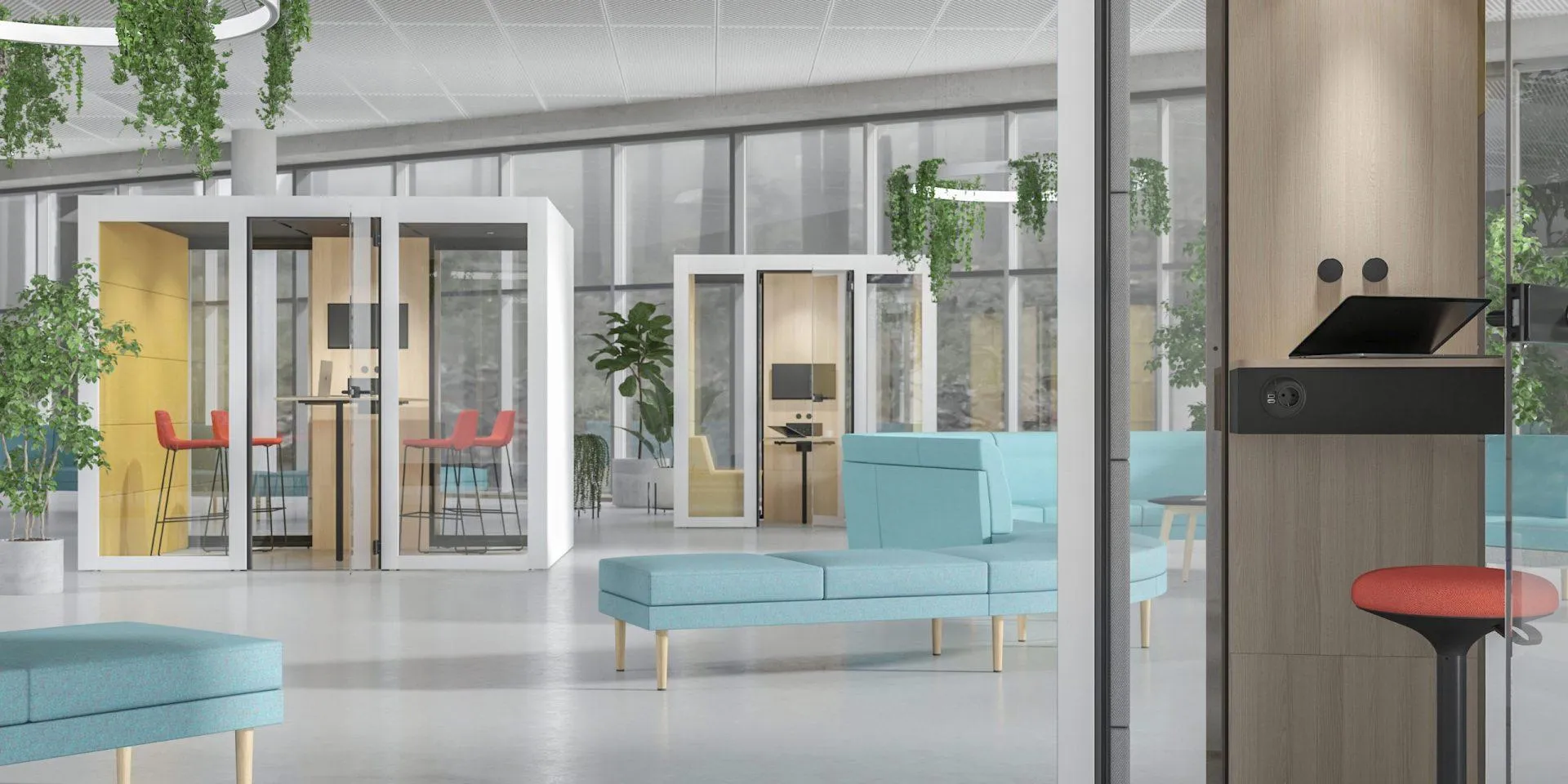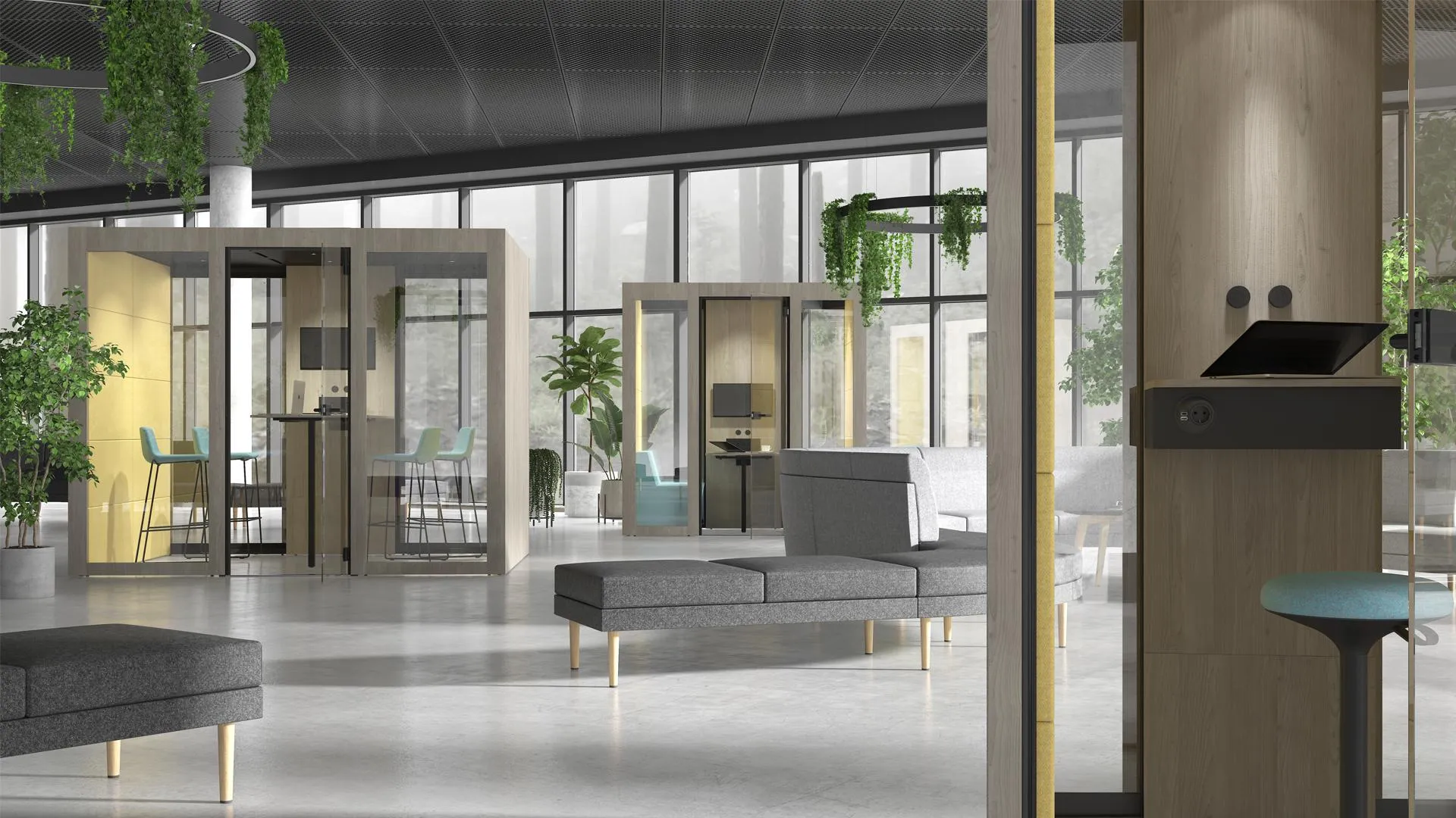 SILENT ROOM L äänieristyshuoneessa on kaikki tarvittava tiimikokousten tehokkaaseen mukavuuteen. Tavallinen pöytä tai korkea pöytä mahtuu helposti neljälle henkilölle, joilla on kätevä pääsy sähköön, kun taas seinälle kiinnitettävä näyttö ja laajakulma-webbikamera mahdollistavat etätyöskentelevien osallistumisen kokoukseen. SILENT ROOM L tilassa voit luoda henkilökohtaisen ympäristön, joka vastaa parhaiten tiimisi tarpeita. Tavallisella tai korkealla pöydällä saat muodollisemman työtilan, kun taas sohvapöydällä ja vierastuoleilla tai nojatuoleilla saat rennomman alueen.