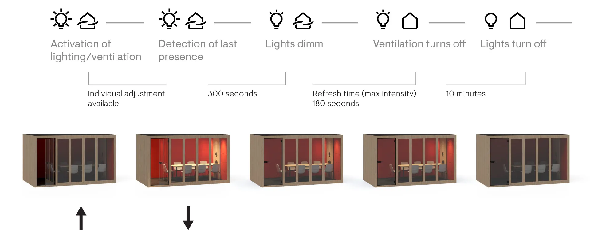 Kiitos SILENT ROOMin erikoissuunnittelun, oikea äänenabsorptiotaso taataan, mikä estää sekä sisään tulevat että ulos menevät äänet. Sisäiset akustiset seinät on suunniteltu eliminoimaan kaiku, luoden viihtyisän tunnelman. Huoneessa on neljä tehokasta mutta hiljaista tuuletinta, jotka yhdessä kolmen LED-lampun kanssa luovat lämpimän ja kutsuvan ilmapiirin, jossa voit keskittyä korkean konsentraation vaativiin tehtäviin. Älykäs ohjausyksikkö mukauttaa ilmanvaihtoa ja valaistusta tarpeidesi mukaan ja aktivoi tehokkaamman ilmanvaihdon, kun käyttäjä poistuu huoneesta, valmistautuen seuraavaa käyttäjää varten. Lisäksi, päällystetyt ulkoseinämallit on suunniteltu vaimentamaan melua entisestään, parantaen koko toimiston akustiikkaa.