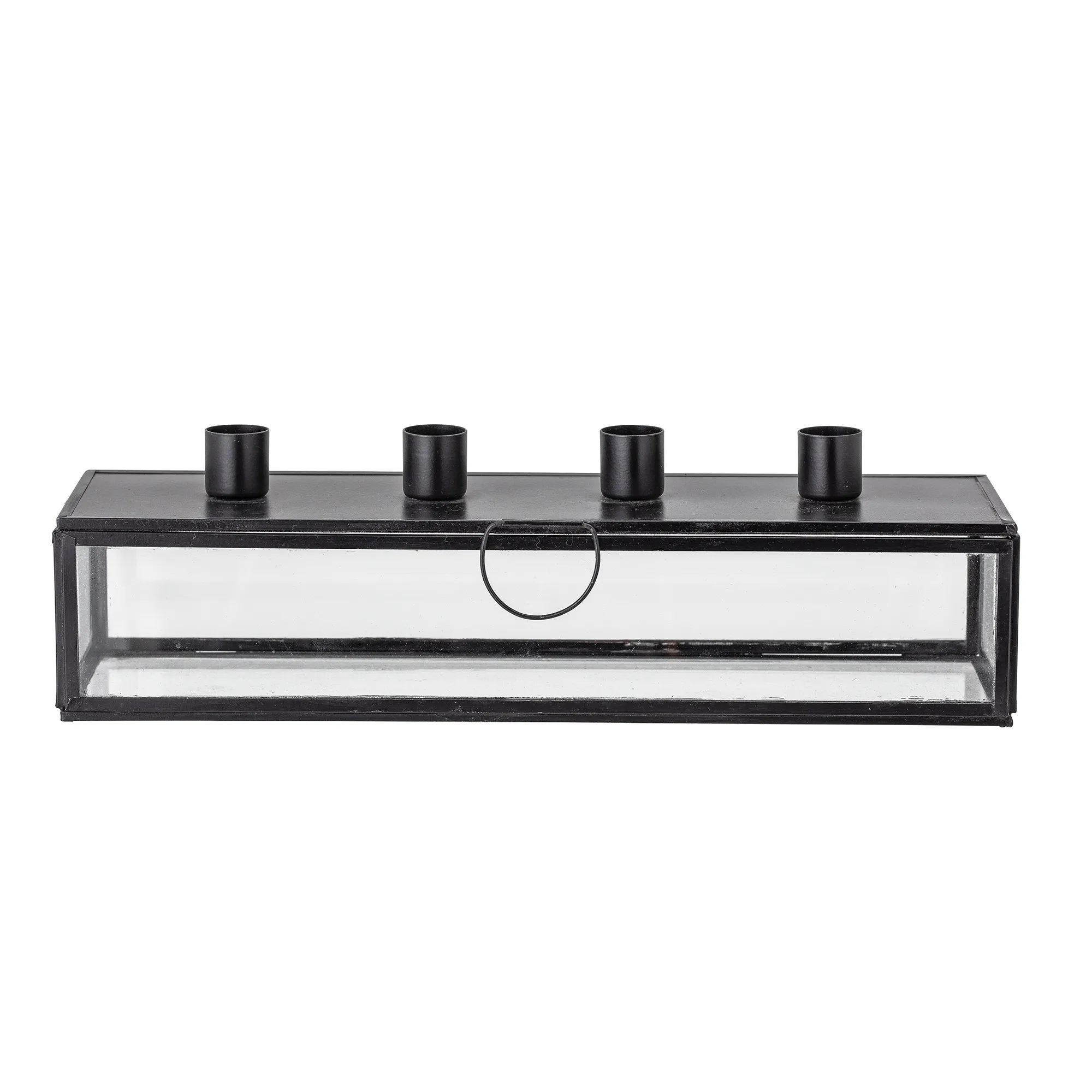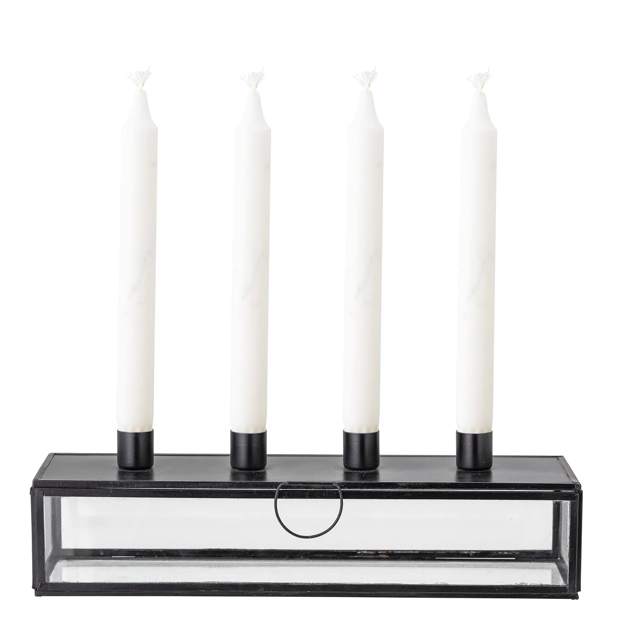 Bloomingvillen adventtikynttelikkö Pelo on mustaa metallia ja läpinäkyvää lasia. Tyylikäs sisustuselementti, joka levittää miellyttävän tunnelman joulukuussa. Täytä lasilaatikko kävyillä ja sammaleella tai jätä se tyhjäksi. Kynttilänjalkaa voidaan käyttää myös muina vuodenaikoina.