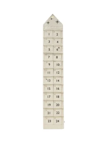 Ferm Livings joulukalenteri Star Christmasissa on 24 pientä kangastaskua pienille lahjoille. Herkkujen lisäksi voit myös antaa pieniä lahjoja. Kalenteri on pitkä, sekä kapea ja se sopiikin pienelle seinälle kuten kahden oven väliin jäävälle tilalle. Joulukalenteria on saatavilla tummanvihreä/kulta ja hiekka/musta värisinä.