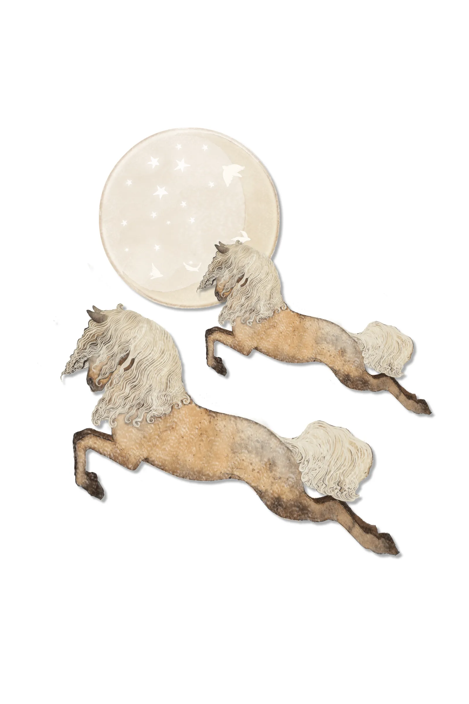Hevonen 1: 31 cm, hevonen 2: 27 cm ja kuu 16 cm