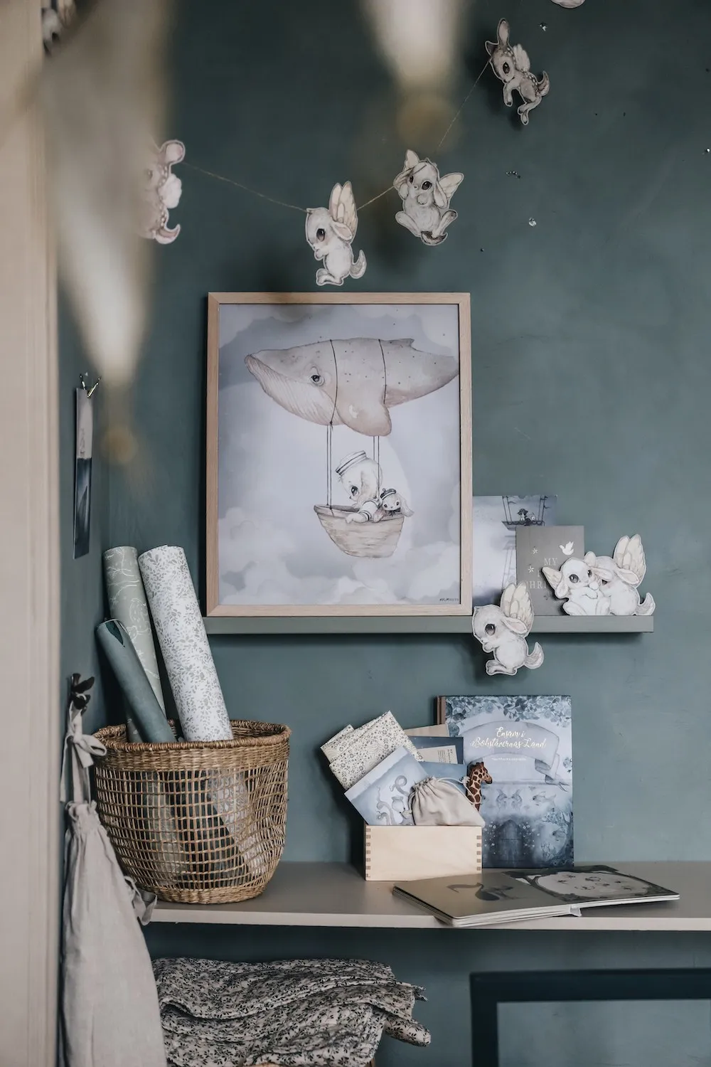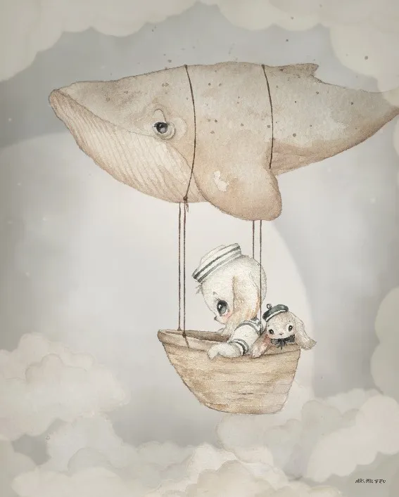 Mrs Mighetton supersuloinen lastenhuoneen juliste Flying Whale. Aseta ihana Flying Whale lastenhuoneen seinälle ja juliste piristää lastenhuonetta ihan uudella tavalla! Lasten juliste on myös hyvä syntymäpäivälahja!