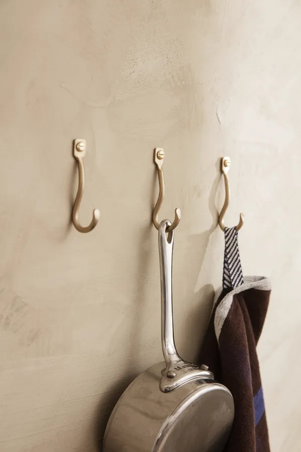 Ferm Livingin kauniit messinkiset Curvature koukut viimeistelevät kylpyhuoneen. Tuote on käsinvalmistettu ja uniikki. Myydään kolmen koukun setteinä.