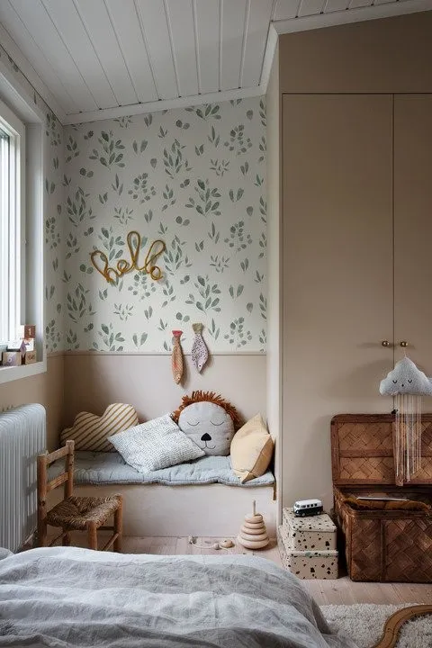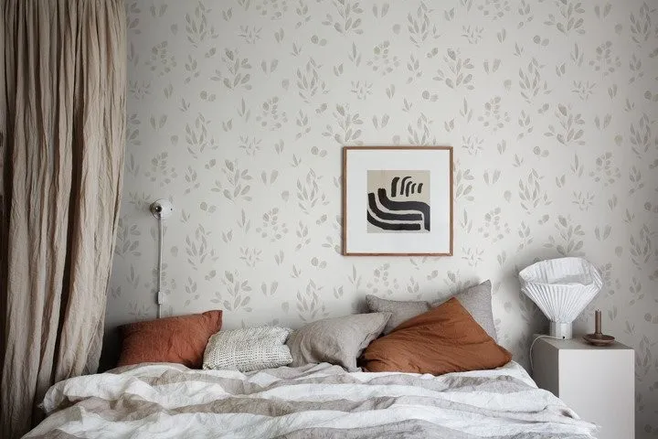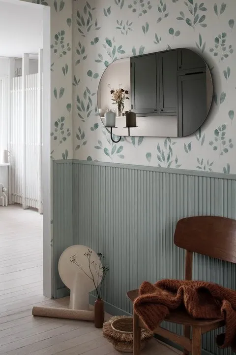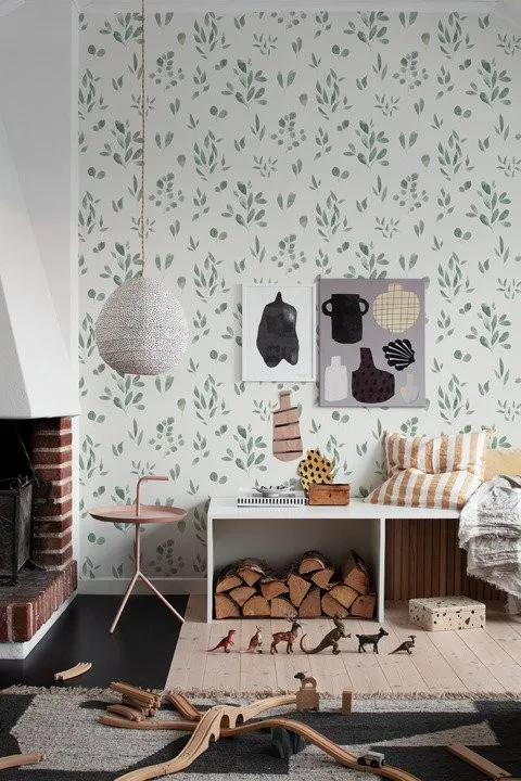 Sandbergin Belle-tapetin raikas lehtikuvio on kuin luontoa vesikuuron jälkeen. Hienovarainen tapetit sopii huoneeseen kuin huoneeseen.