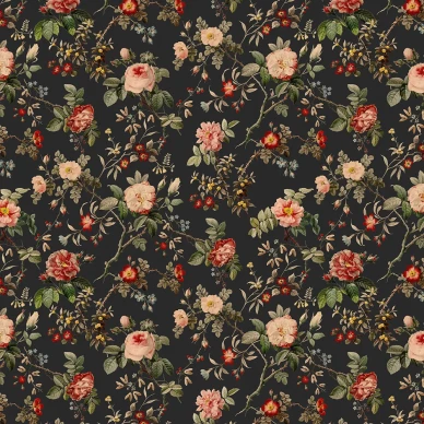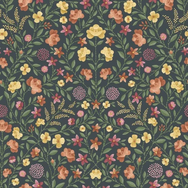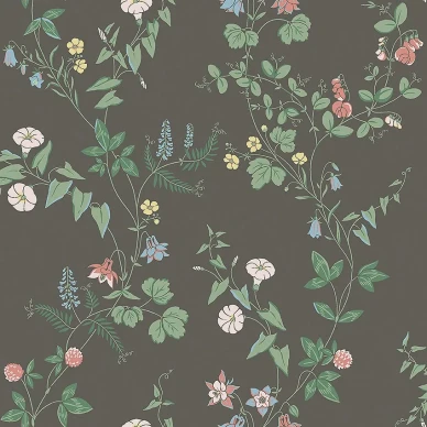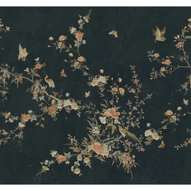 Blomslinga suurikuvioinen kukkatapetti vanhanaikaisella kuosilla. Elegantti tapetin kuvio on peräisin 1862 ja on sen ajan ylellinen kuvio.