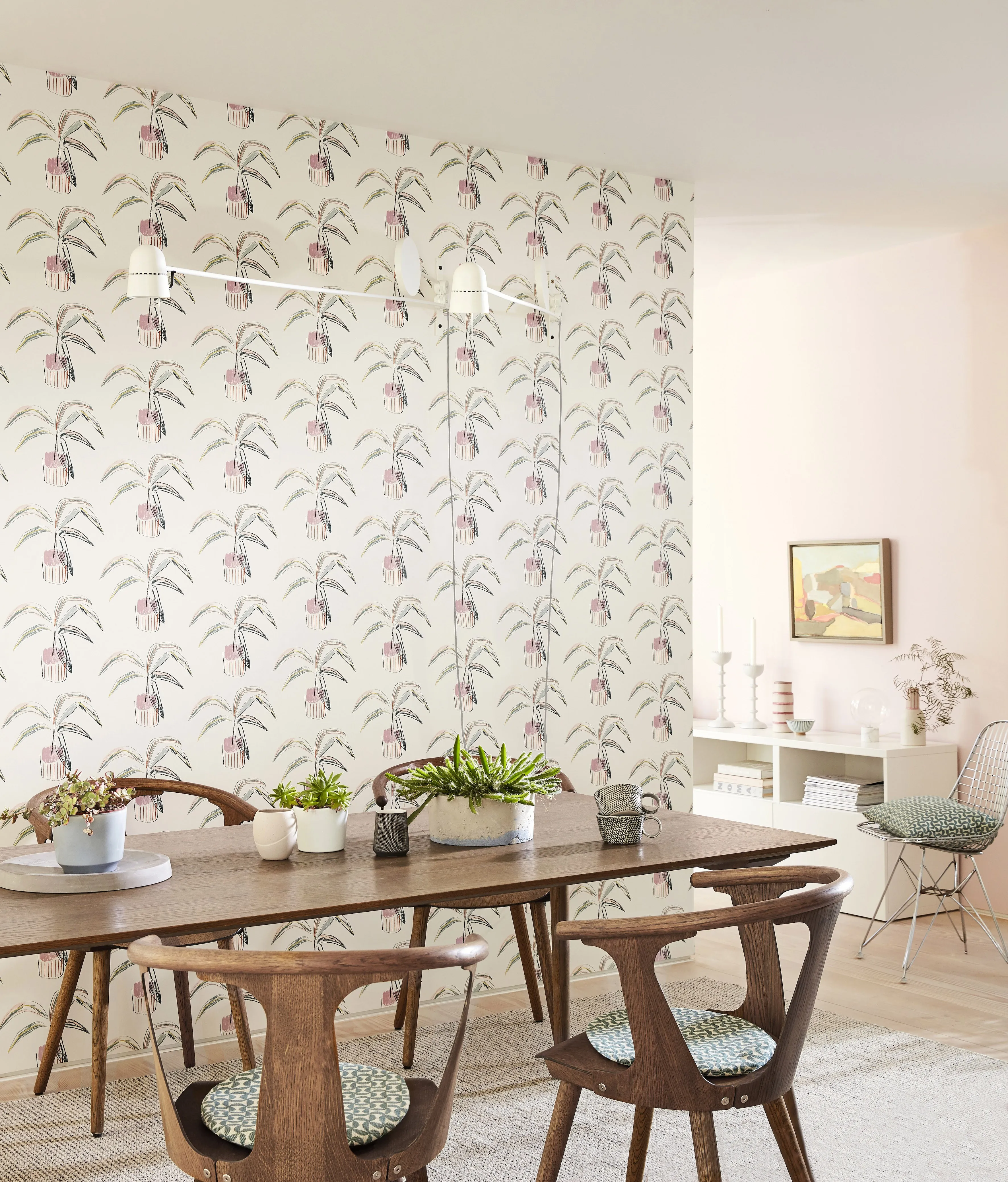 Crassula kavitapetti, jotka näyttää käsin piirretyiltä on trendikäs ja suosittu tapetti. Säännöllisesti kuvioitu tapetti toimii hyvin esimerkiksi ruokasalissa. Neljä värivaihtoehtoa.