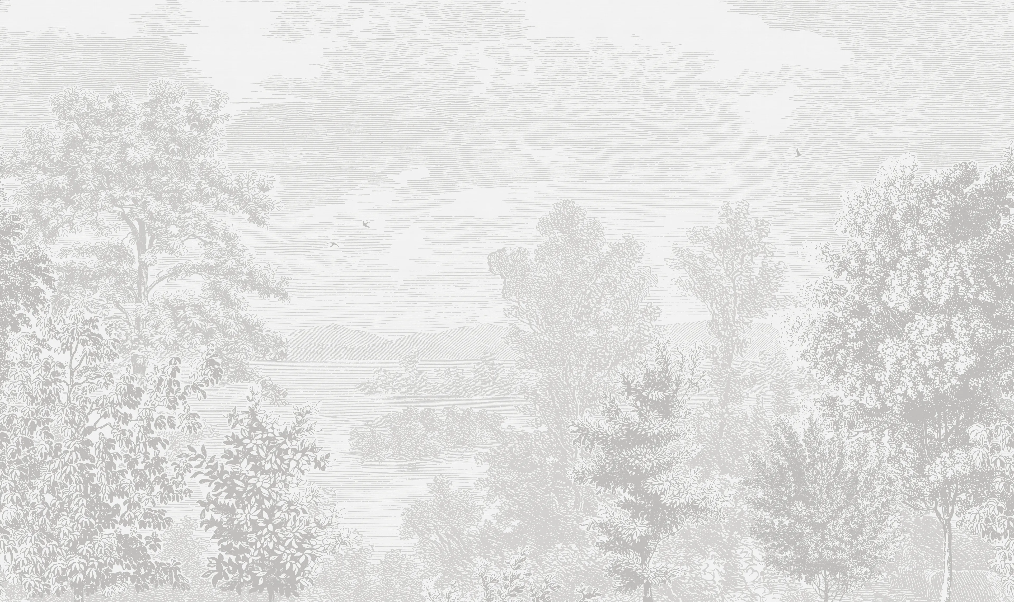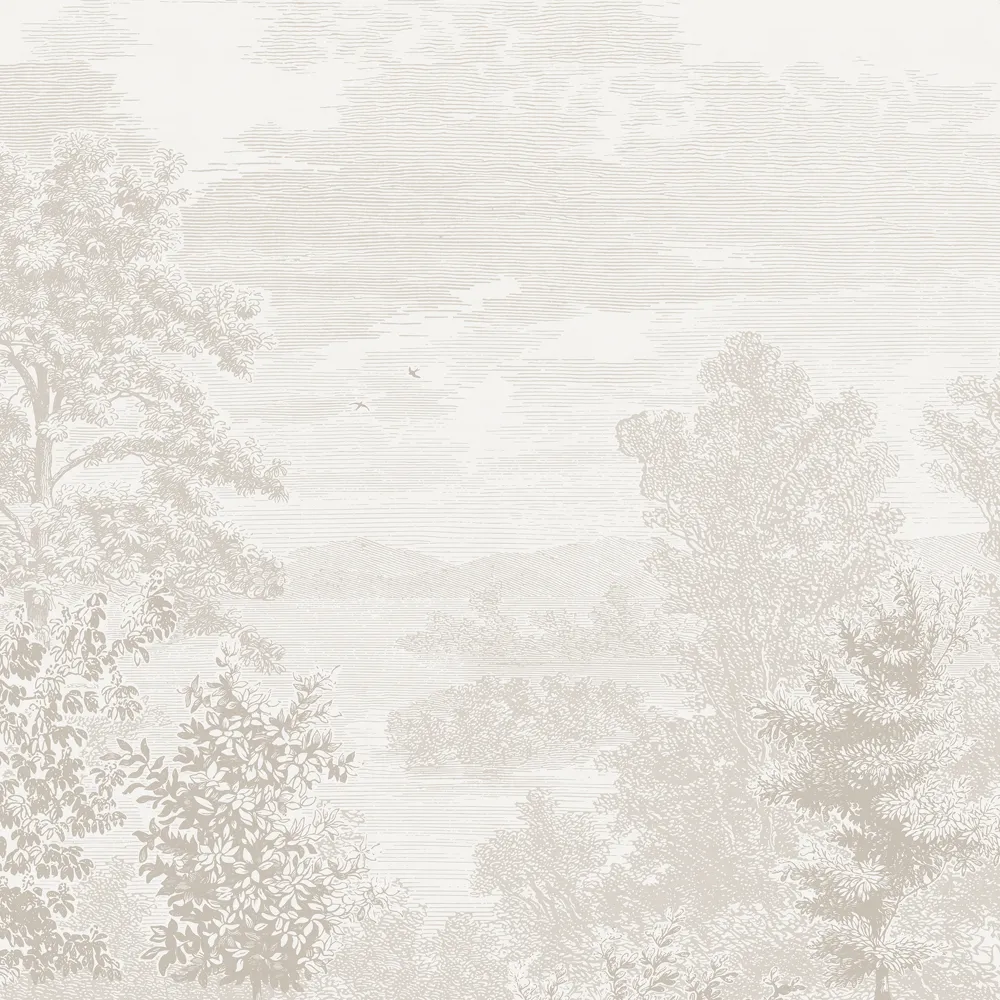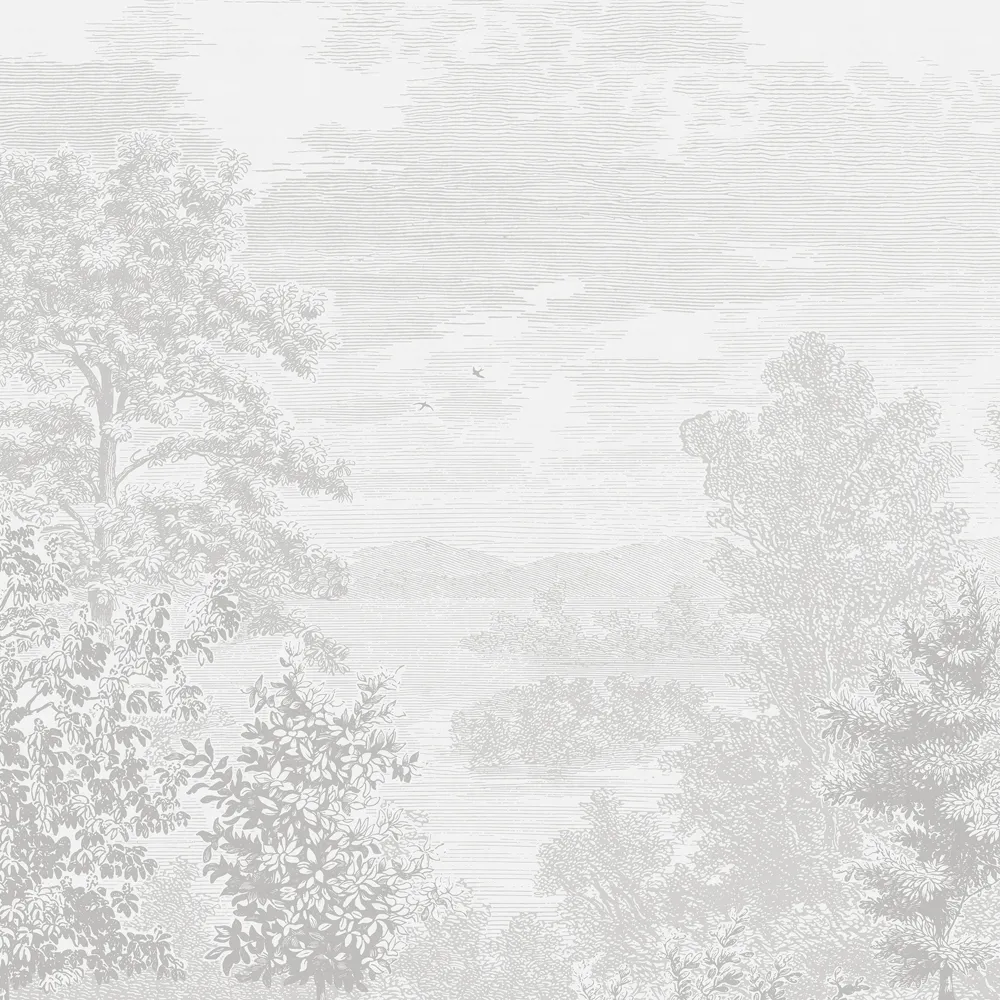Etched Landscape maisematapetti on suurikokoinen ja siinä on syvyyttä. Skandinaavinen luontoaiheinen tapetti jäljittelee etsausta. Kaunis tapetti makuuhuoneeseen, olohuoneeseen tai nuorenhuoneeseen.