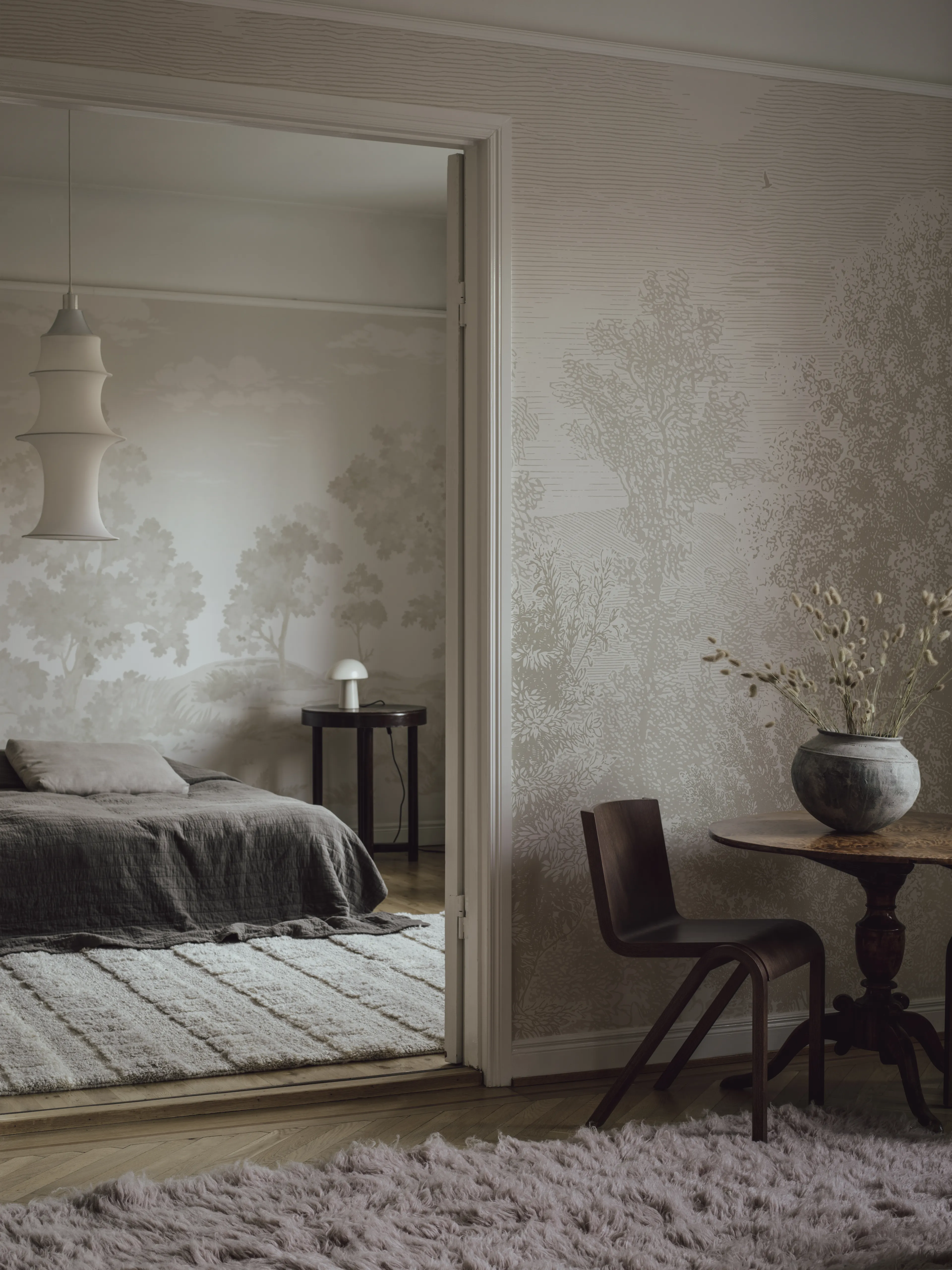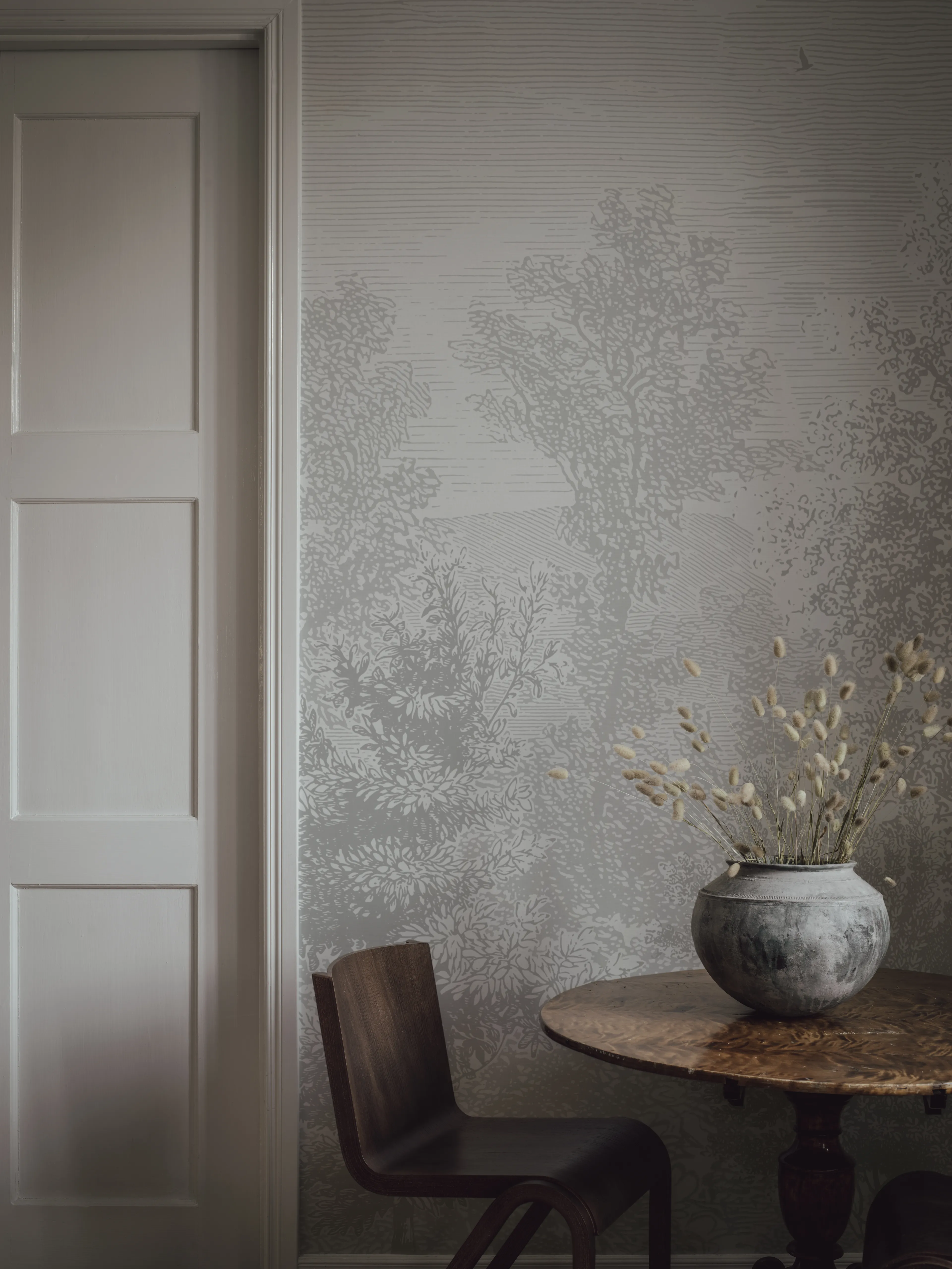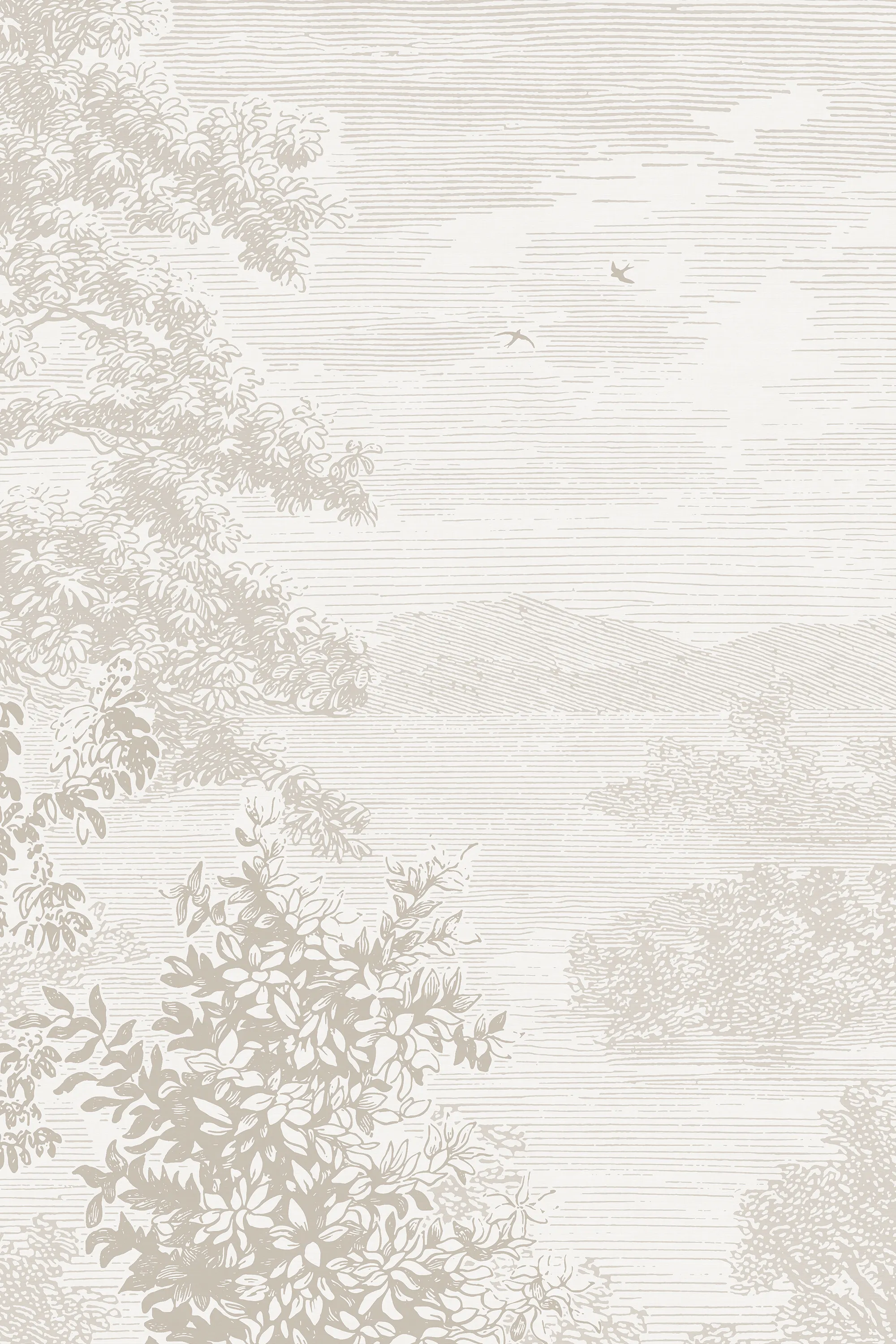 Etched Landscape maisematapetti on suurikokoinen ja siinä on syvyyttä. Skandinaavinen luontoaiheinen tapetti jäljittelee etsausta. Kaunis tapetti makuuhuoneeseen, olohuoneeseen tai nuorenhuoneeseen.