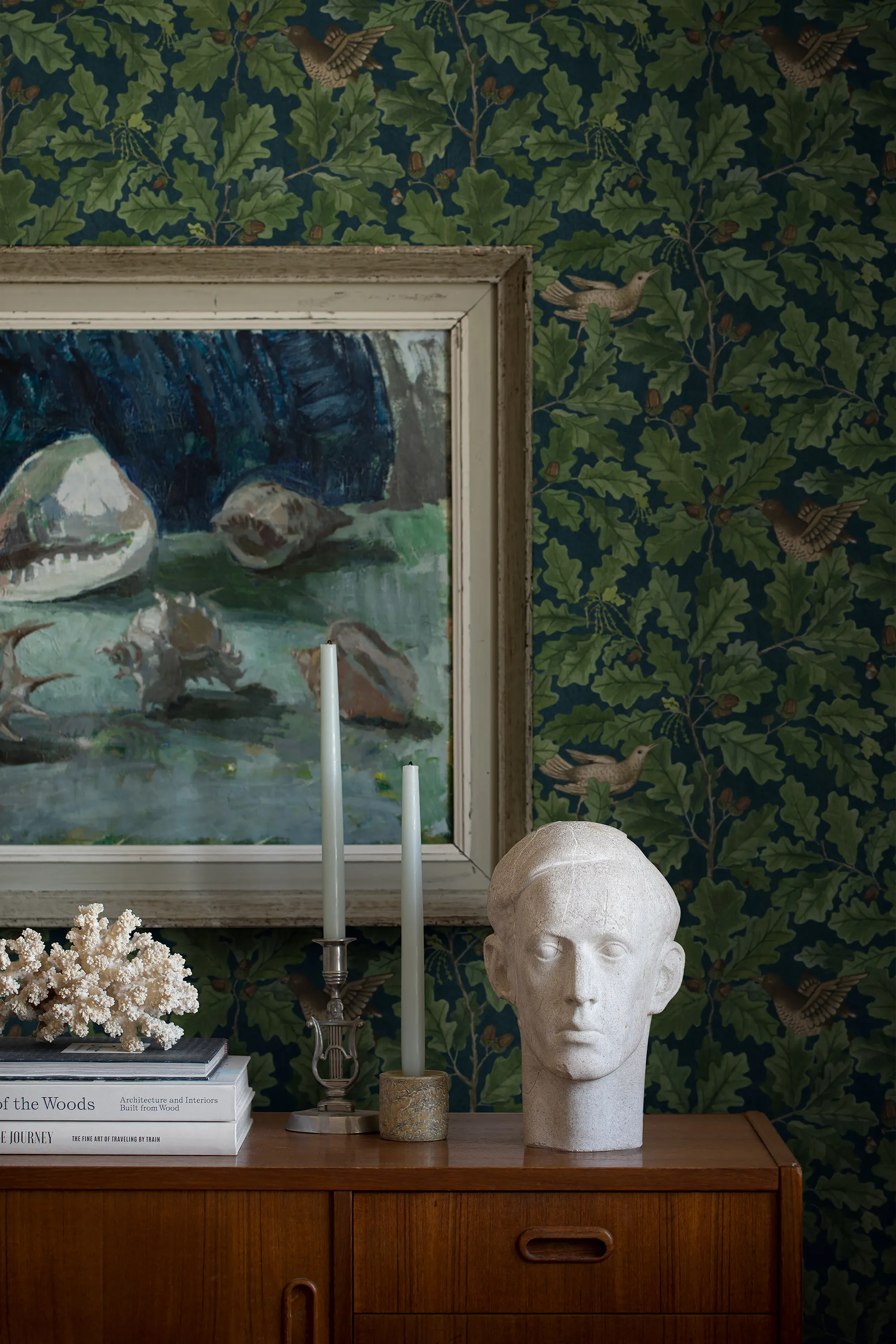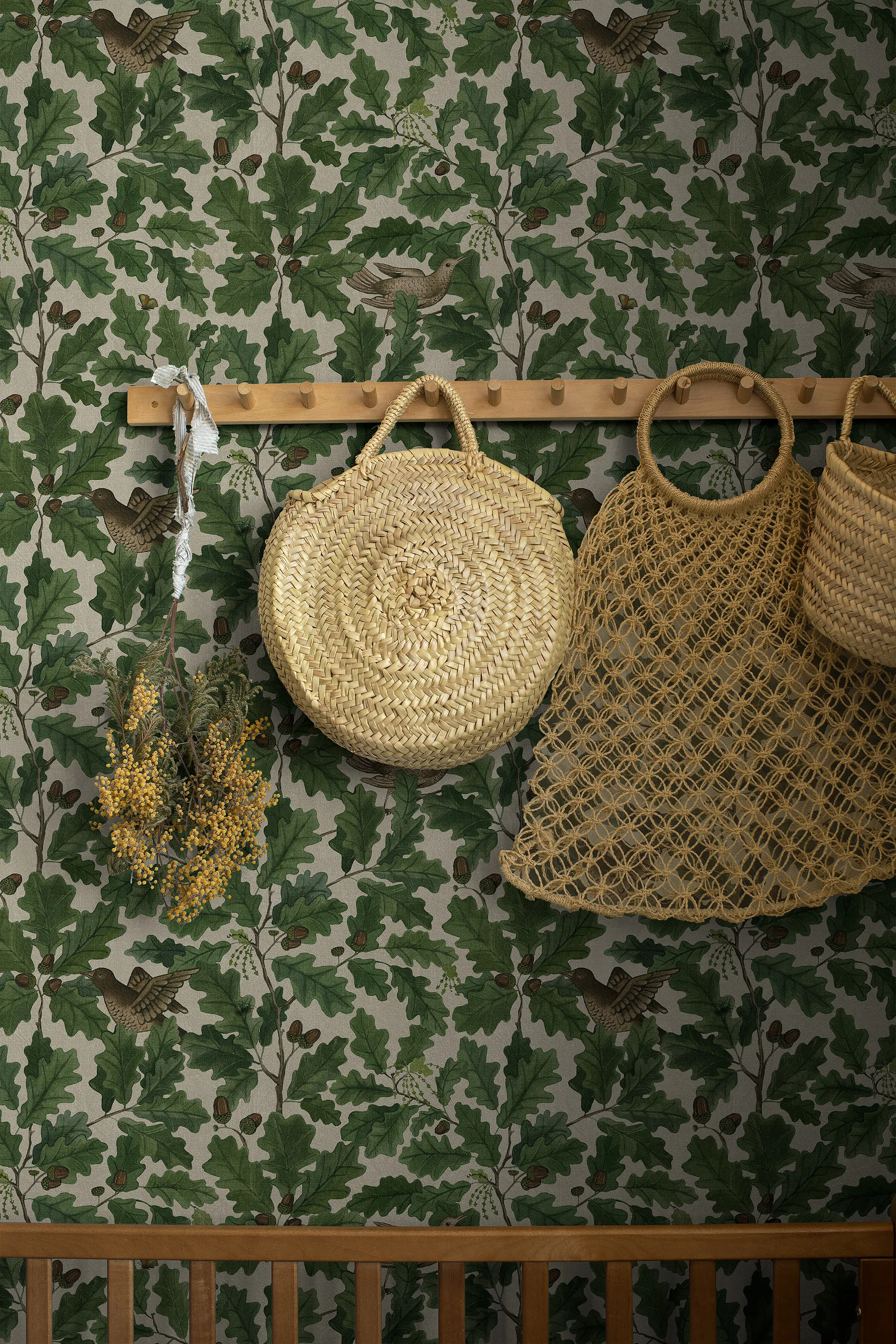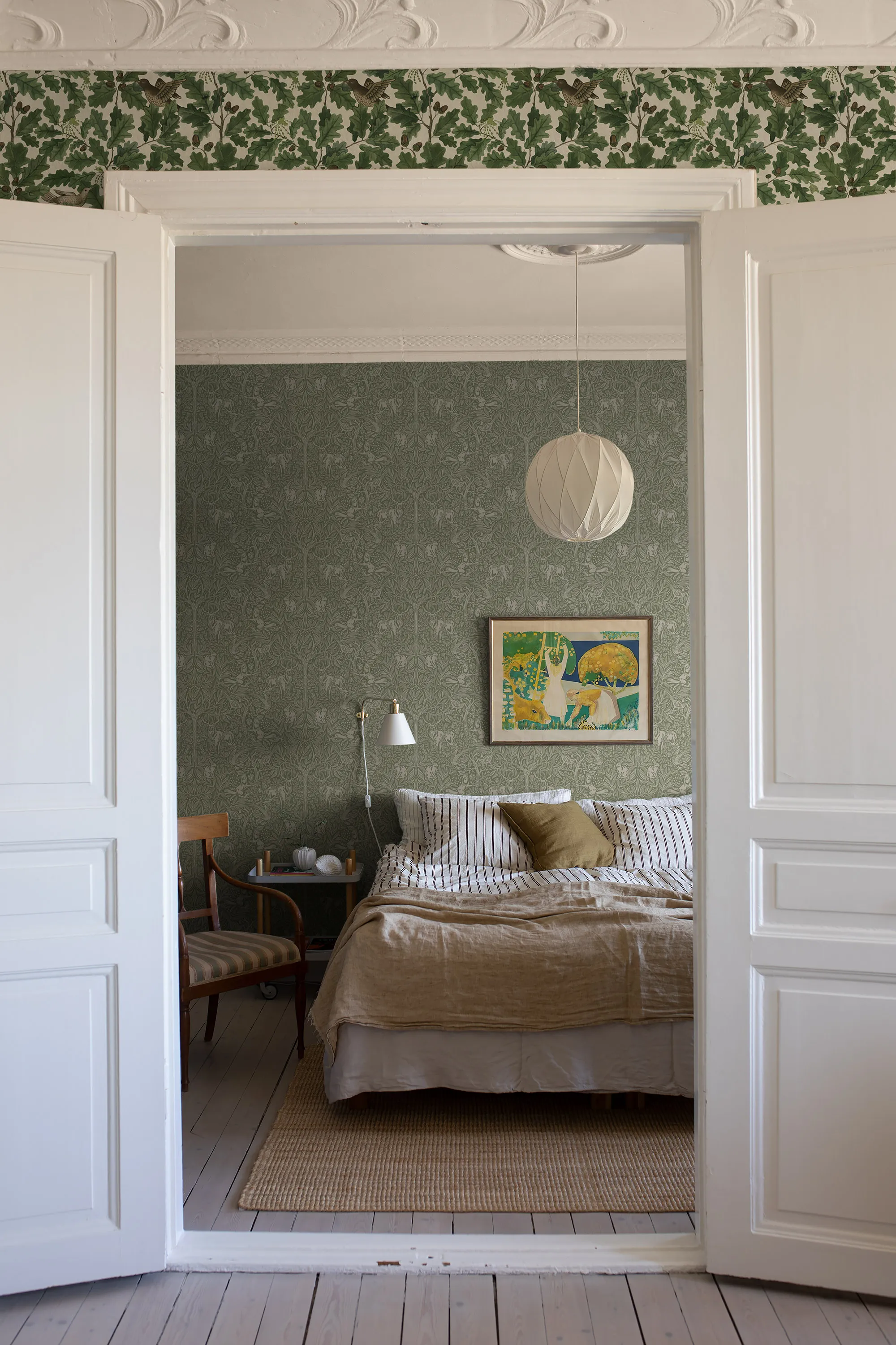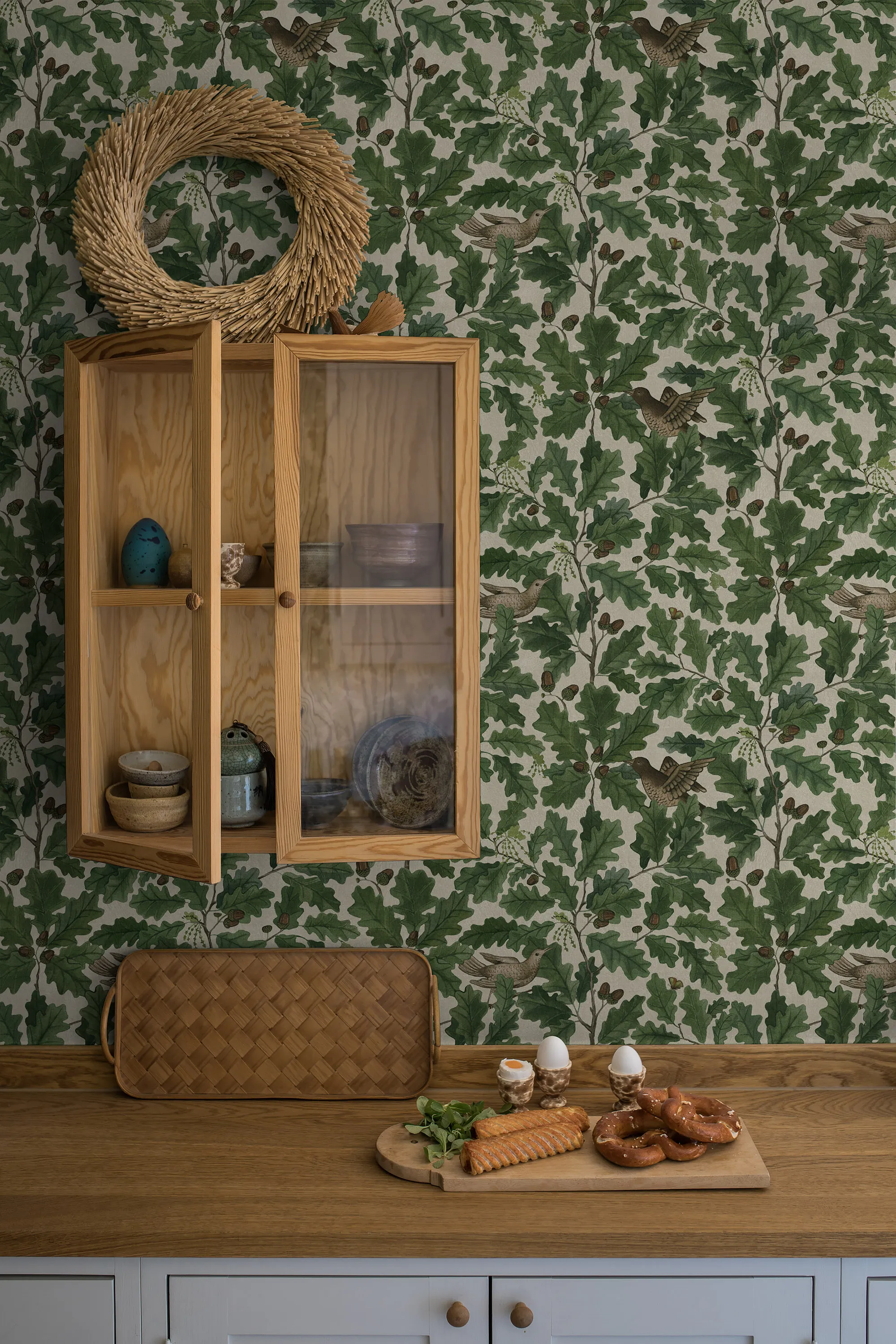 Lehtitapetti In The Oak, jossa on lintuja ja hyönteisiä tiheiden tammenlehtien keskellä, viestii elinvoimaisuudesta ja on lähellä luontoa. Tapetin on suunnitellut Sissa Sundling.