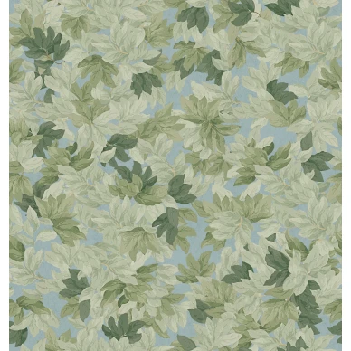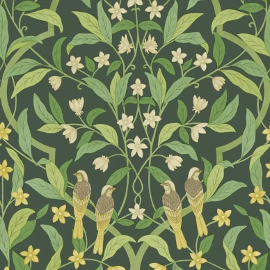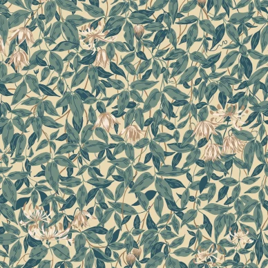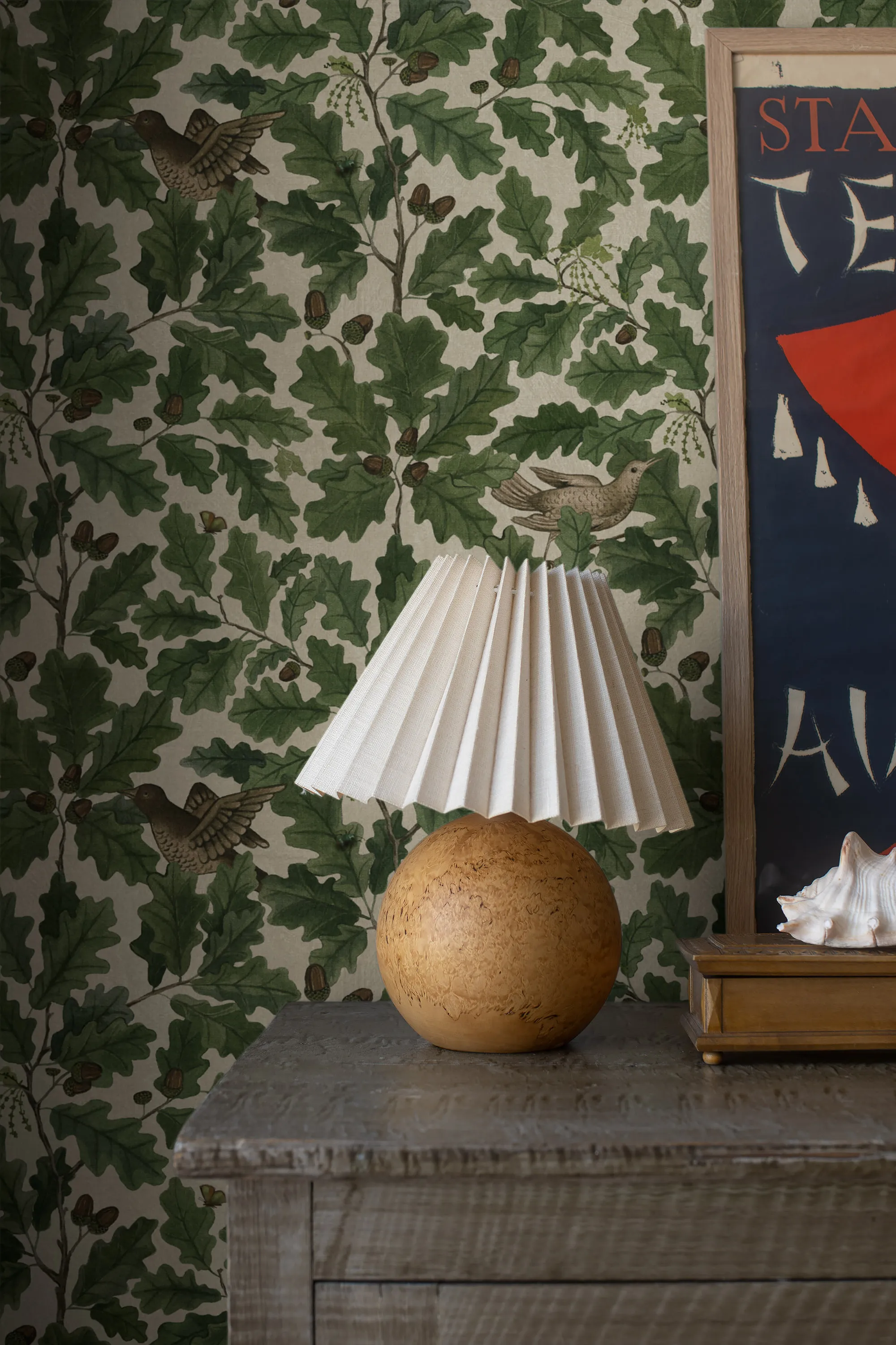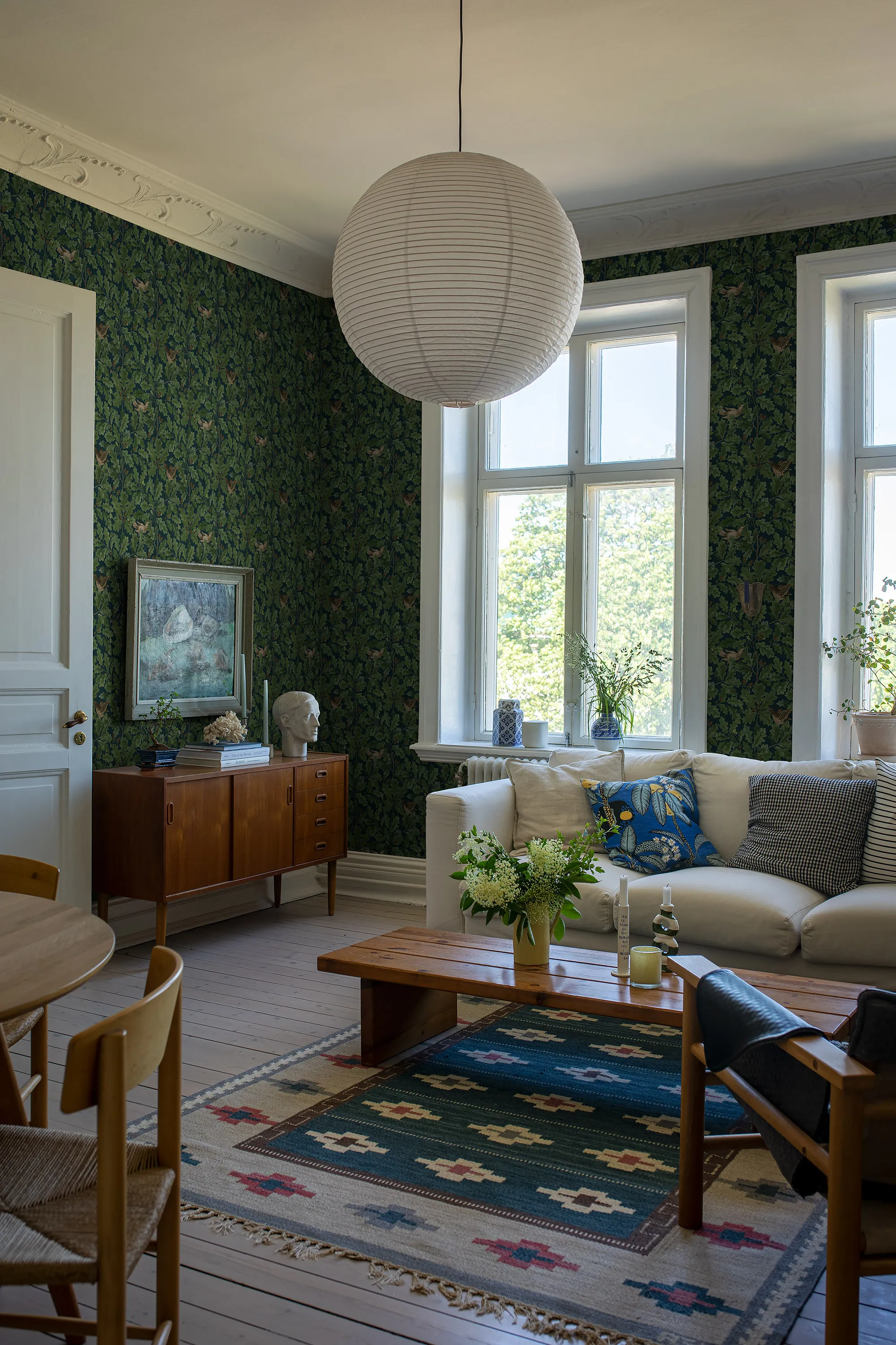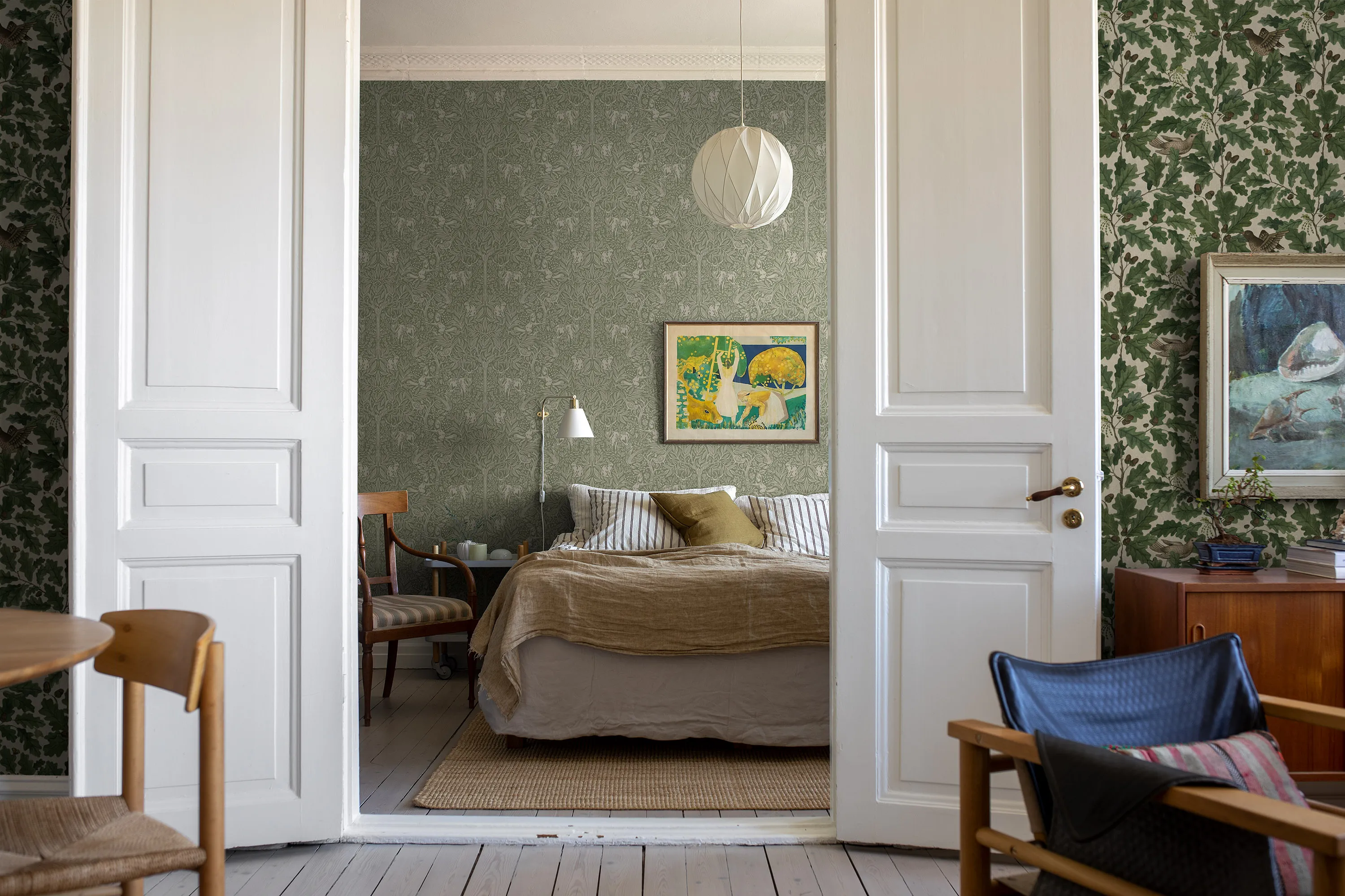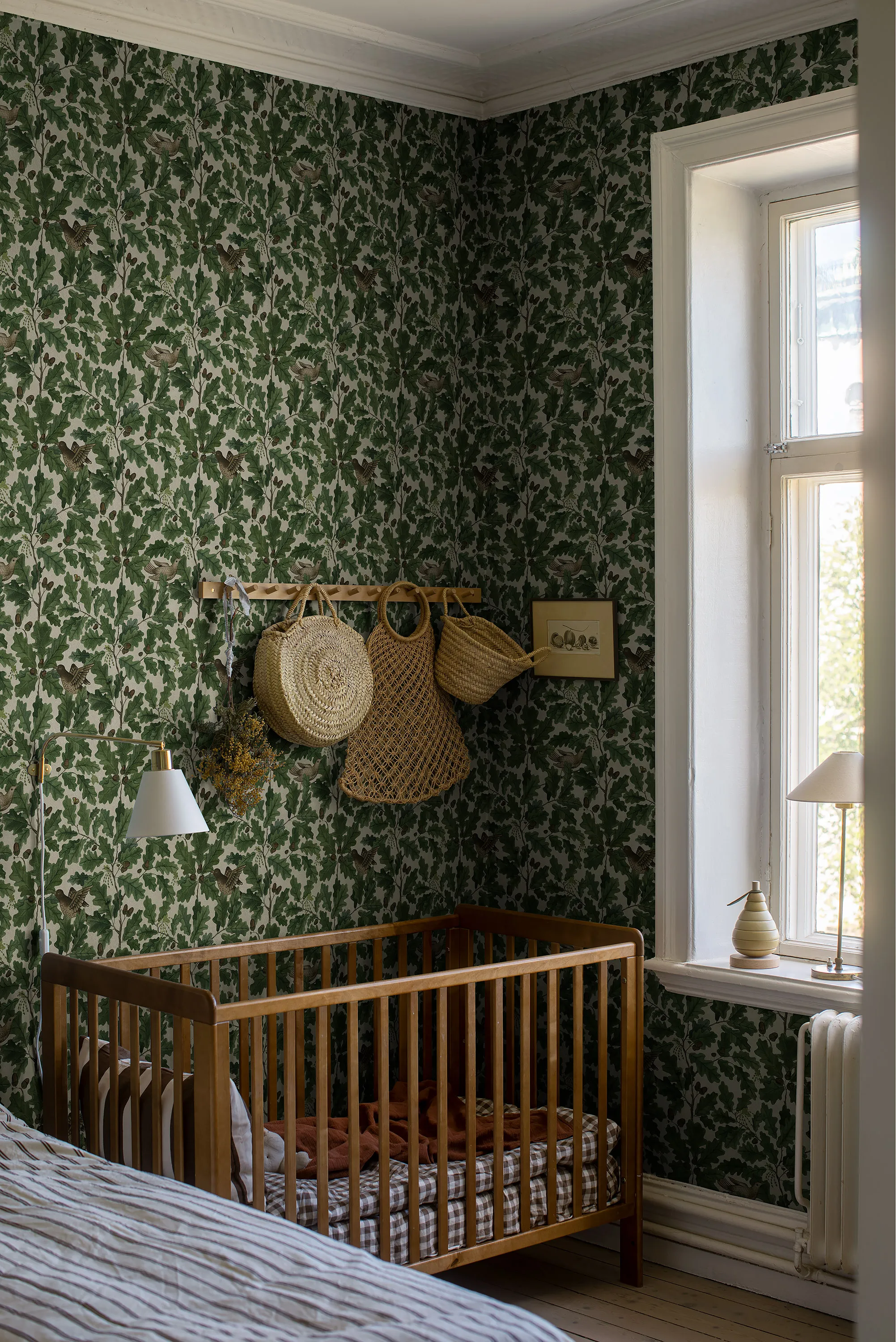 Lehtitapetti In The Oak, jossa on lintuja ja hyönteisiä tiheiden tammenlehtien keskellä, viestii elinvoimaisuudesta ja on lähellä luontoa. Tapetin on suunnitellut Sissa Sundling.