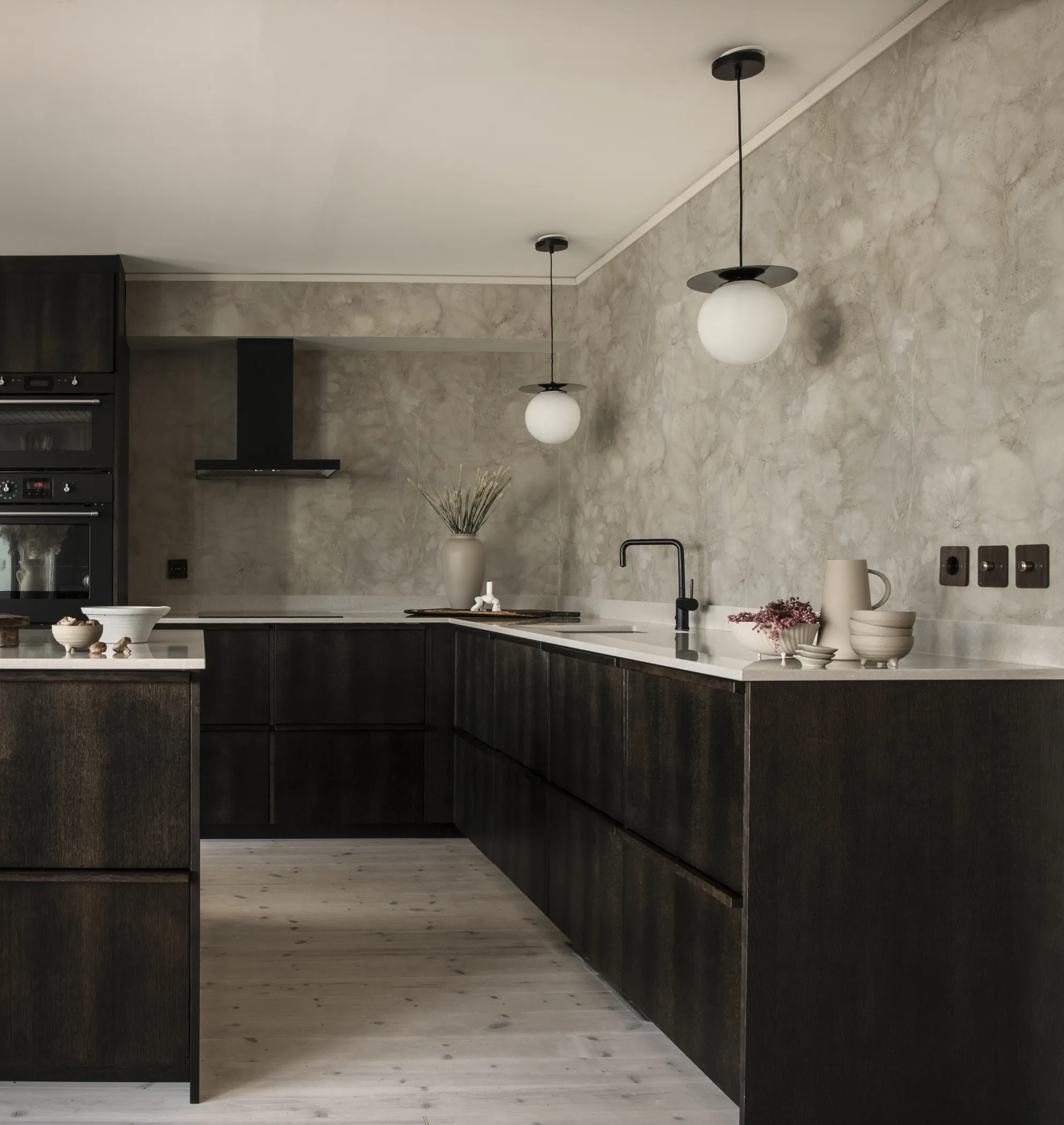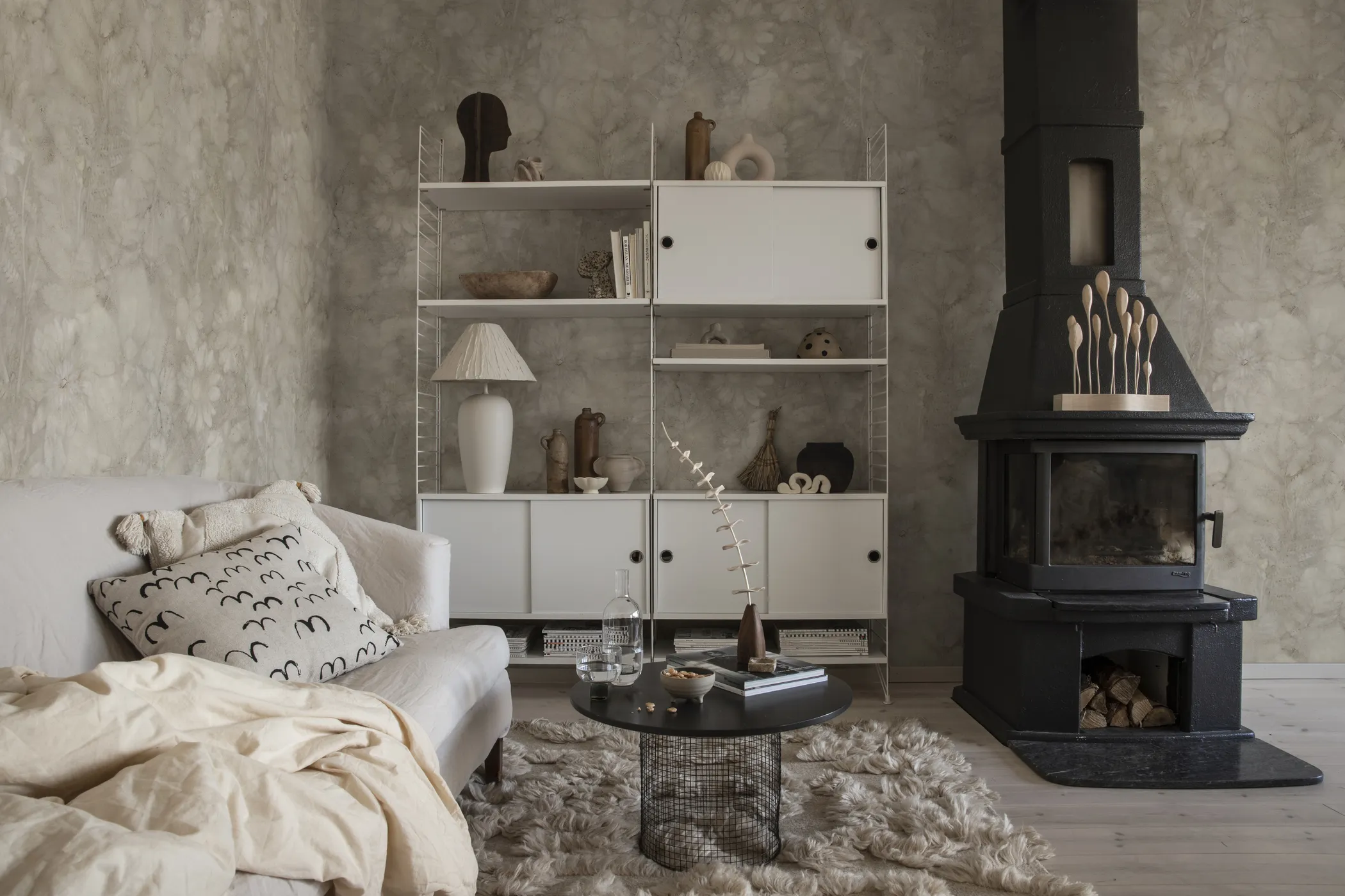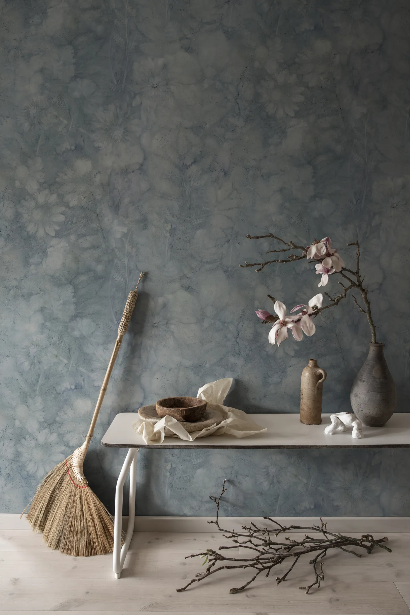 Sandbergin Monica tapetissa on suuri kukkakuvio. Kuvion loi taiteilija Monica Andoff, joka kokeili kasvien värjäystä paperille. Moderni ja unenomainen tapetti makuuhuoneeseen, olohuoneeseen, keittiöön tai ruokasaliin.