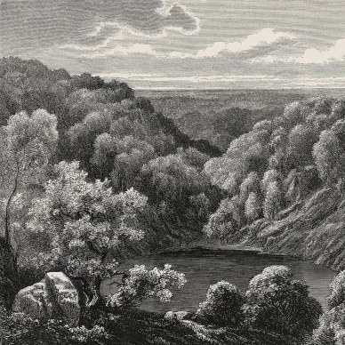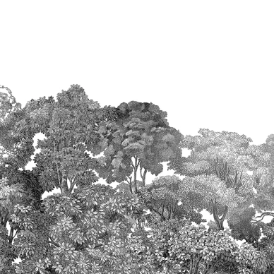 Muraltapetti Oak View kuvaa suurta metsää, ehkä se näytti tältä Löfstadin linnan ympärillä Emilie Piperin aikaan. Tapetti on rauhallinen, mutta elinvoimainen.