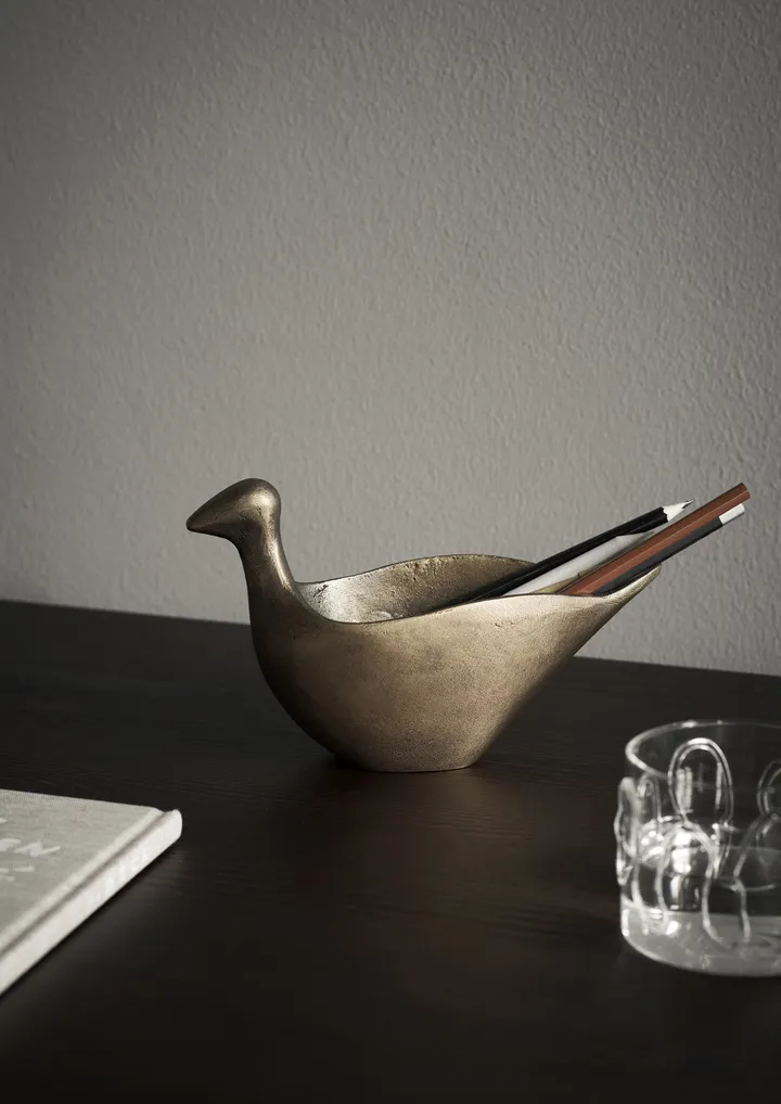 Coot Kynäteline yhdistää vaivattomasti käytännöllisyyden ja esteettisen vetovoiman. Valmistettu kierrätetystä valualumiinista, sen ylellinen patinoitu viimeistely ammentaa inspiraationsa antiikkikalusteista. Käytä sitä pitämään kynät, lyijykynät ja muut toimistotarvikkeet järjestyksessä työpöydälläsi, tai esittele sitä veistoksellisena esineenä pöydällä, hyllyllä tai ikkunalaudalla. Coot Kynäteline ei ole ainoastaan toiminnallinen lisä työtilaasi, vaan myös tyylikäs koriste, joka kohottaa minkä tahansa huoneen ilmettä