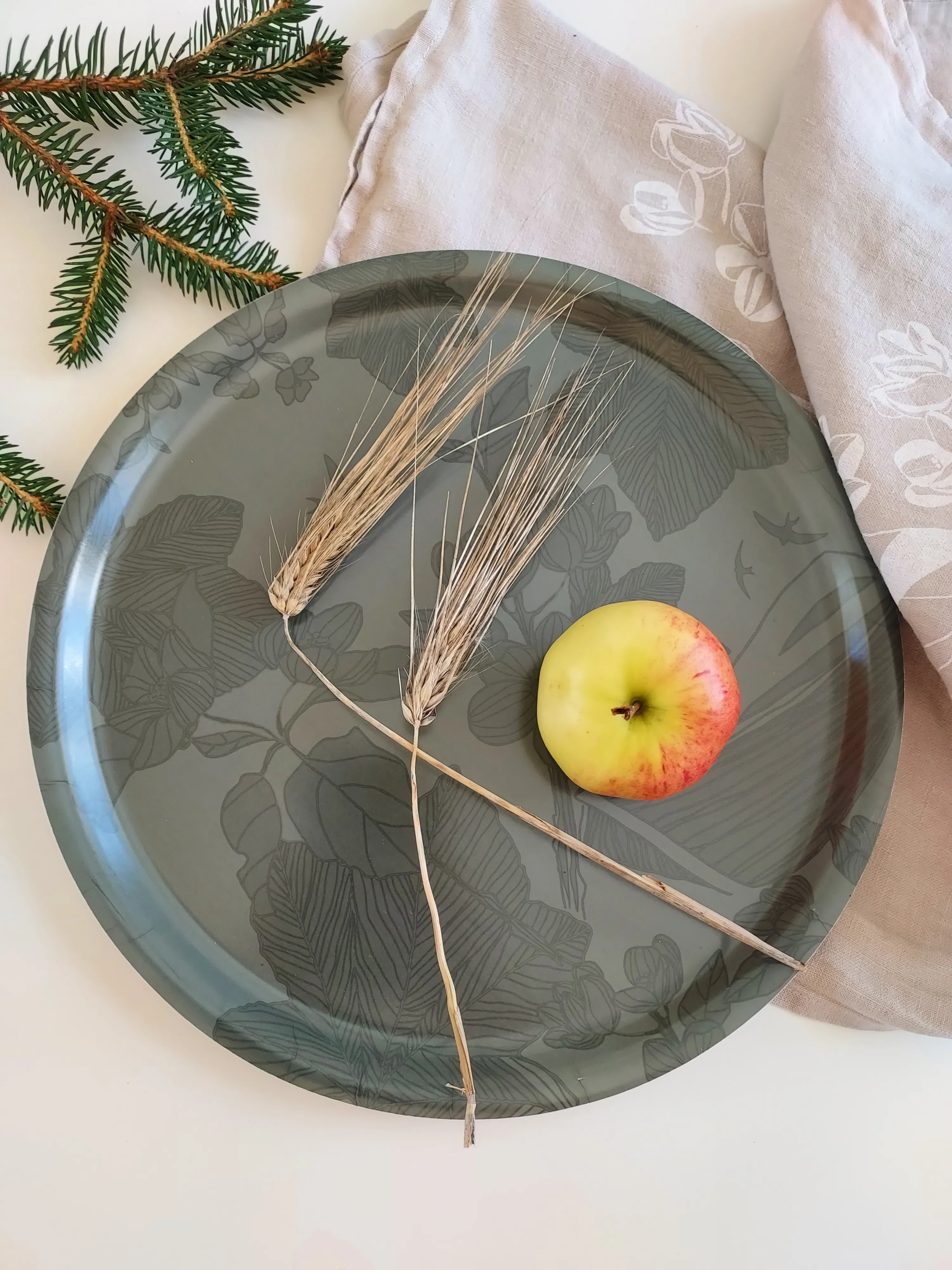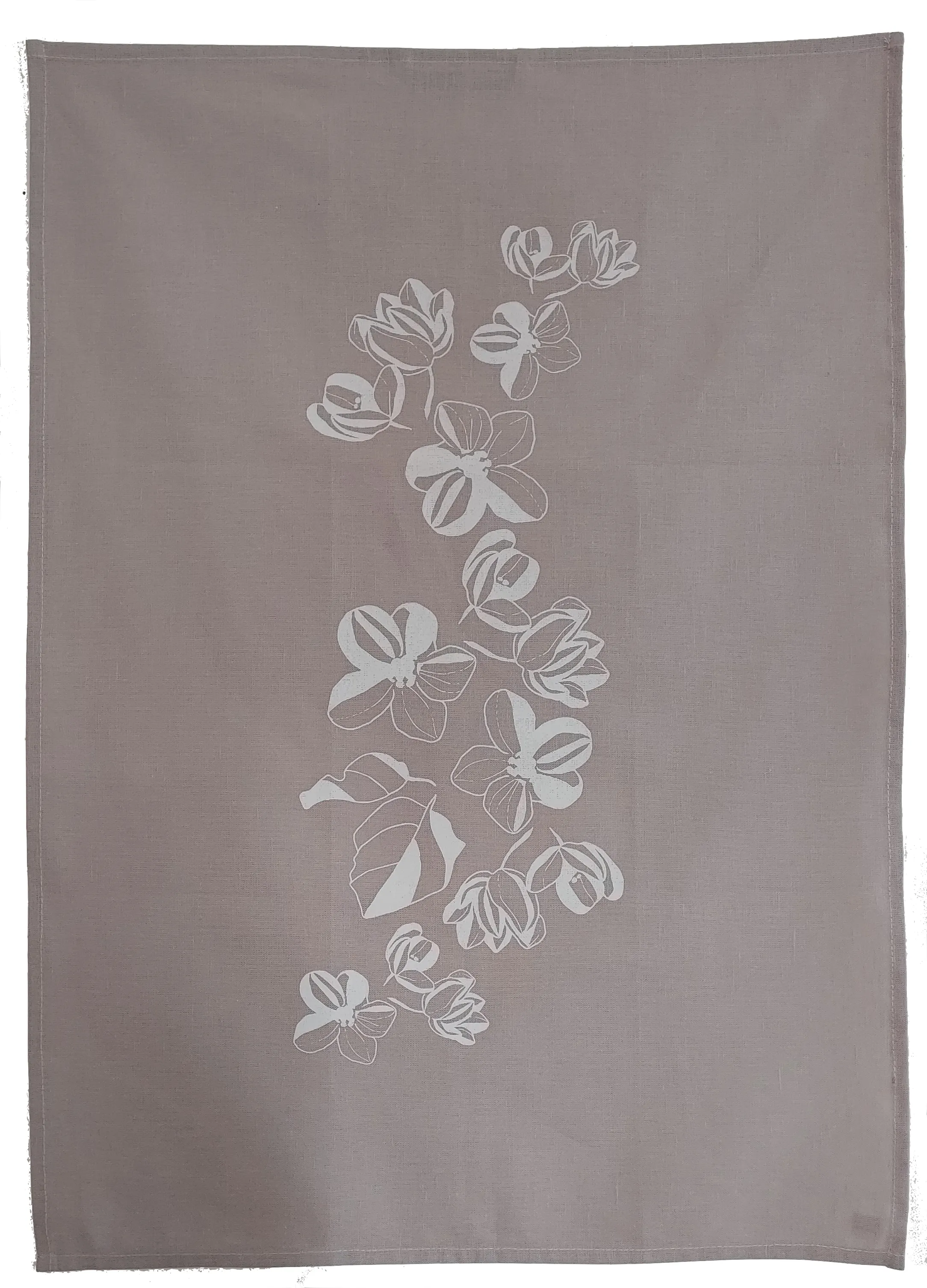Lämminharmaa Omenankukka keittiöpyyhe sopii hyvin ruosteenruskean, salviavihreän ja usvansinisen Pohjanmaa-tarjottimien kanssa. Se sopii myös Johanna-tarjottimen kanssa, jossa on omenankukkia. Pyyhetttä voi käyttää kaikkina vuodenaikoina niin jouluna kuin kesä-aikaankin. Omenakukkien kuviointi on saanut inspiraationsa muista Pohjanmaan-tarjottimista.