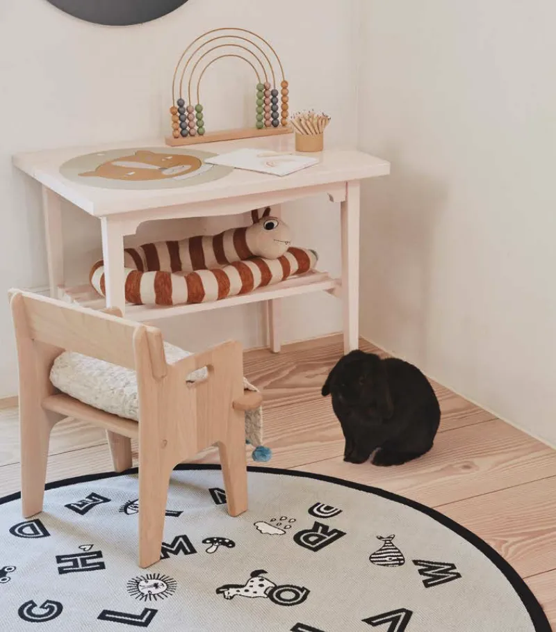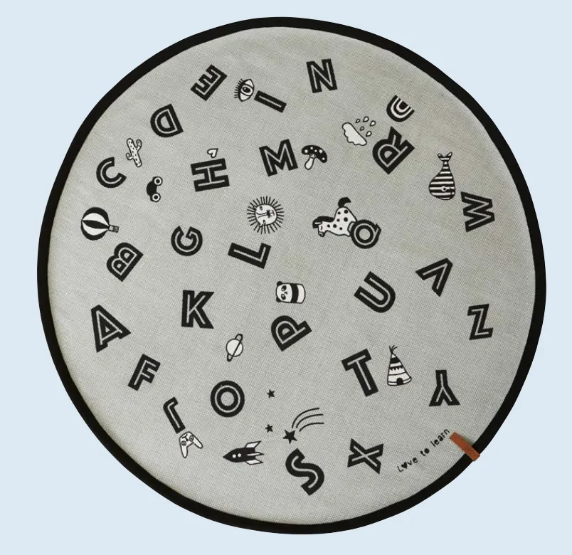 OYOY harmaa pyöreä matto lastenhuoneeseen hauskalla kirjain kuvionnilla.