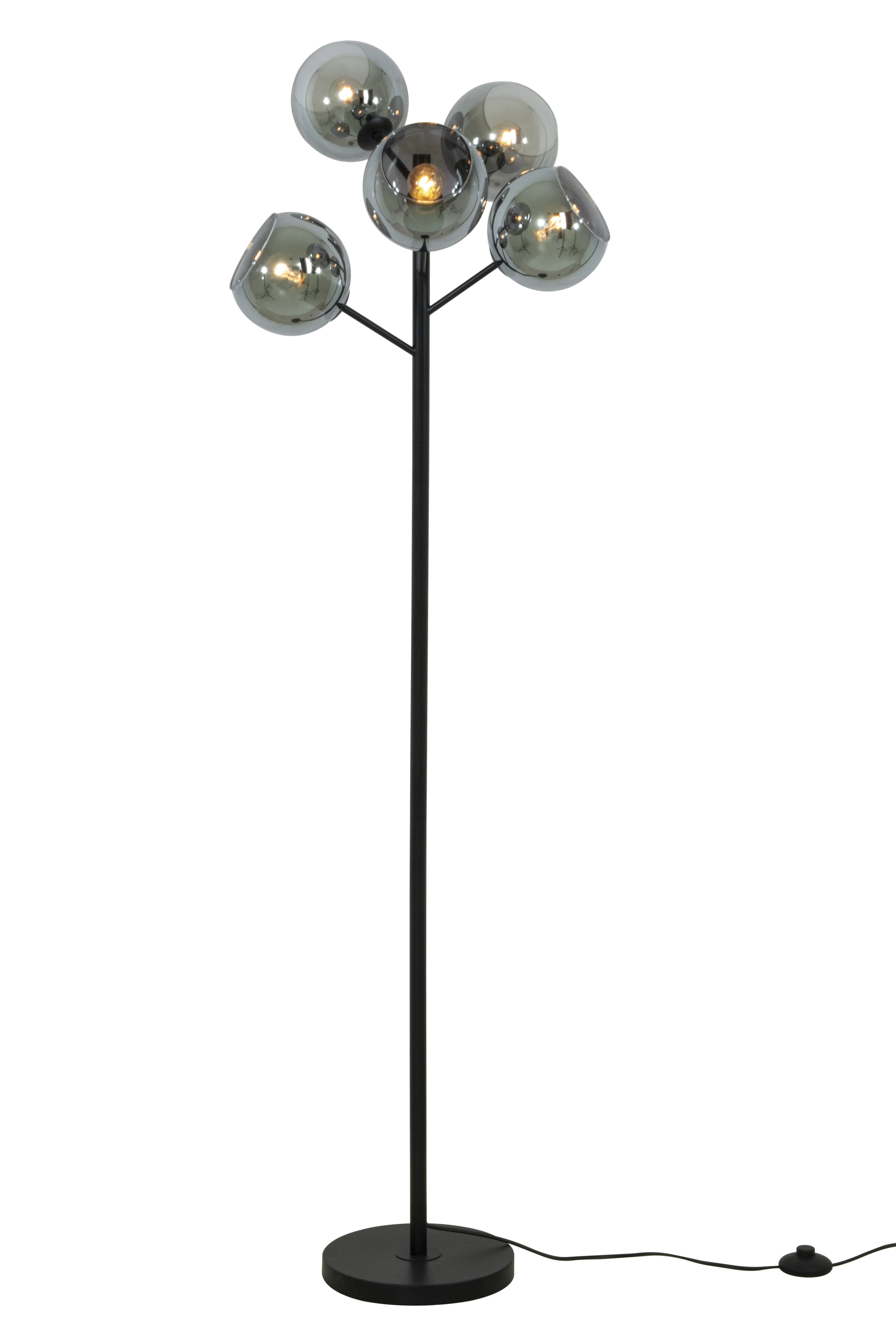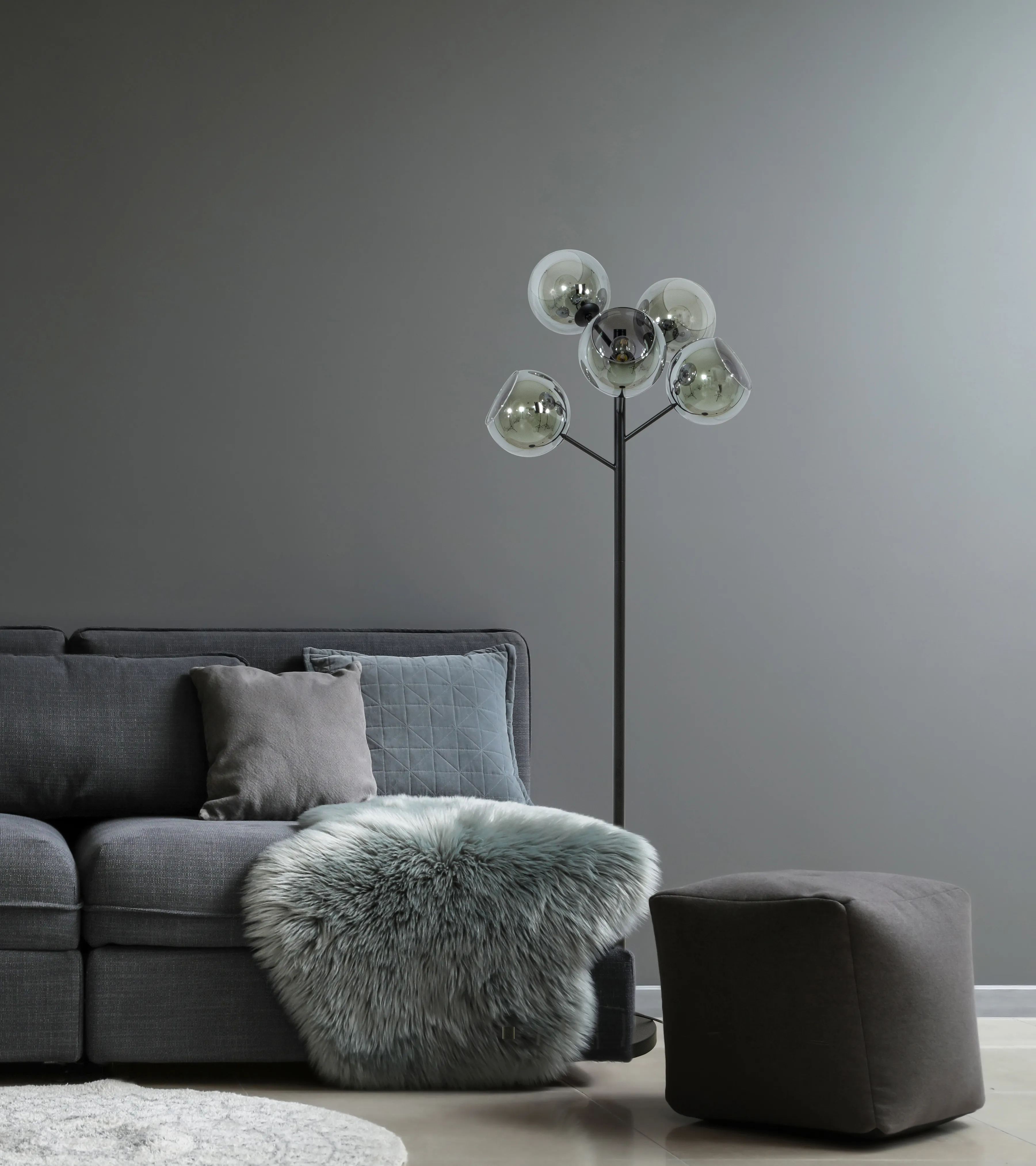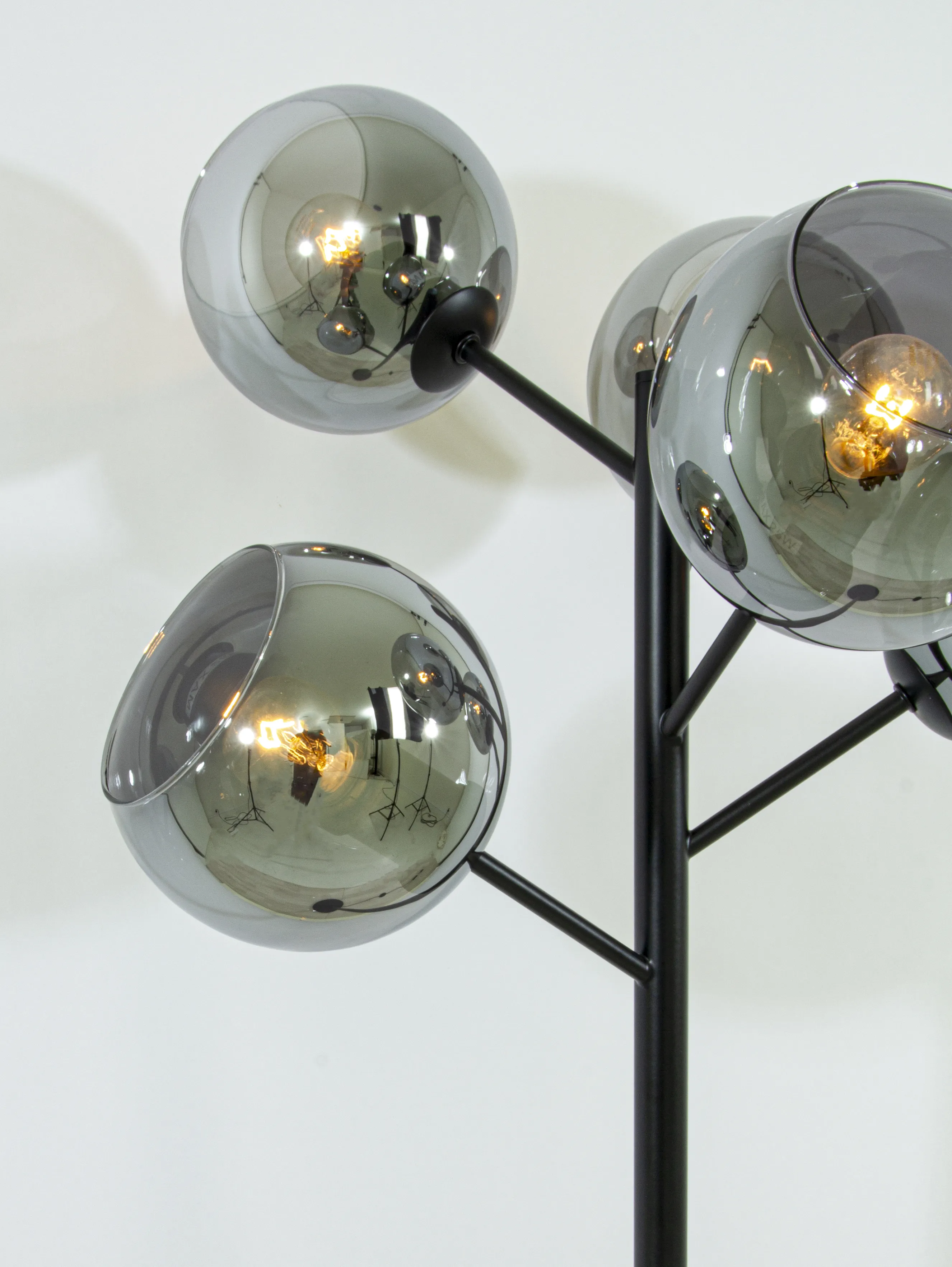 Moderni lattiavalasin Atom viidellä savunharmaalla lasikuvulla epäsymmetrisessä järjestyksessä on kaunis ja erityinen. Kaunis valaisin, joka on jo itsessään katseenvangitsija.
