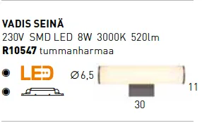 Vadis on ulkoseinävalaisin sisäänrakennetulla LED-tekniikalla. Varjostin himmeää polykarbonaattia. Valaisin sopii esimerkiksi käytävävalaisimena tai portaiden valaisimena.